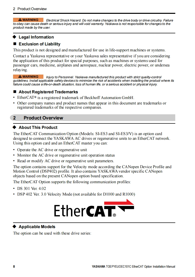 YASKAWA-安川TOEP-YEUOEC1-01C_SI-ES3_EtherCAT_IM安装调试说明书手册找手册网29天前发布关注私信5.43MB46页026YASKAWA-安川TOEP-YEUOEC1-01C_SI-ES3_EtherCAT_IM安装调试说明书手册此内容为付费资源,请付费后查看¥19¥21黄金会员免费钻石会员免费登录购买付费资源 第1页 / 共46页 第2页 / 共46页 第3页 / 共46页 第4页 / 共46页 第5页 / 共46页 第6页 / 共46页 第7页 / 共46页 第8页 / 共46页 第9页 / 共46页 第10页 / 共46页 试读已结束,还剩36页,您可下载完整版后进行离线阅读 THE END安川电机 文本预览 YASKAWAEtherCAT OptionOptions Card for AC Drives and Regenerative UnitsInstallation ManualType:SI-ES3SI-ES3/V88 查看更多 收起部分 喜欢就支持一下吧收藏