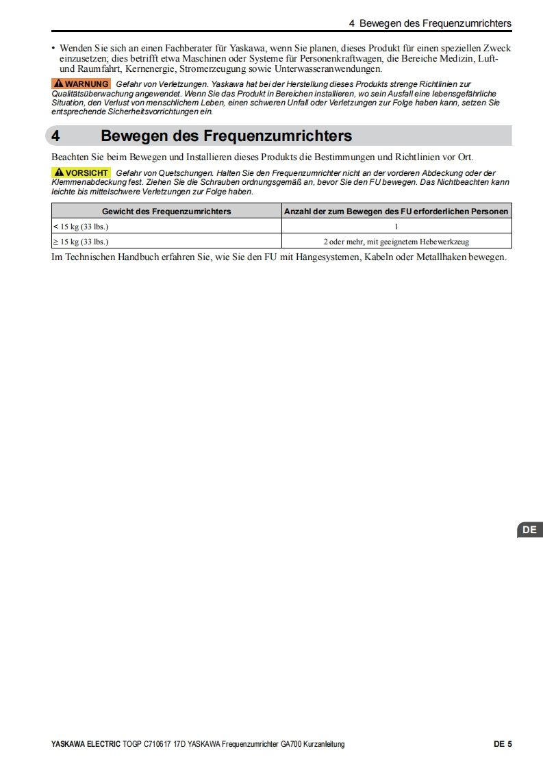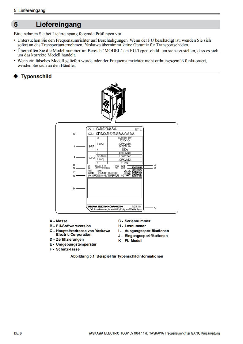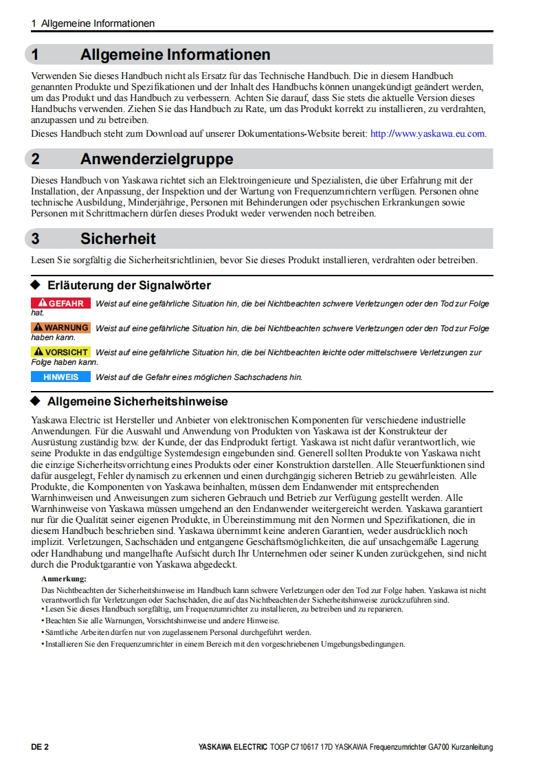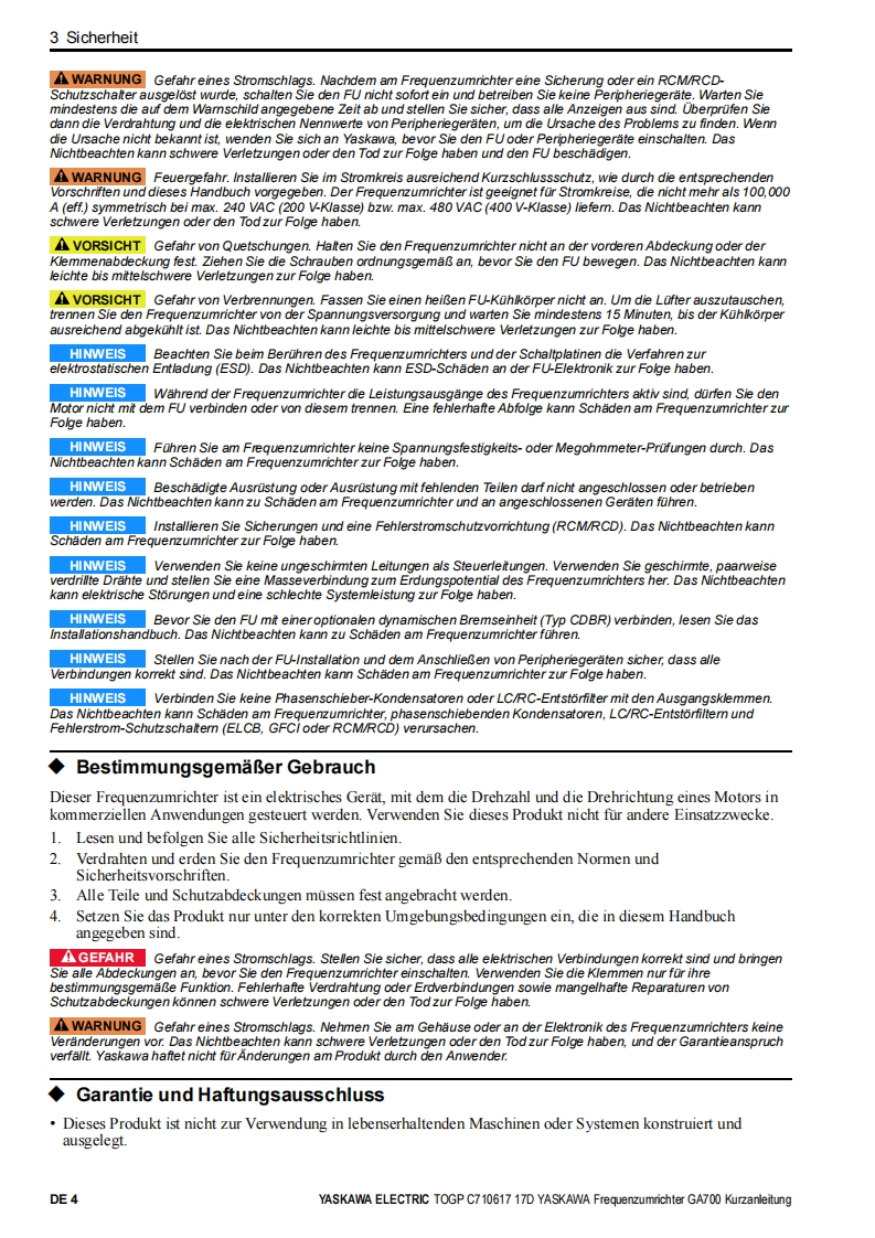 YASKAWAYASKAWAFrequenzumrichterGA700HochleistungstypKurzanleitungTyp:CIPR-GA70CxxxxxxxxModelle:200 V-Klasse:0.55 bis 110 kW400 V-Klasse:0.55 bis 355 kWLesen Sie zur ordnungsgemaBen Verwendung des Produkts dieses Handbuchgrundlich durch und bewahren Sie es zum Nachlesen,fur Inspektionen undWartungsarbeiten griffbereit auf.Stellen Sie sicher,dass der Endanwenderdieses Handbuch erhalt.KurzanleitungDELiteratur-Nr.TOGP C710617 17D