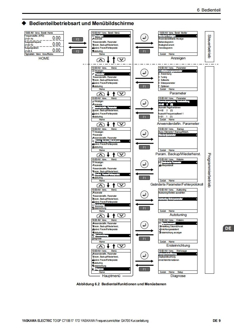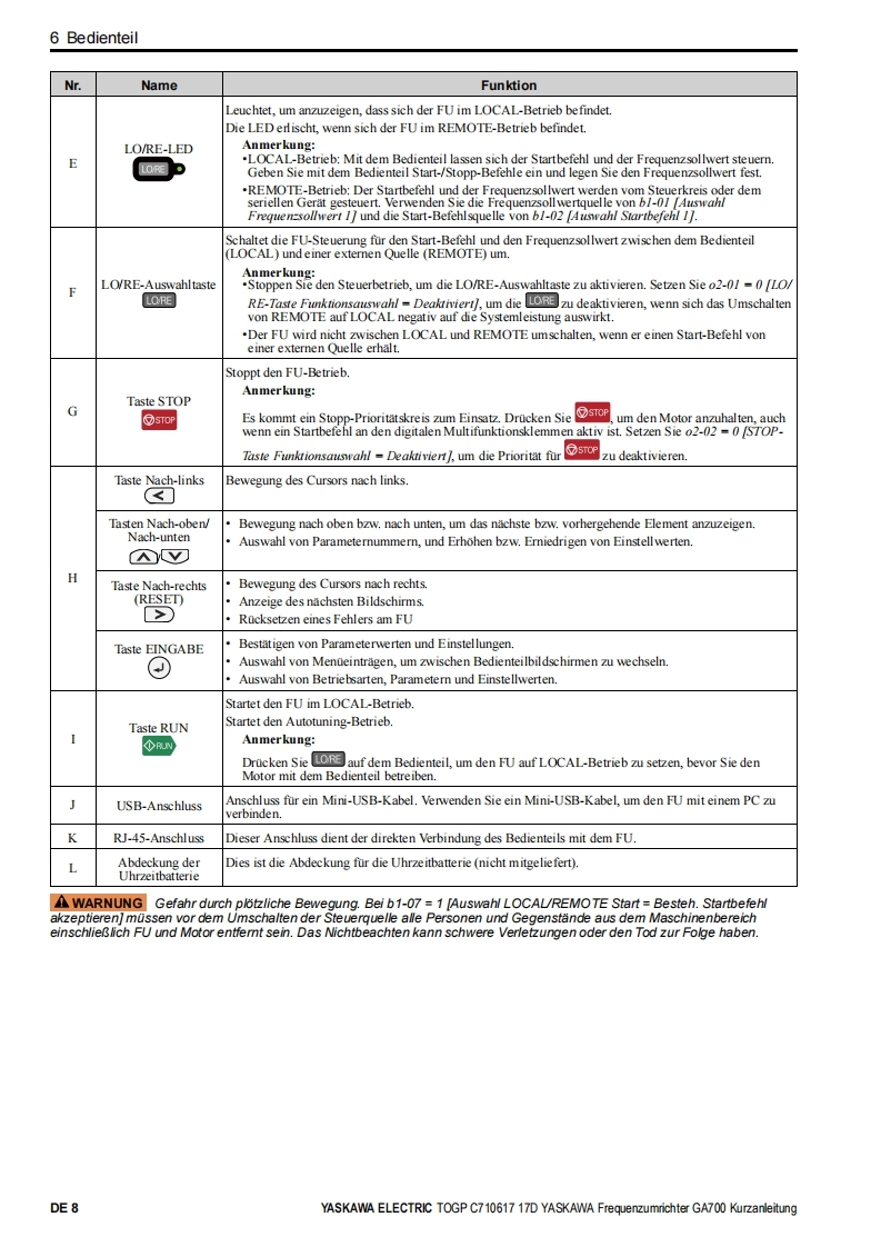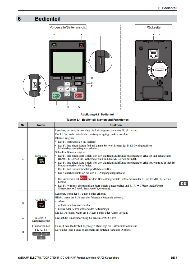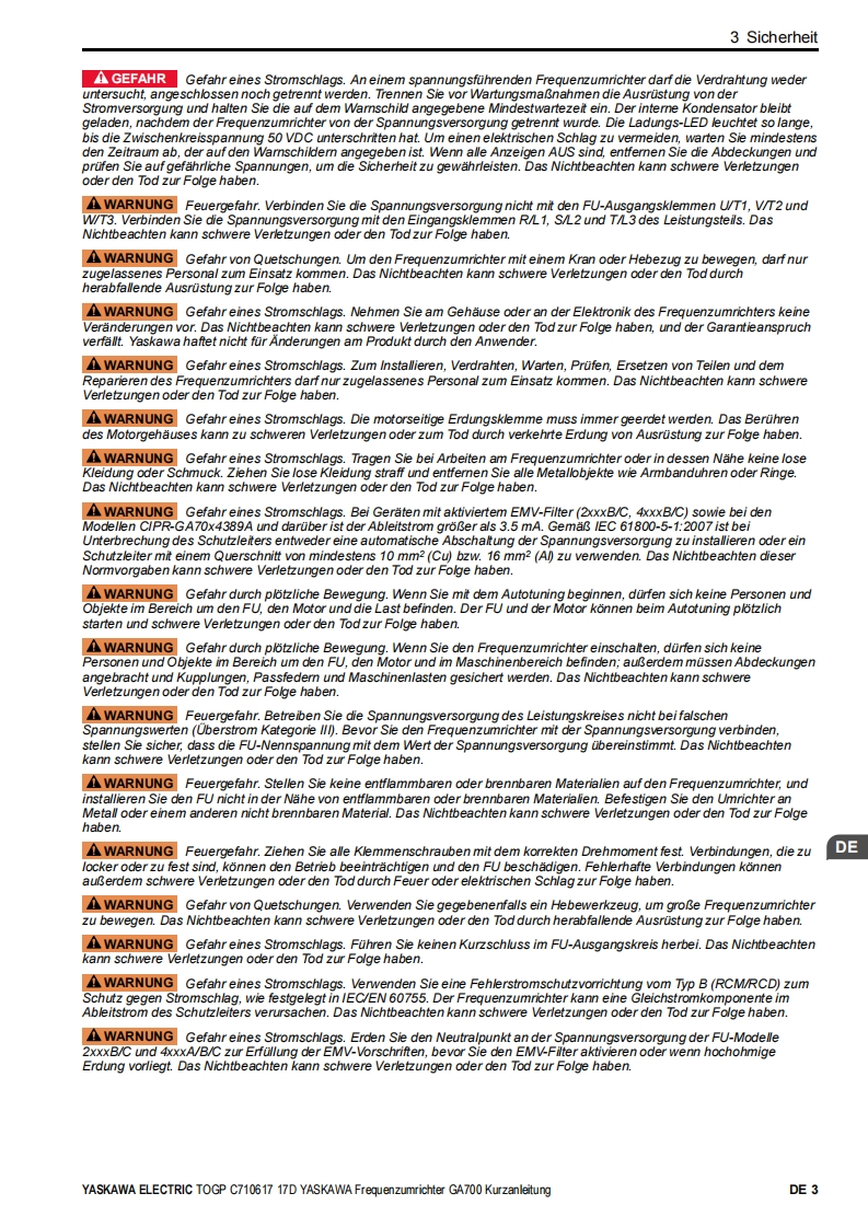 YASKAWAYASKAWAFrequenzumrichterGA700HochleistungstypKurzanleitungTyp:CIPR-GA70CxxxxxxxxModelle:200 V-Klasse:0.55 bis 110 kW400 V-Klasse:0.55 bis 355 kWLesen Sie zur ordnungsgemaBen Verwendung des Produkts dieses Handbuchgrundlich durch und bewahren Sie es zum Nachlesen,fur Inspektionen undWartungsarbeiten griffbereit auf.Stellen Sie sicher,dass der Endanwenderdieses Handbuch erhalt.KurzanleitungDELiteratur-Nr.TOGP C710617 17D