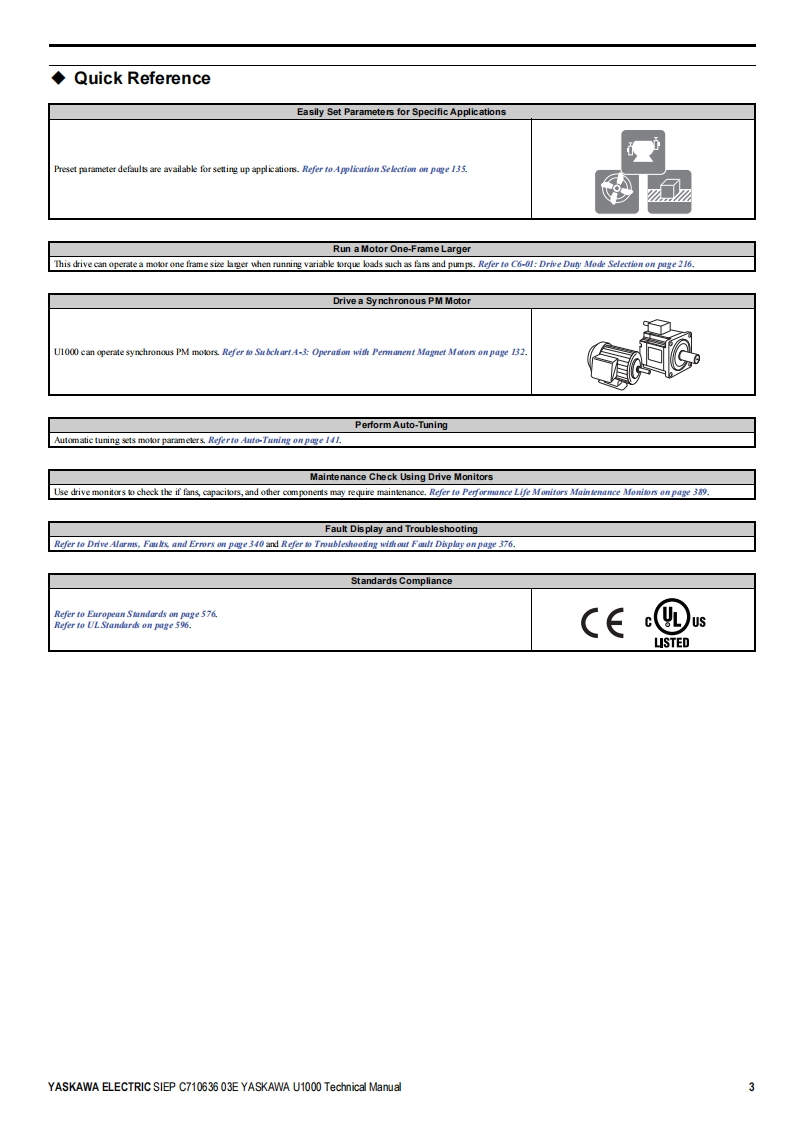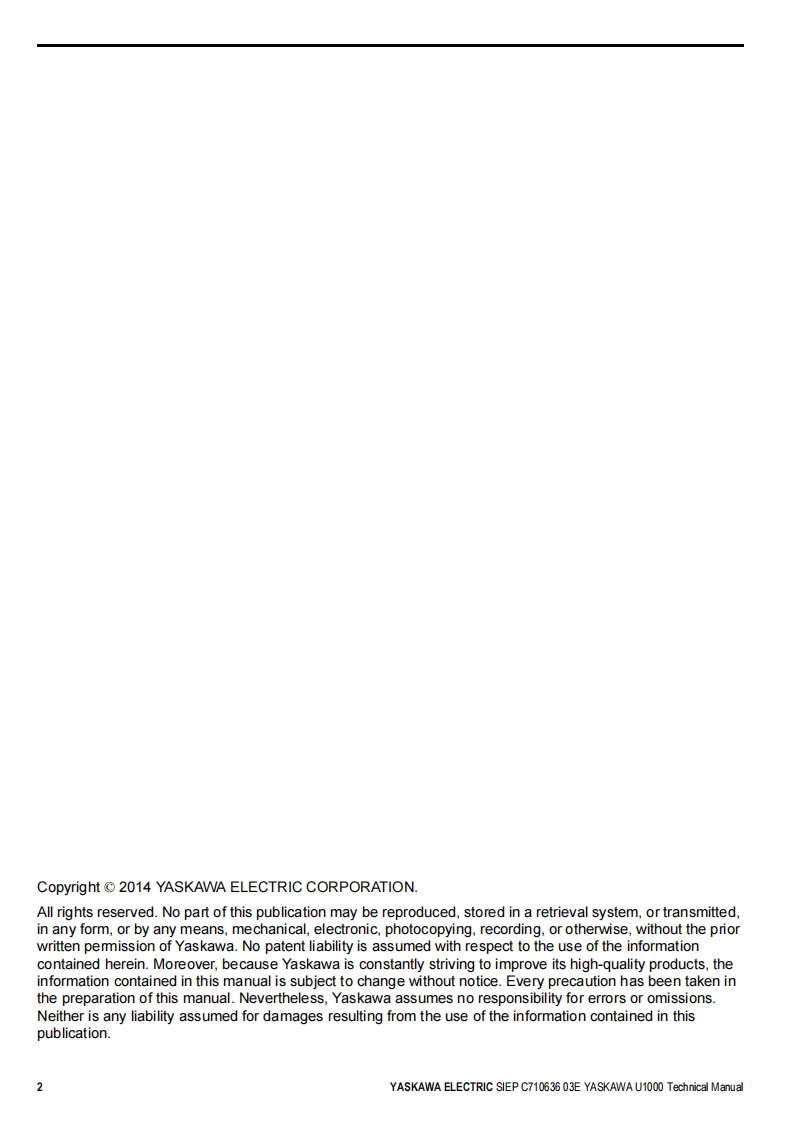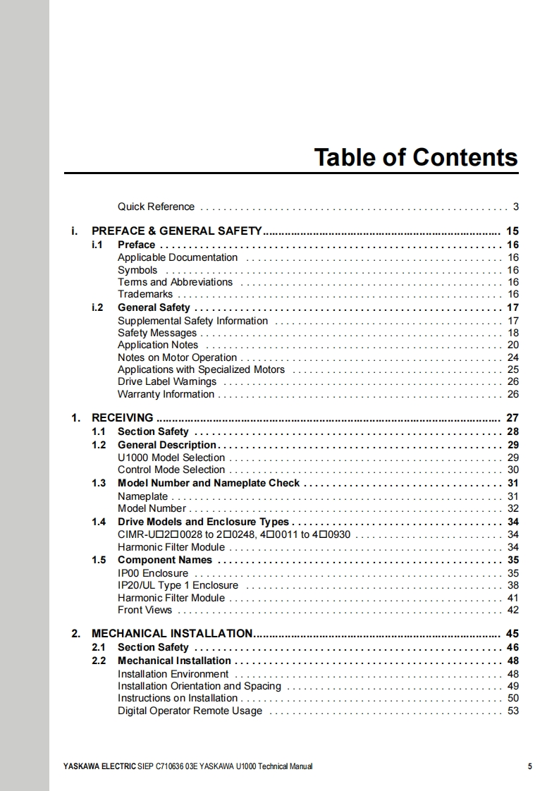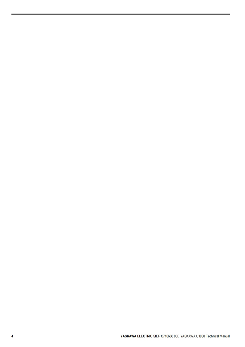 YASKAWALow Harmonics Regenerative Matrix ConverterYASKAWA U1000 SeriesTechnical ManualType:CIMR-Uc☐Rated Output Current:200 V Class:22 to 248 A400 V Class:9.6 to 930AReceivingMechanical Installation2Electrical Installation3Start-Up Programming4OperationParameter Details5Troubleshooting6Periodic InspectionMaintenance7Peripheral DevicesOptions8SpecificationsAParameter ListBMEMOBUS/ModbusCommunicationsCStandards ComplianceDMANUAL NO.SIEP C710636 03EQuick Reference SheetE