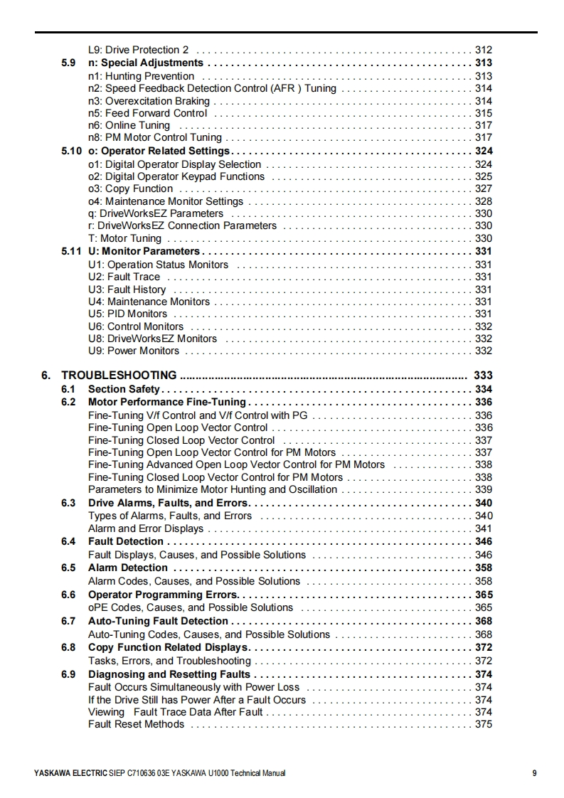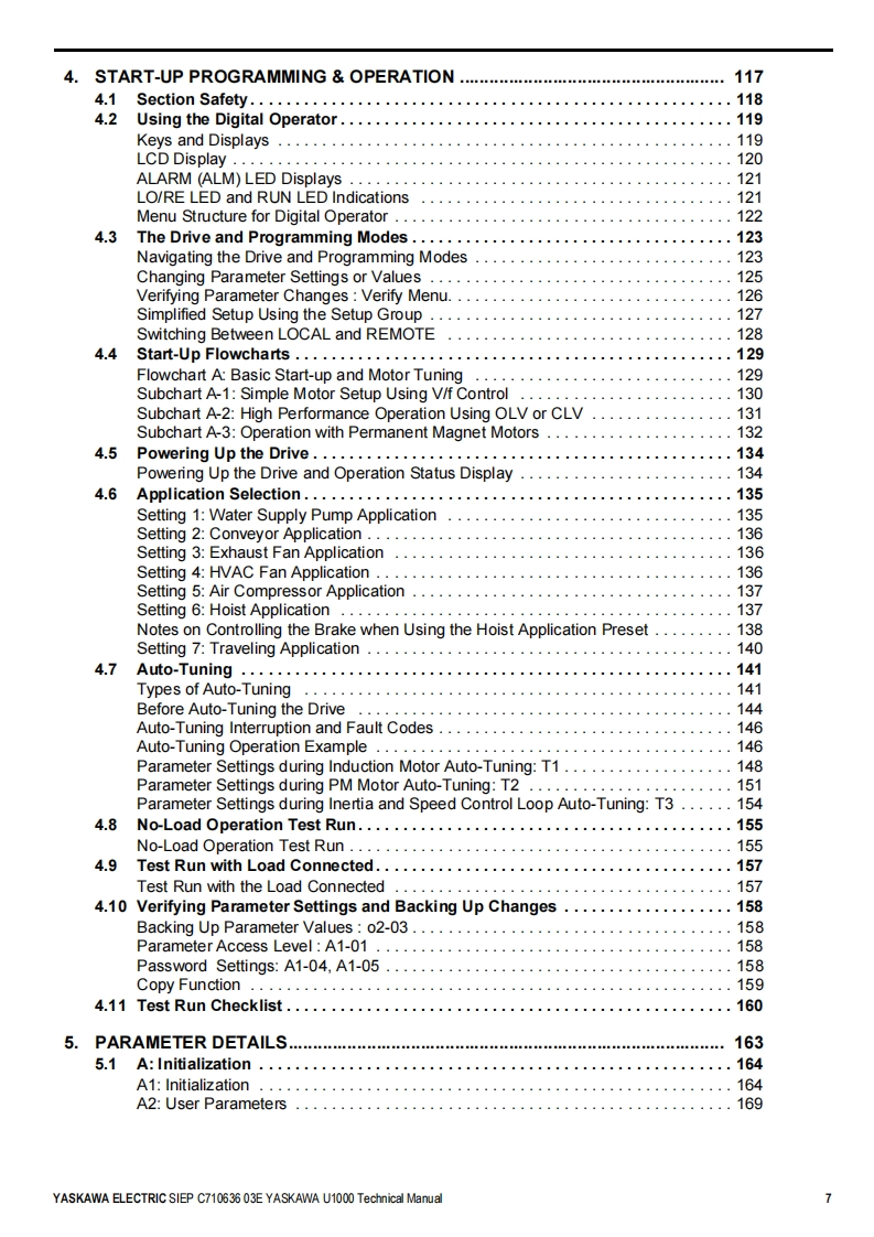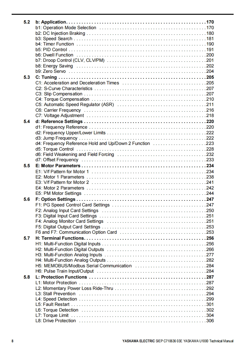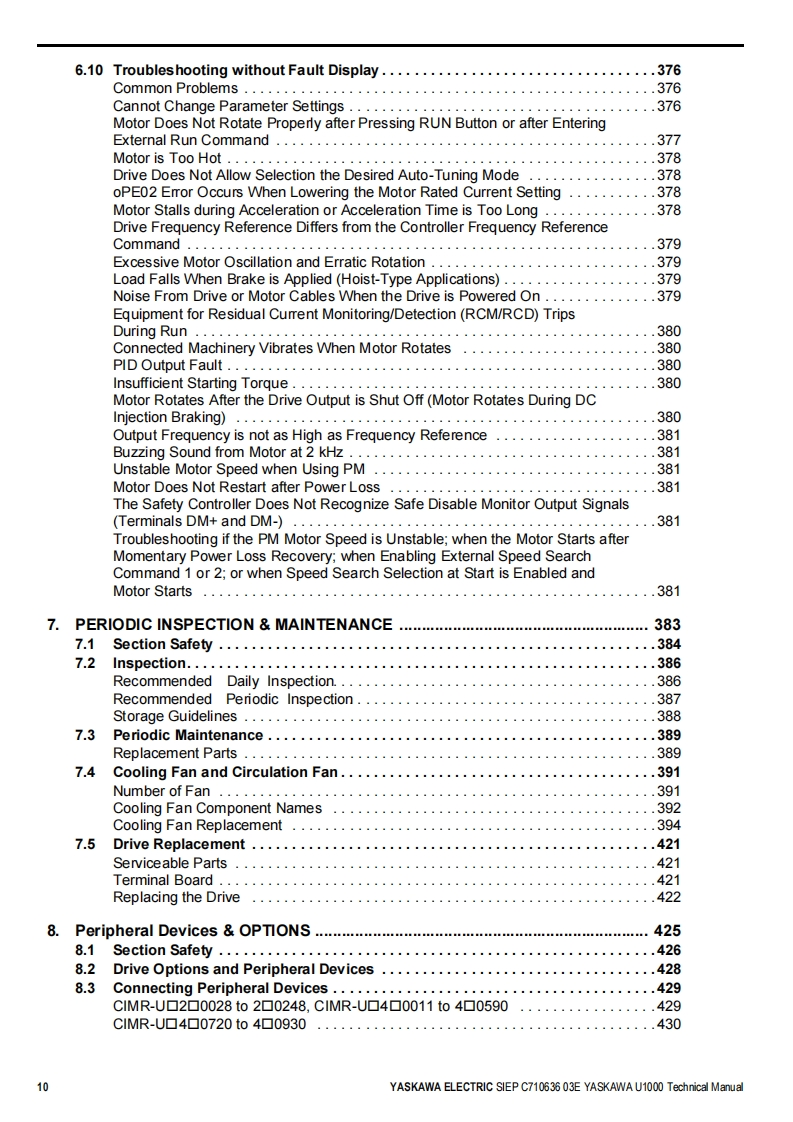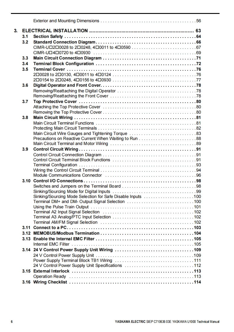 YASKAWALow Harmonics Regenerative Matrix ConverterYASKAWA U1000 SeriesTechnical ManualType:CIMR-Uc☐Rated Output Current:200 V Class:22 to 248 A400 V Class:9.6 to 930AReceivingMechanical Installation2Electrical Installation3Start-Up Programming4OperationParameter Details5Troubleshooting6Periodic InspectionMaintenance7Peripheral DevicesOptions8SpecificationsAParameter ListBMEMOBUS/ModbusCommunicationsCStandards ComplianceDMANUAL NO.SIEP C710636 03EQuick Reference SheetE