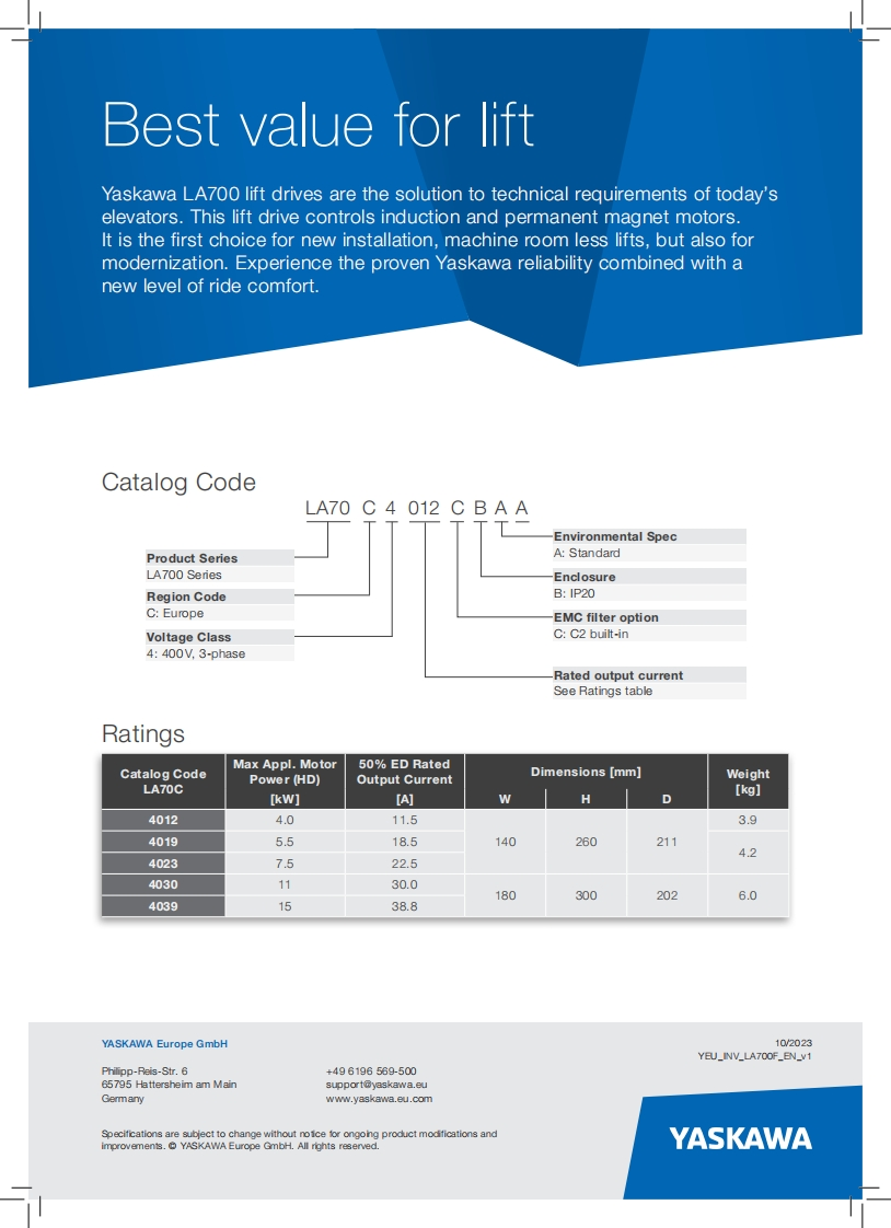 A700YASKAWAThe Lift DriveKey featuresSuper-smooth ride comfortQuieter operation thanks to newfrequency adjustment functionAdvanced light load search forevacuation (smaller UPS)SIL3 STO Zero contactor solution)◆BiSS support.Integrated Class C2 EMC filterCoated PCBs according to3C2,3S2 by defaultEmbedded braking chopperFast installation and setupYASKAWA·Smart replacementMotor tuning in stand-still conditionwithout removing ropesFor gearless and geared lifts·Upto4m/sAdvanced functions·Direct to floorMonitors for motor temperature,YASKAWApeak current and lifetimeLA700Advanced short floor managementa醒Elevator setup wizard.Support for 13 languagesTorque compensation withload cellOperation with motor encoder10 YEARS[optional]688peaiae