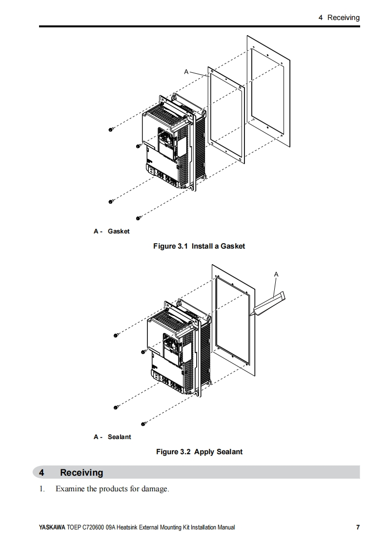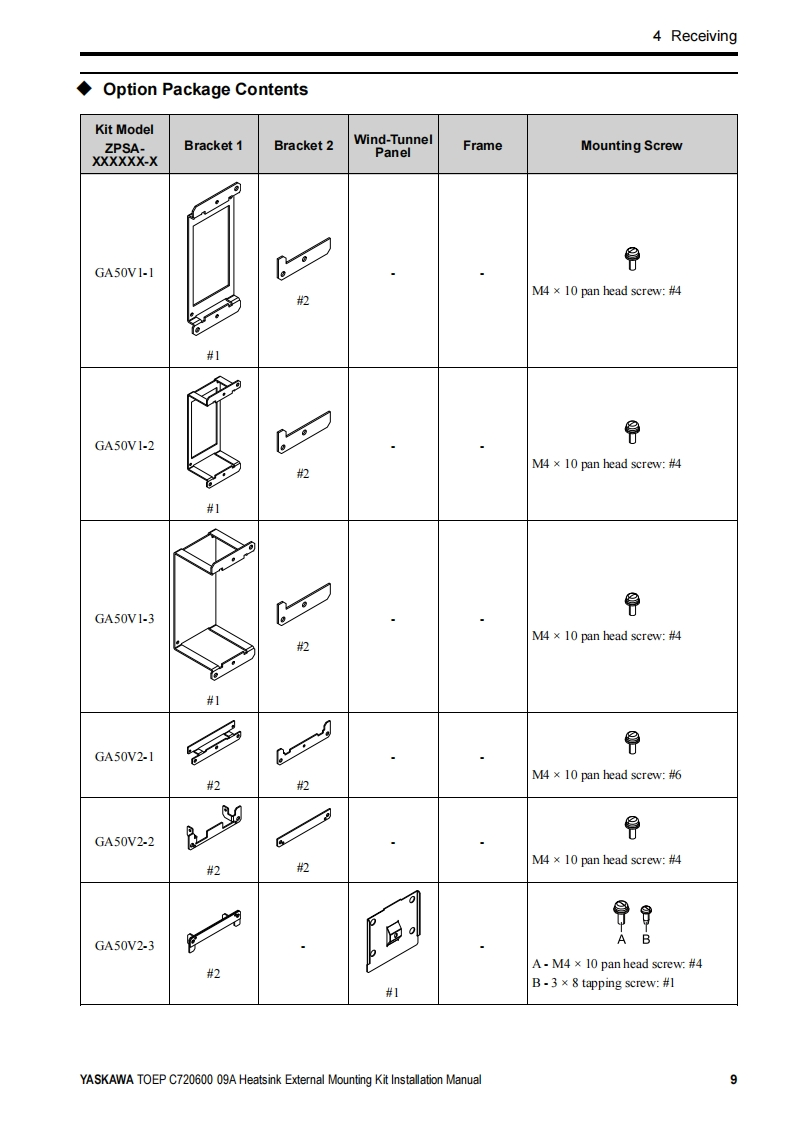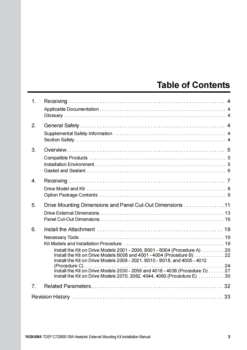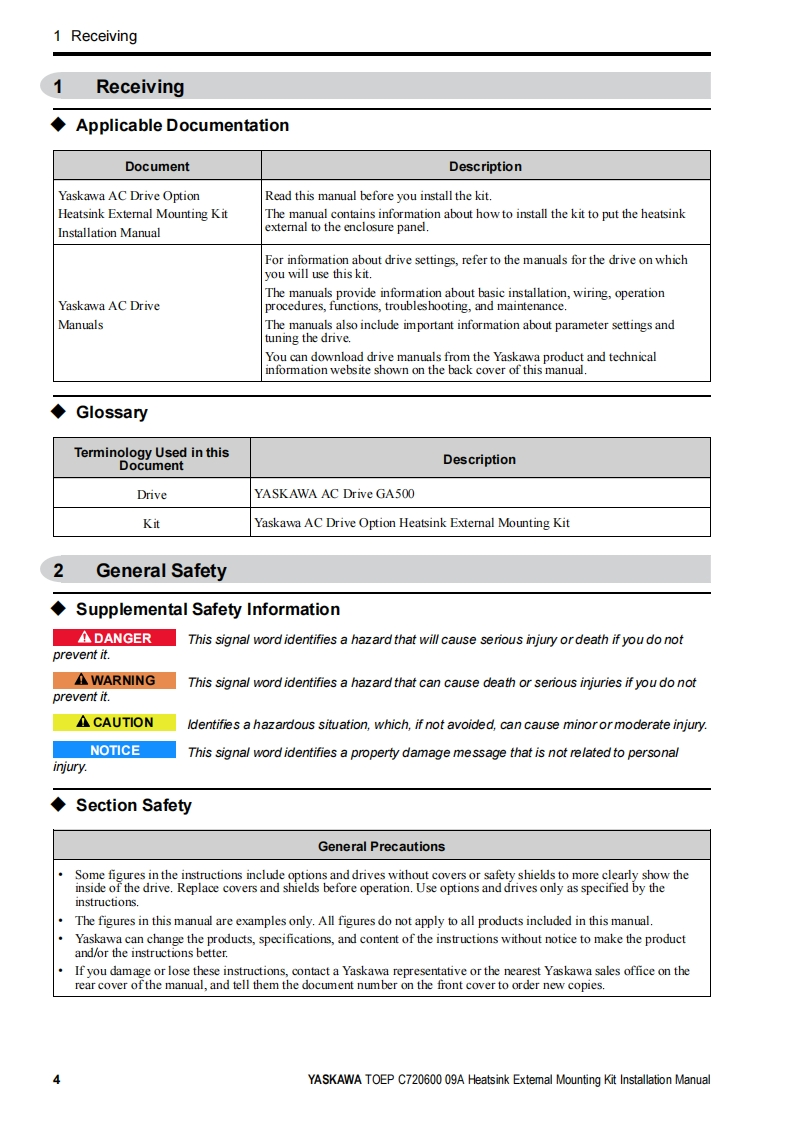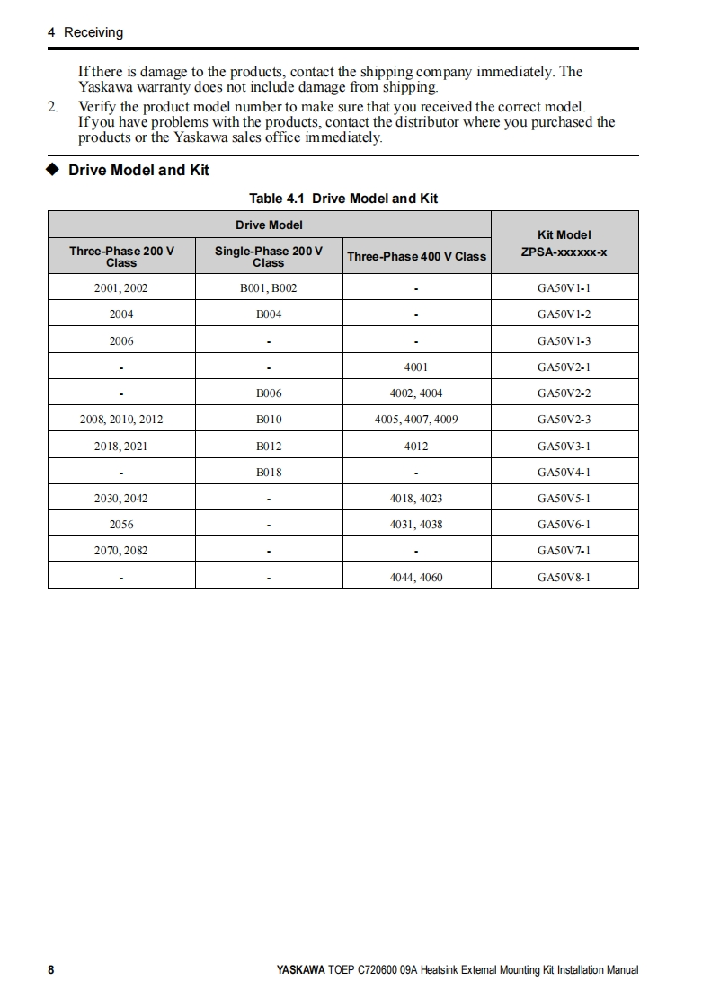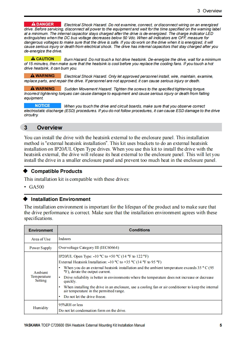 YASKAWAYaskawa AC Drive OptionHeatsink External Mounting KitInstallation manualType:ZPSA-GA50Vx-xTo properly use the product,read this manual thoroughly and retain foreasy reference,inspection,and maintenance.Ensure the end userreceives this manual.MANUAL NO.TOEP C720600 09A