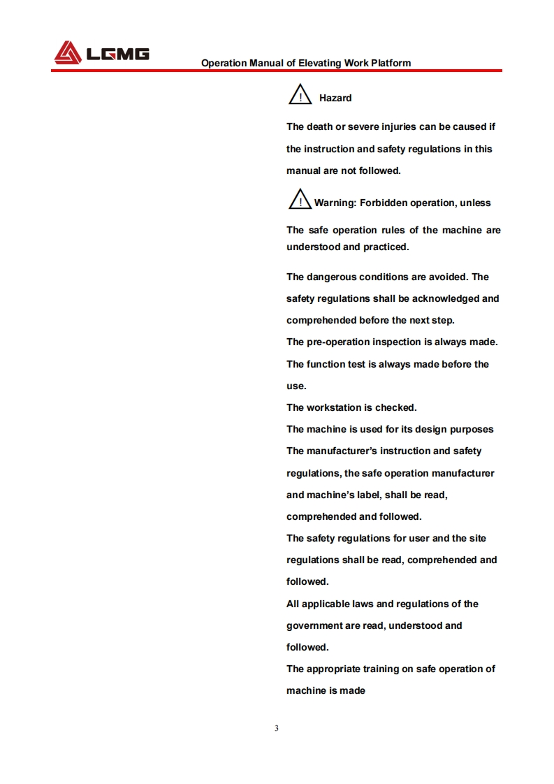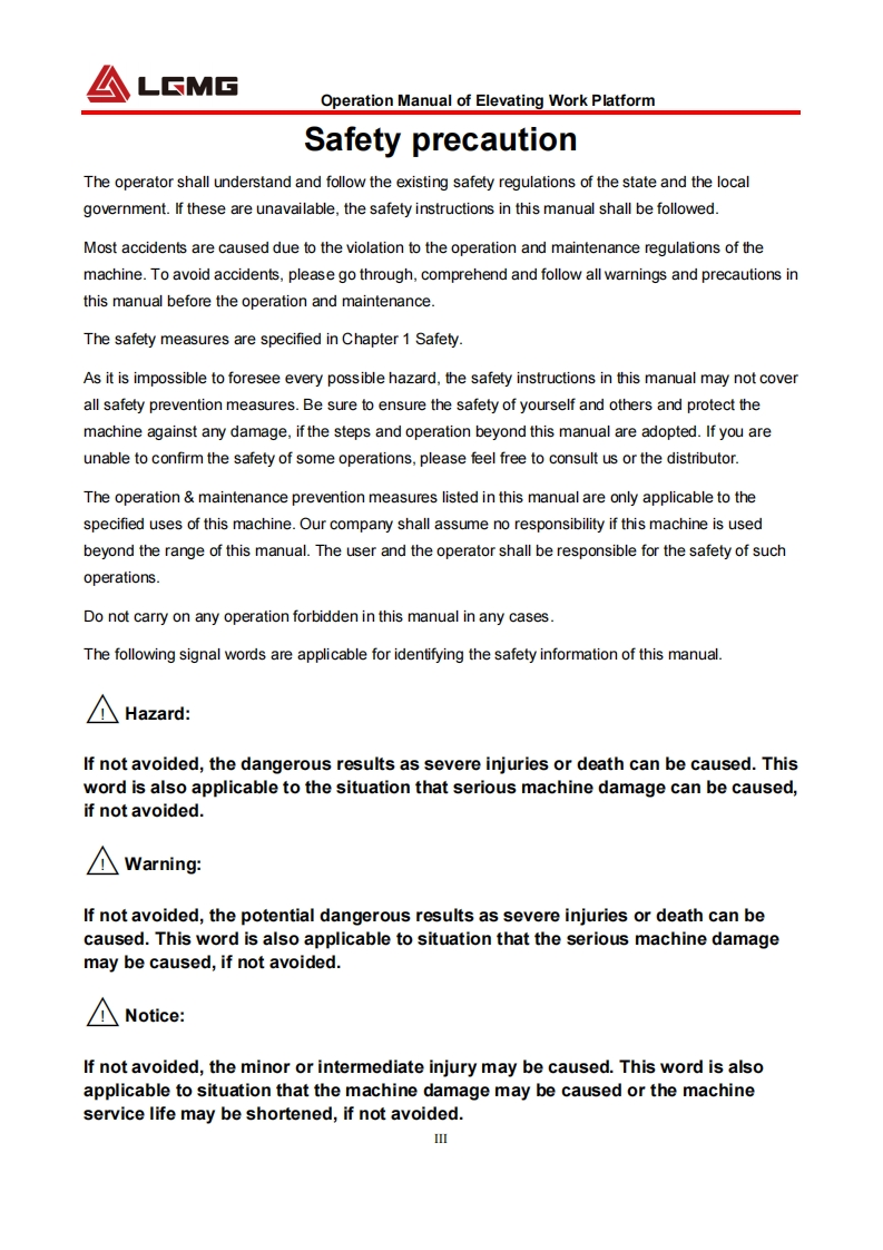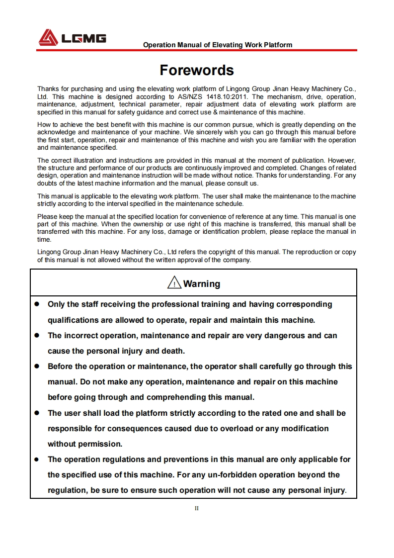 LGMGOperation ManualSS0407E/AS0607E/AS0812E/AS1012E/AS1212E/AS1413EMobile Elevating Work Platform△NarningBefore operation and maintenance,thedrivers and service personnel shallalways read and thoroughly understandall information in this manual.Failure todo so may result in,fatal accidents orpersonal injury.This manual must be kept with thismachine at all times.LINGONG GROUP JINAN HEAVY MACHINERY CO.,LTD.