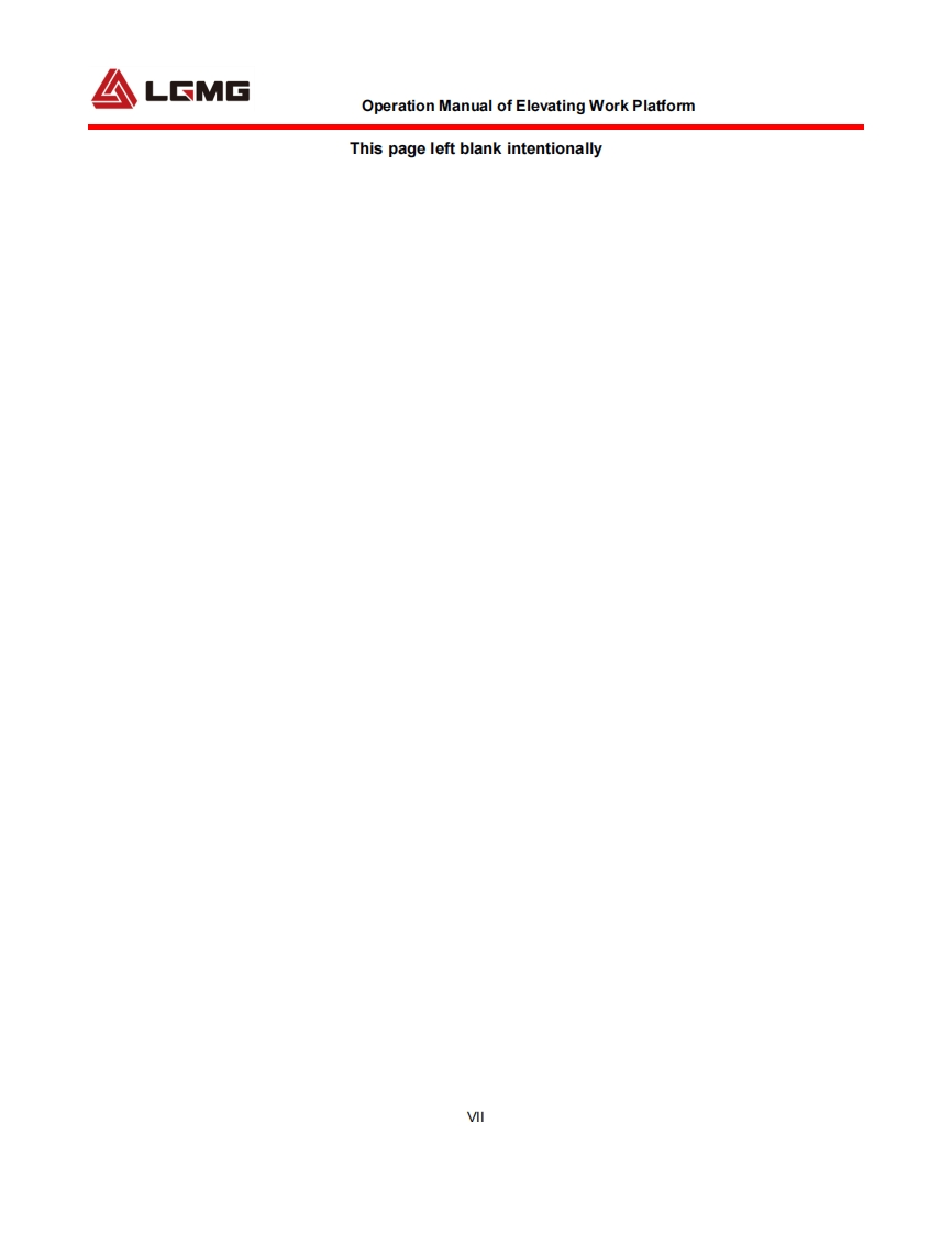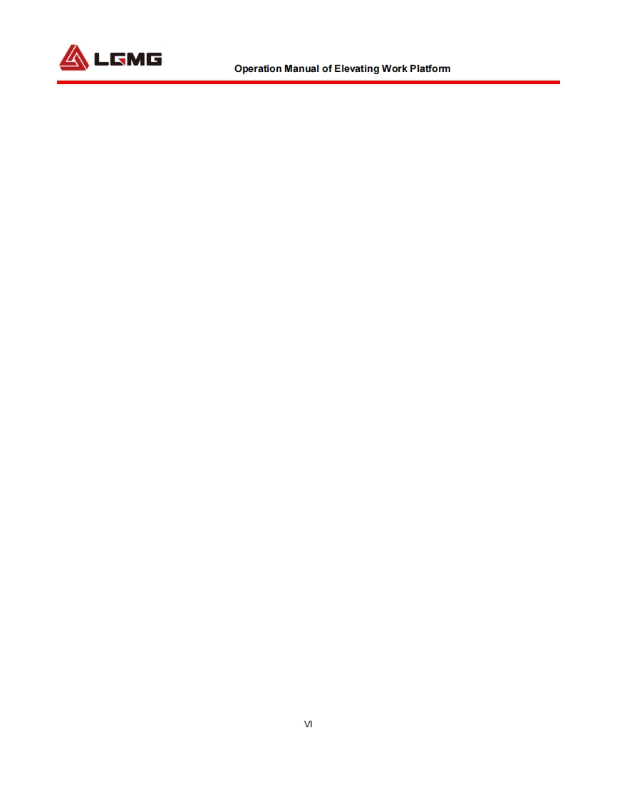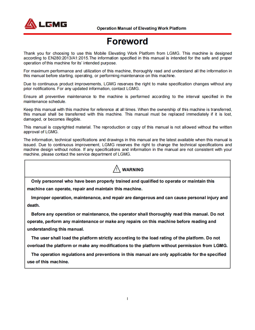 LGMGOperation ManualSS0407E/SS0507E/SS0607E/AS0607E/AS0607WE/AS0608EAS0808E/AS0612E/AS0812E/AS1012E/AS1212E/AS1413E/AS0607/AS0607WWAS0608/AS0808/AS0612/AS0812/AS1012/AS1212/AS1413S0607E/S1212EMobile Elevating Work PlatformWARNINGBefore operation and maintenance,thedrivers and service personnel shallalways read and thoroughly understandall information in this manual.Failure todo so may result in,fatal accidents orpersonal injury.This manual must be kept with thismachine at all times.