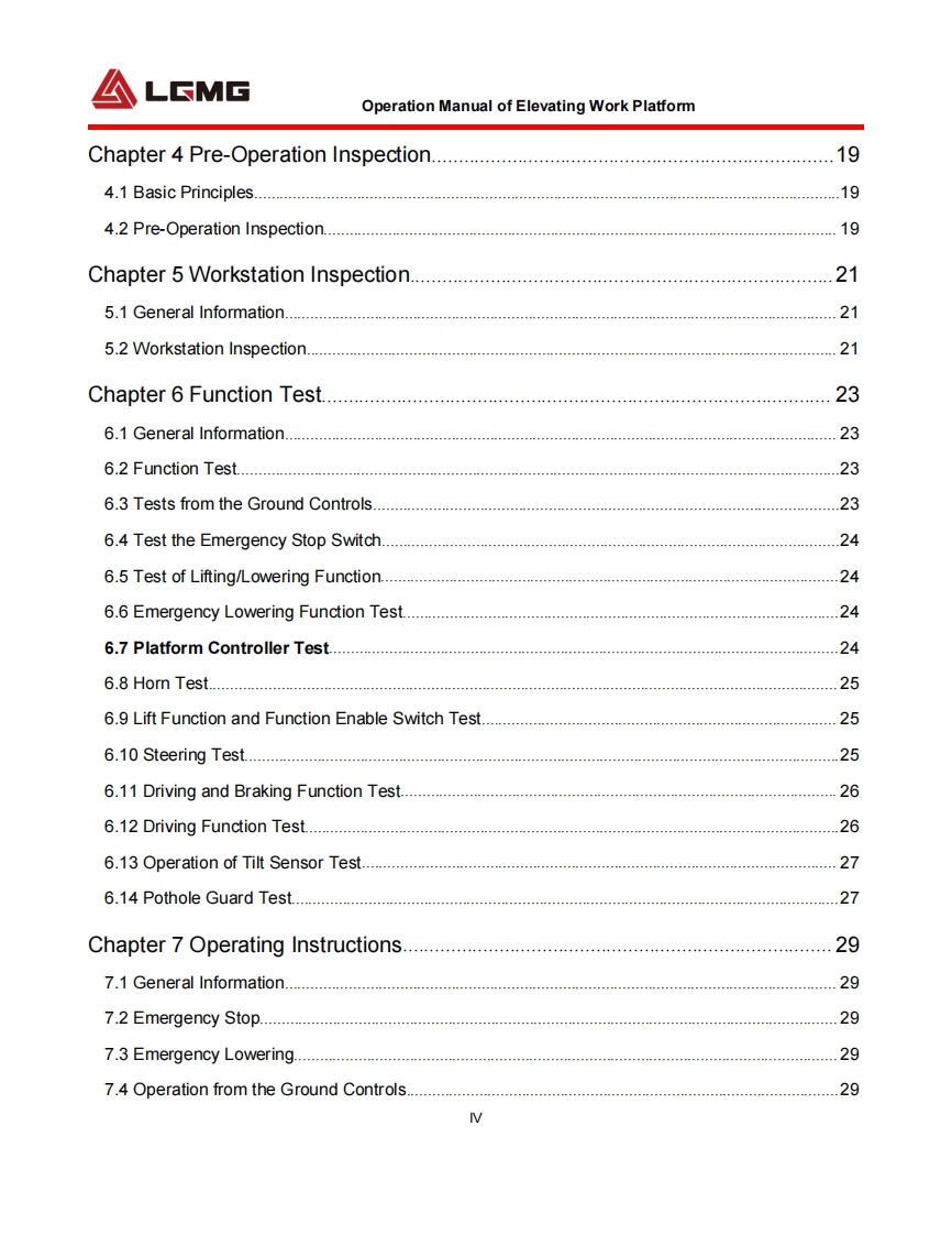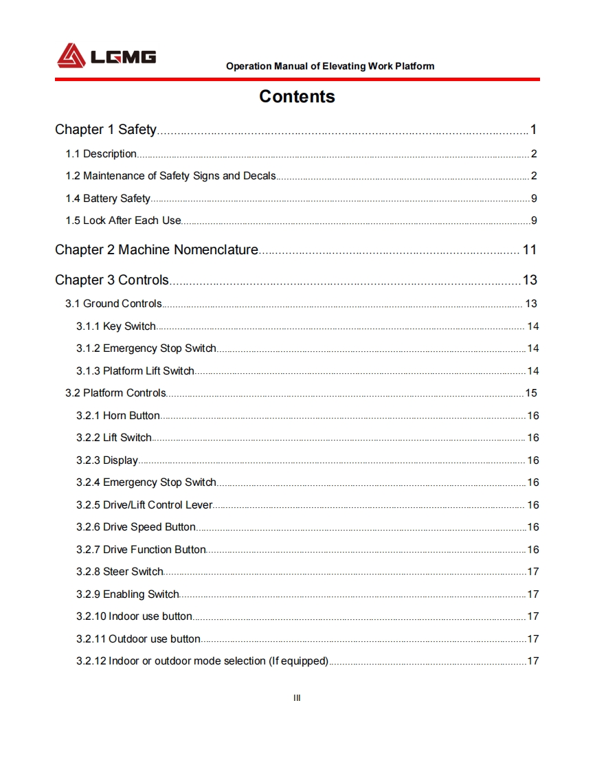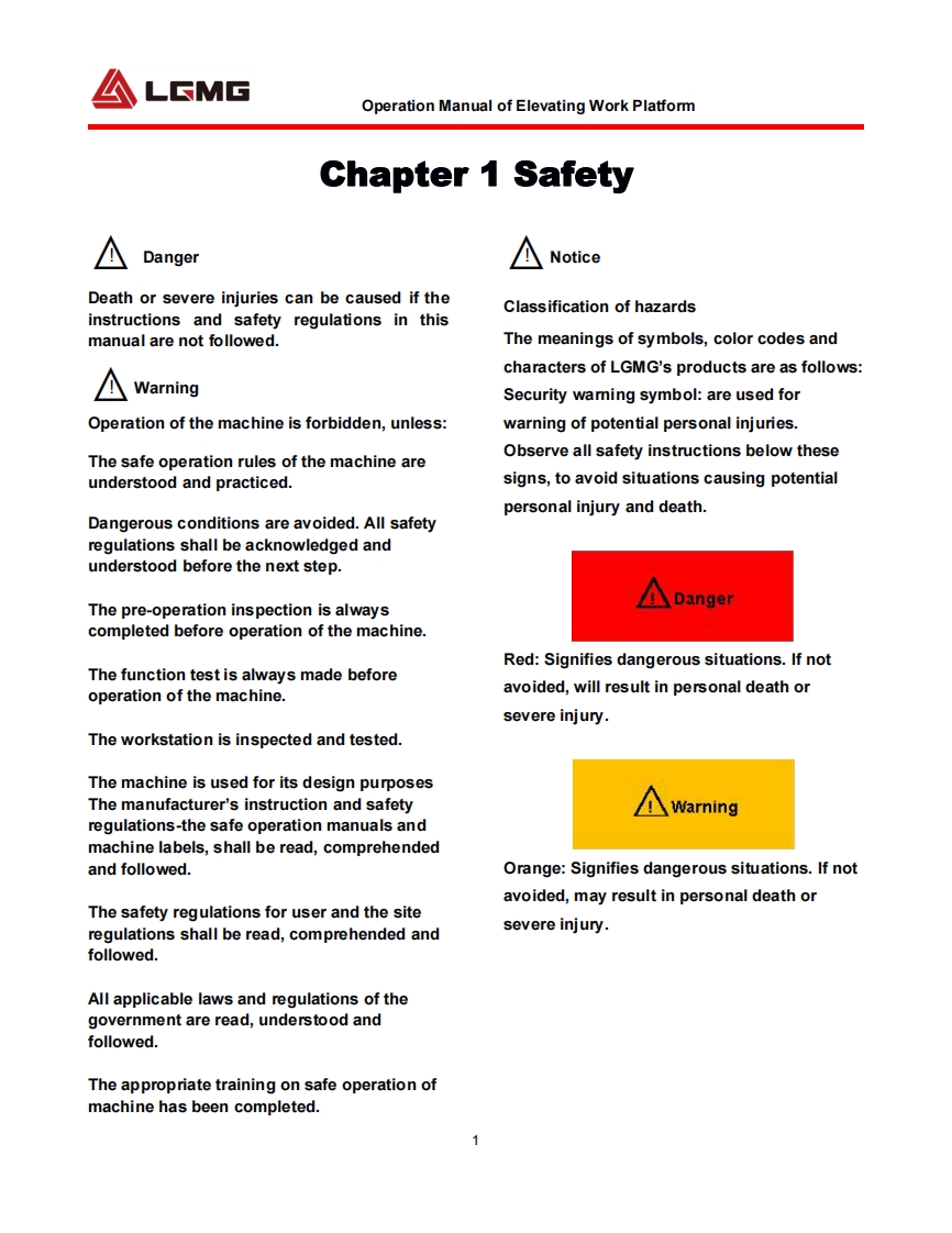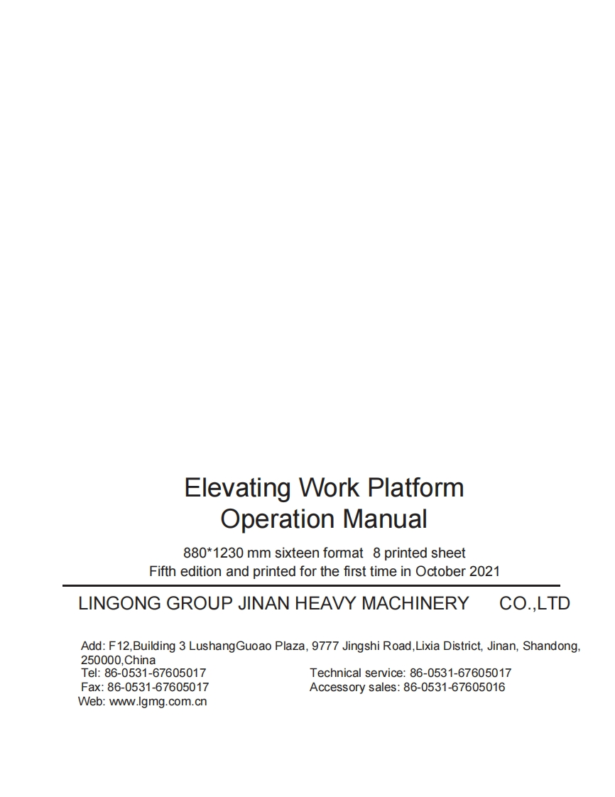LGMGOperation ManualSS0407E/SS0507E/SS0607E/AS0607E/AS0607WE/AS0608EAS0808E/AS0612E/AS0812E/AS1012E/AS1212E/AS1413E/AS0607/AS0607WWAS0608/AS0808/AS0612/AS0812/AS1012/AS1212/AS1413S0607E/S1212EMobile Elevating Work PlatformWARNINGBefore operation and maintenance,thedrivers and service personnel shallalways read and thoroughly understandall information in this manual.Failure todo so may result in,fatal accidents orpersonal injury.This manual must be kept with thismachine at all times.