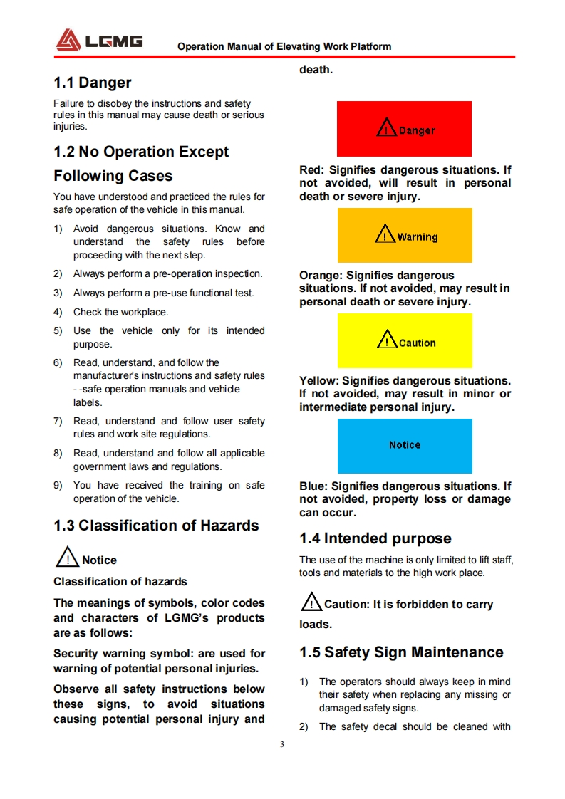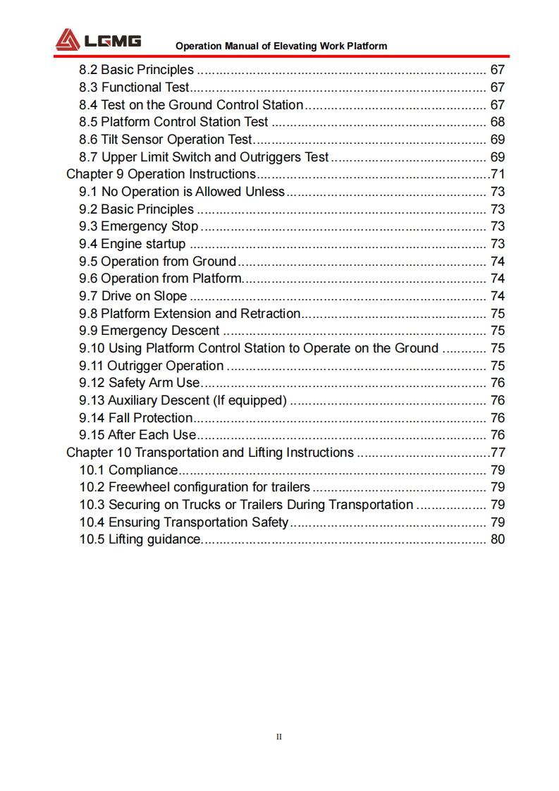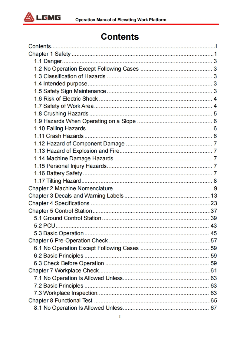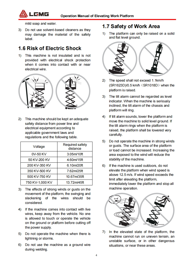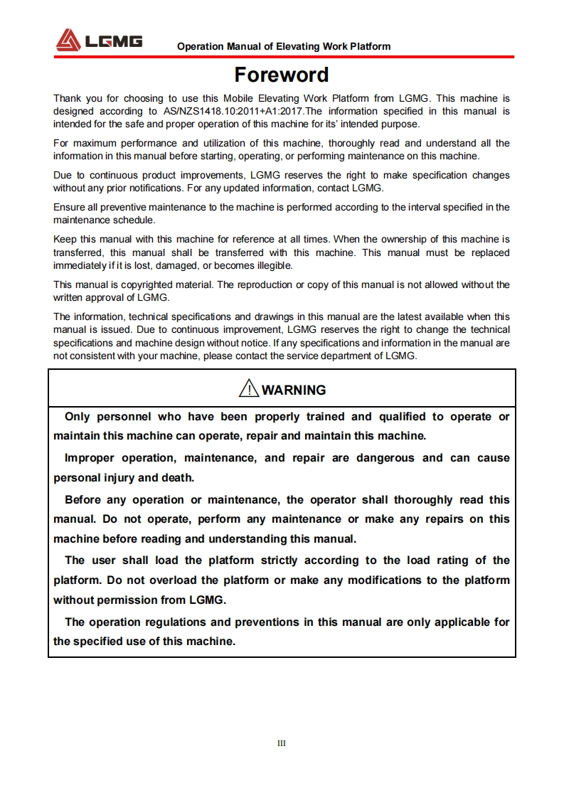 公LGMGOperation ManualSR1018D/SR1218D/SR1323D/SR1623DMobile Elevating work platform△WarningBefore operation and maintenance,thedrivers and service personnel shallalways read and thoroughly understandall information in this manual.Failure todo so may result in,fatal accidents orpersonal injury.This manual must be kept with thismachine at all times.LINGONG GROUP JINAN HEAVY MACHINERY CO.,LTD.
