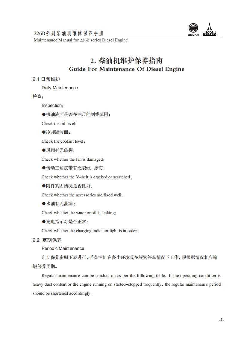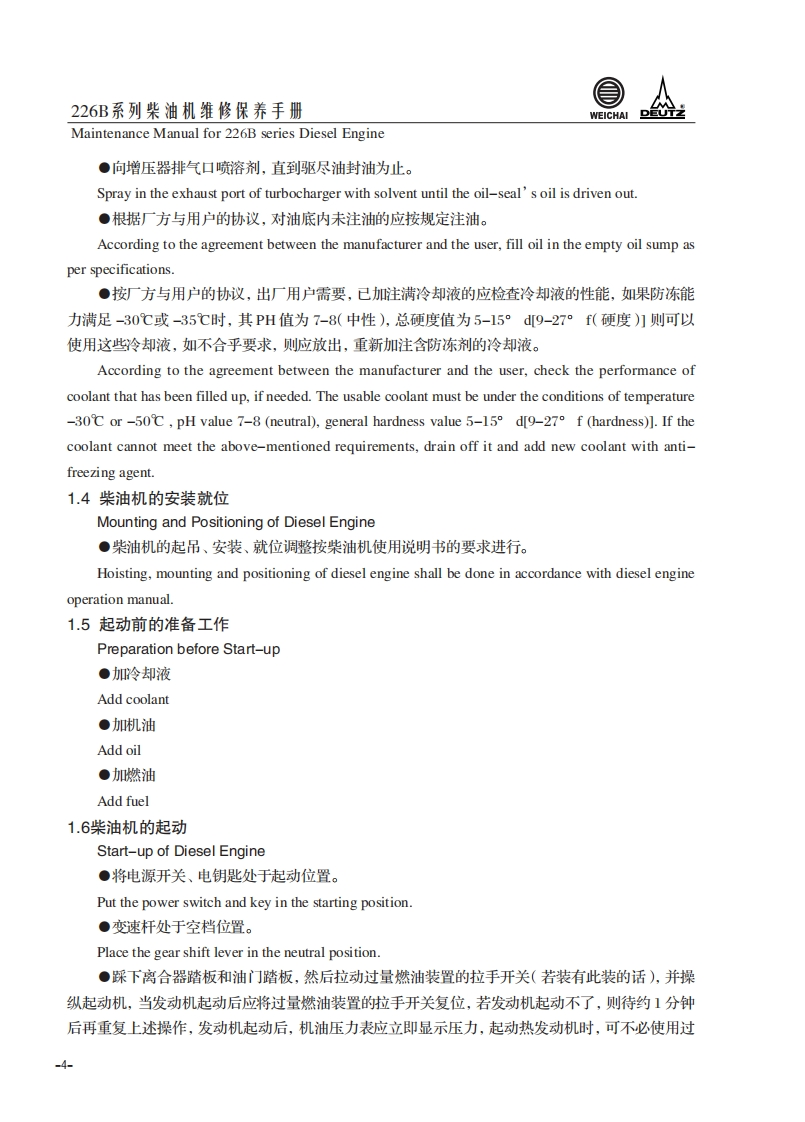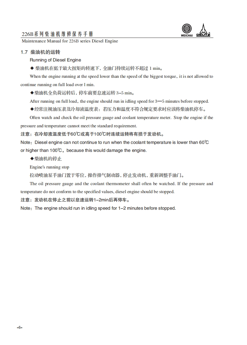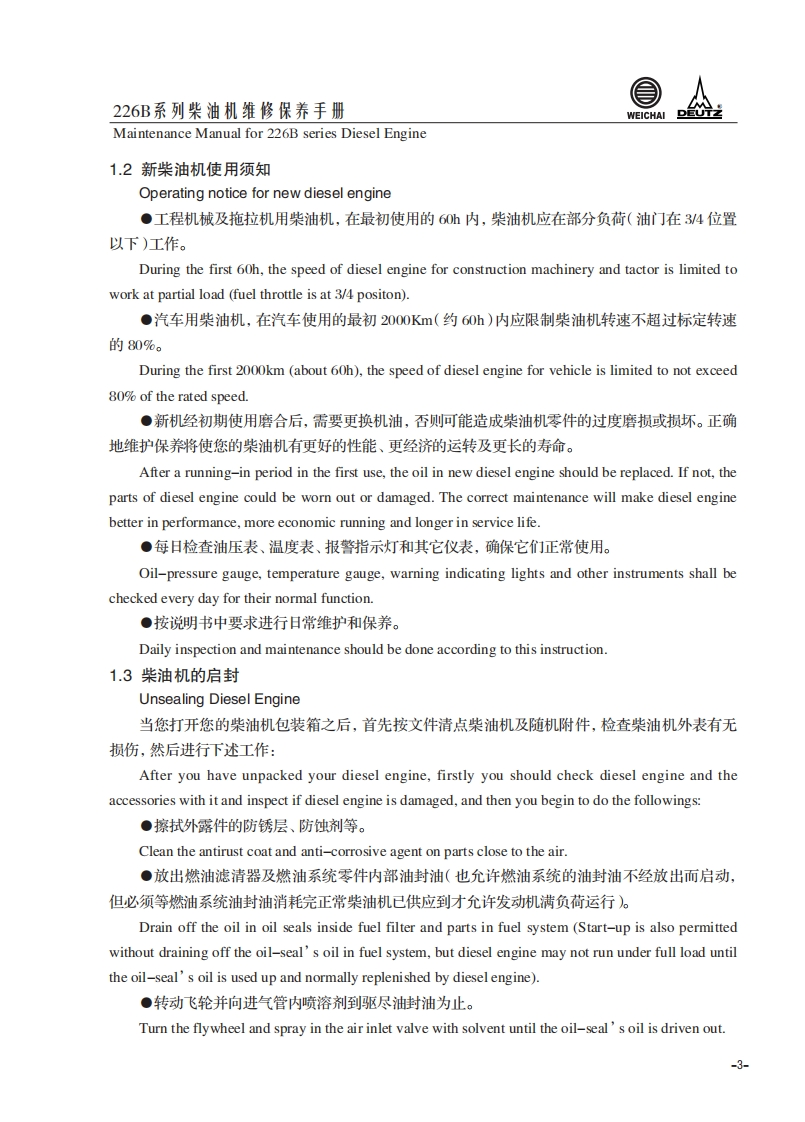 226B系列柴油机维修保养手册Maintenance Manual for 226B series Diesel Engine1.柴油机使用说明Usage Instruction1.1226B系列柴油机代号含义The signification of the code of 226B series diesel engineT B D 2226B-6G用途代号:Application code:缸数63:为三缸4:为四缸)Cylinder numbers湿式气缸套net cylinder liner柴油机家族序号Diesel engineserie number水冷Water cooled进气方式:Inlet air method自然吸气:DD-natural aspiration增压:TDTD-trubocharged增压中冷:TBDTBD-turbocharged and intercooled-1-