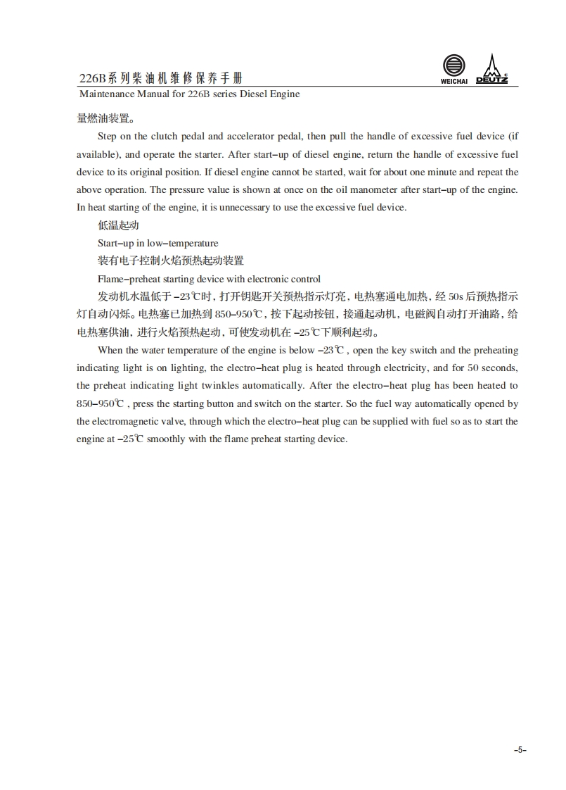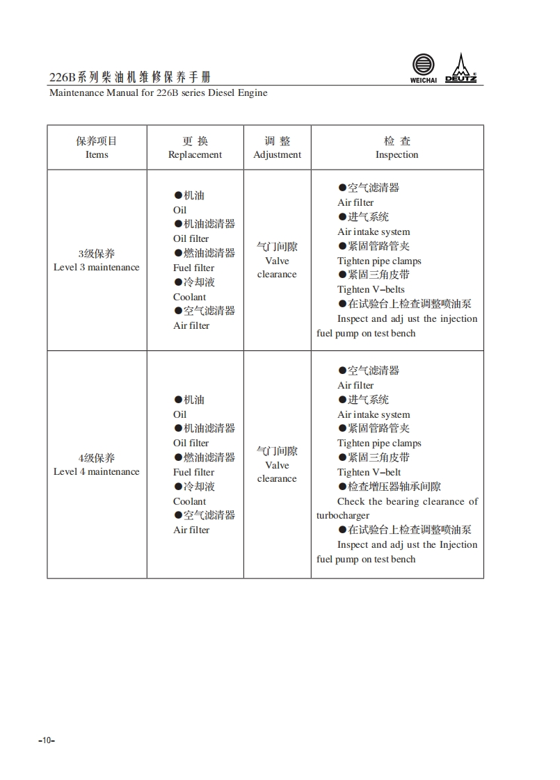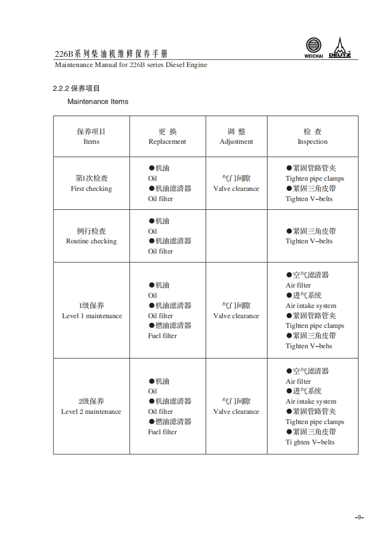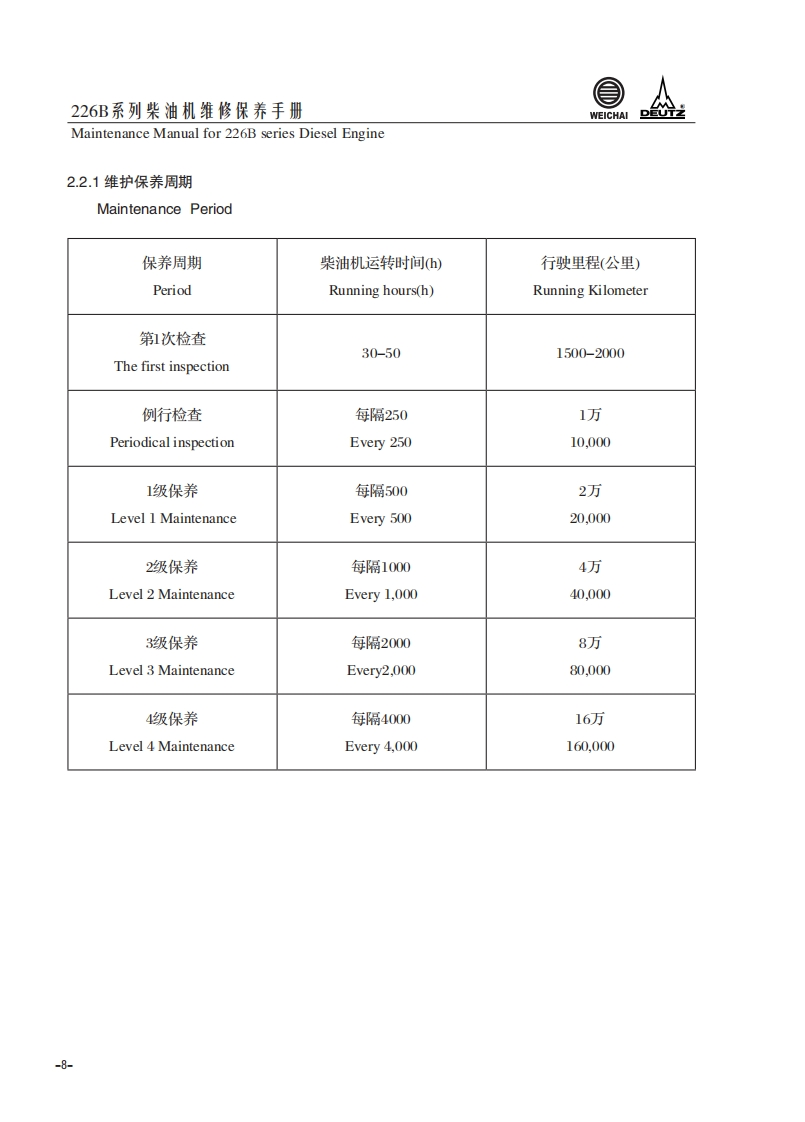 226B系列柴油机维修保养手册Maintenance Manual for 226B series Diesel Engine1.柴油机使用说明Usage Instruction1.1226B系列柴油机代号含义The signification of the code of 226B series diesel engineT B D 2226B-6G用途代号:Application code:缸数63:为三缸4:为四缸)Cylinder numbers湿式气缸套net cylinder liner柴油机家族序号Diesel engineserie number水冷Water cooled进气方式:Inlet air method自然吸气:DD-natural aspiration增压:TDTD-trubocharged增压中冷:TBDTBD-turbocharged and intercooled-1-