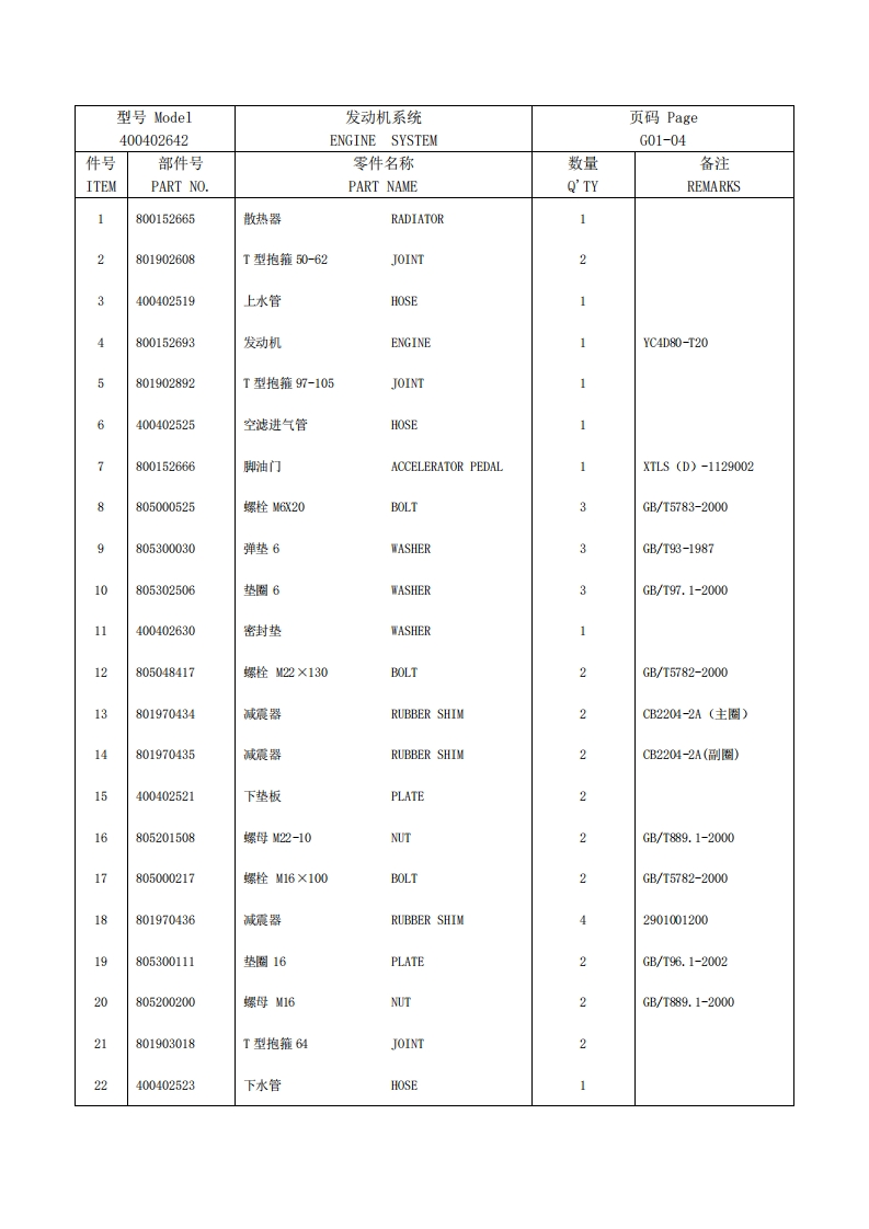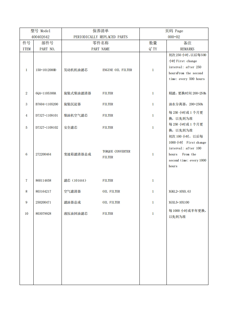 目录Catalogue保养清单PERIODICALLY REPLACED PARTS000-01燃油箱FUEL TANK..G01-01发动机系统ENGINE SYSTEM.G01-03发动机系统ENGINE SYSTEMG01-05双变系统1 GEARBOX SYSTEMG02-01双变系统1 GEARBOX SYSTEM.G02-03双变系统2 GEARBOX SYSTEMG02-05双变系统3 GEARBO0 X SYSTEM.G02-07驱动桥系统TRANSMISSION SYSTEM.G03-01系统台架PLATFORM SYSTEM..G04-01前车架系统FRONT CHASSIS。G05-01前车架系统FRONT CHASSISG05-03后车架系统REAR CHASSIS.G06-01后车架系统REAR CHASS引SG06-03工作液压系统(一)WORKING HYDROLIC SYSTEMG07-01工作液压系统(一)NORKING HYDROLIC SYSTEM.G07-03工作液压系统(二)WORKING HYDROLIC SYSTEMG07-05工作液压系统(二)WORKING HYDROLIC SYSTEMG07-07转向液压系统STEERING HYDRAULIC SYSTEM.G07-09转向液压系统STEERING HYDRAULIC SYSTEM.G07-11先导液压系统PILOT HYDRAULIC SYSTEM000-00液压油箱OIL TANK.G07-13工作连杆系统WORKING LINK SYSTEMG08-01制动系统BRAKE SYSTEMG09-01制动系统BRAKE SYSTEMG09-03驾驶室系统CABG10-01内饰总成INTERIORG10-07座椅总成CHAIR.…G10-09电气系统ELECTRICAL SYSTEM..G11-01电气系统ELECTRICAL SYSTEM.G11-03机罩系统ENGINE HOOD SYSTEM.G12-01空调系统AIR-CONDITIONER SYSTEMG14-01标配铲斗BUCKETG18-01