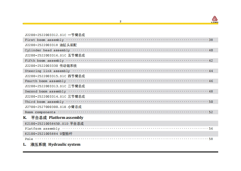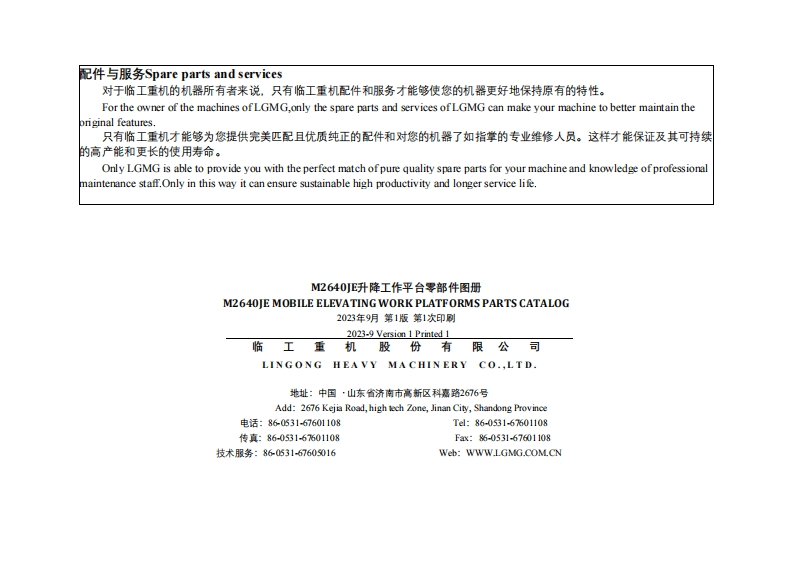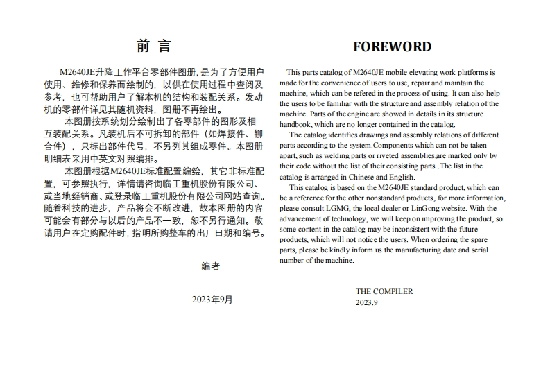 临工M2640JE零部件手册找手册网3小时前发布关注私信2.12MB126页038临工M2640JE零部件手册此内容为付费资源,请付费后查看¥29¥31黄金会员免费钻石会员免费立即购买您当前未登录!建议登陆后购买,可保存购买订单付费资源 第1页 / 共126页 第2页 / 共126页 第3页 / 共126页 第4页 / 共126页 第5页 / 共126页 第6页 / 共126页 第7页 / 共126页 第8页 / 共126页 第9页 / 共126页 第10页 / 共126页 试读已结束,还剩116页,您可下载完整版后进行离线阅读 THE END柳工/临工 文本预览 M2640JE升降工作平台零部件图册M2640JE MOBILE ELEVATING WORK PLATFORMS PARTSCATALOG订货号:M0810T0WDQ0AE3002|车号:*P393100001-*P393100006临工重机股份有限公司LINGONG HEAVY MACHINERY CO.,LTD. 查看更多 收起部分 喜欢就支持一下吧收藏