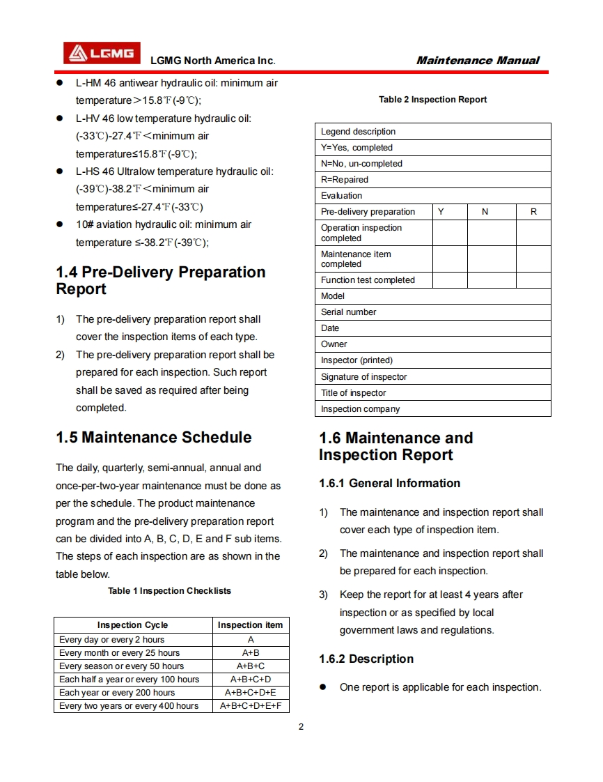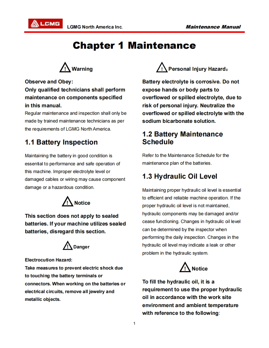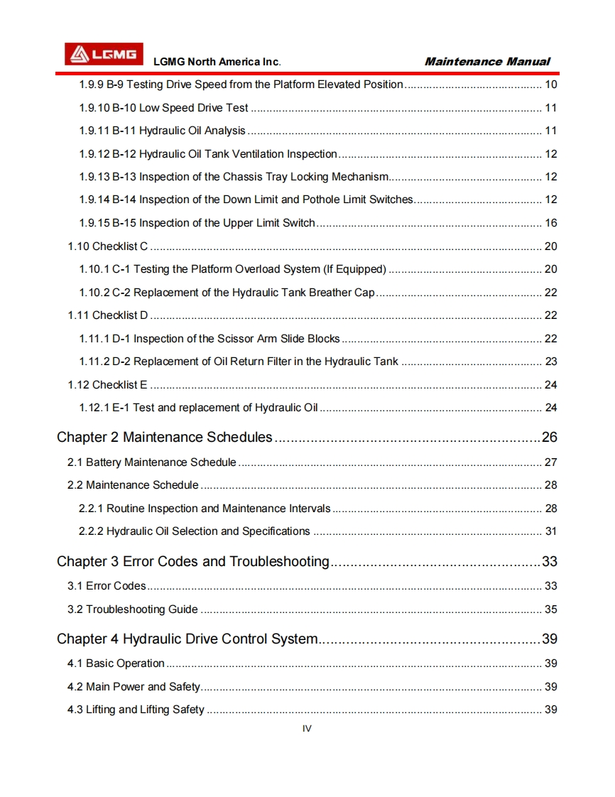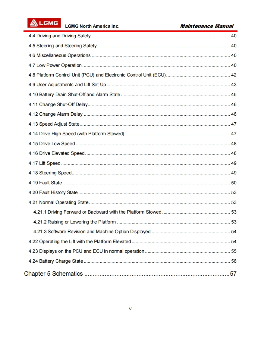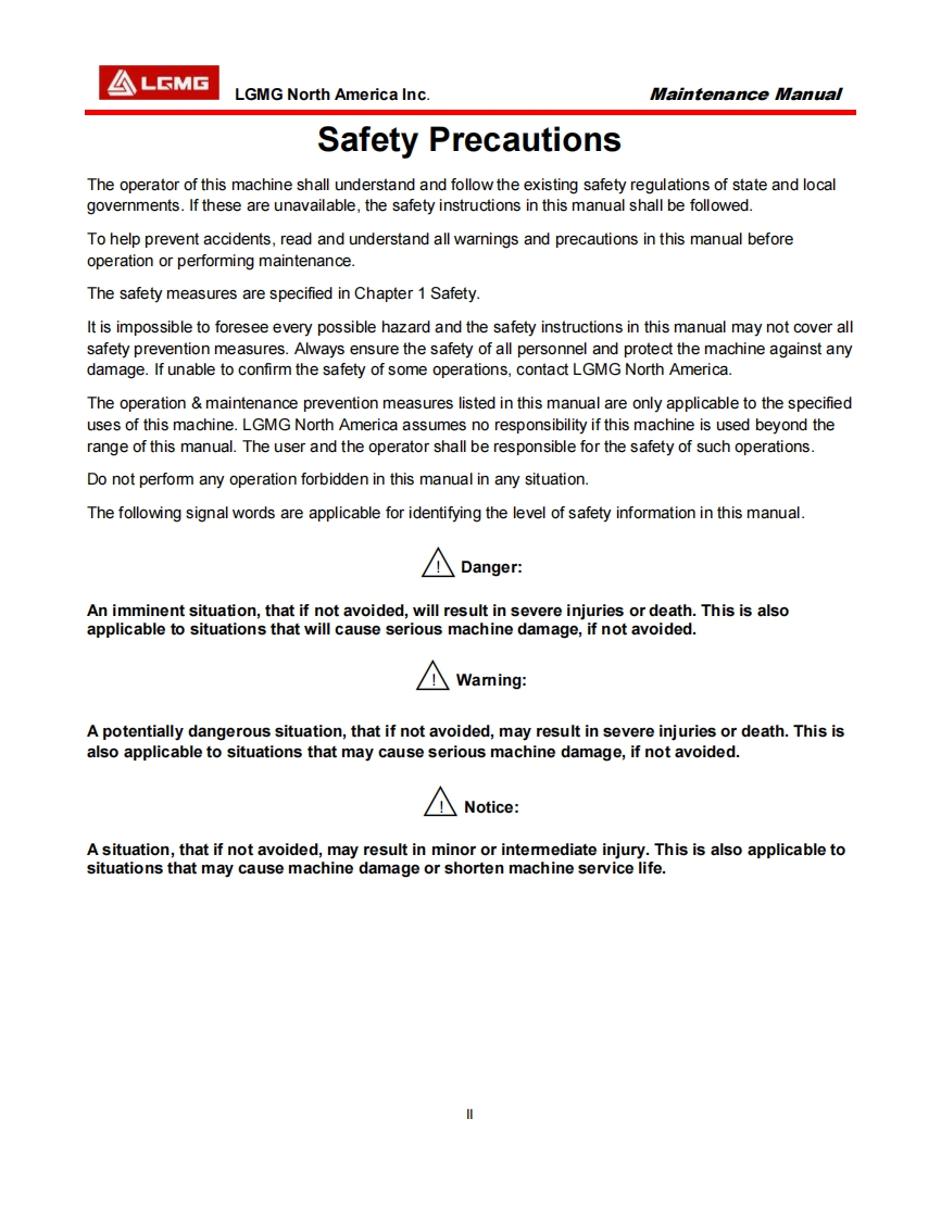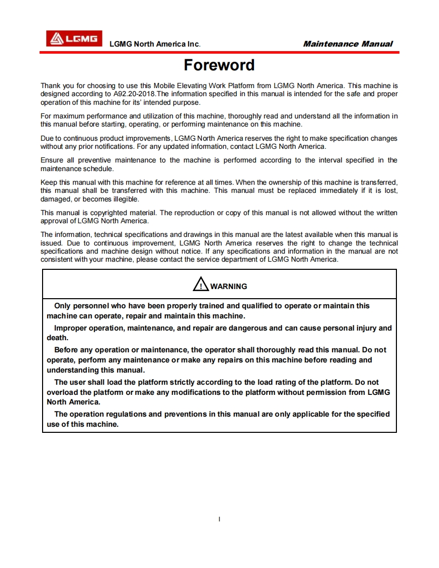 LGMGLGMG North America Inc.Service ManualSS1230E/SS1432E/SS1932E/AS1930E/AS1932E/AS2632E/AS2646E/AS3246E/AS4046E/AS4650E/AS1930/AS1932/AS2632/AS2646/AS3246/AS4046/AS4650Mobile Elevating Work PlatformANSIWARNINGBefore operation and maintenance,thedrivers and service personnel shallalways read and thoroughly understandall information in this manual.Failure todo so may result in,fatal accidents orpersonal injury.This manual must be kept with thismachine at all times.
