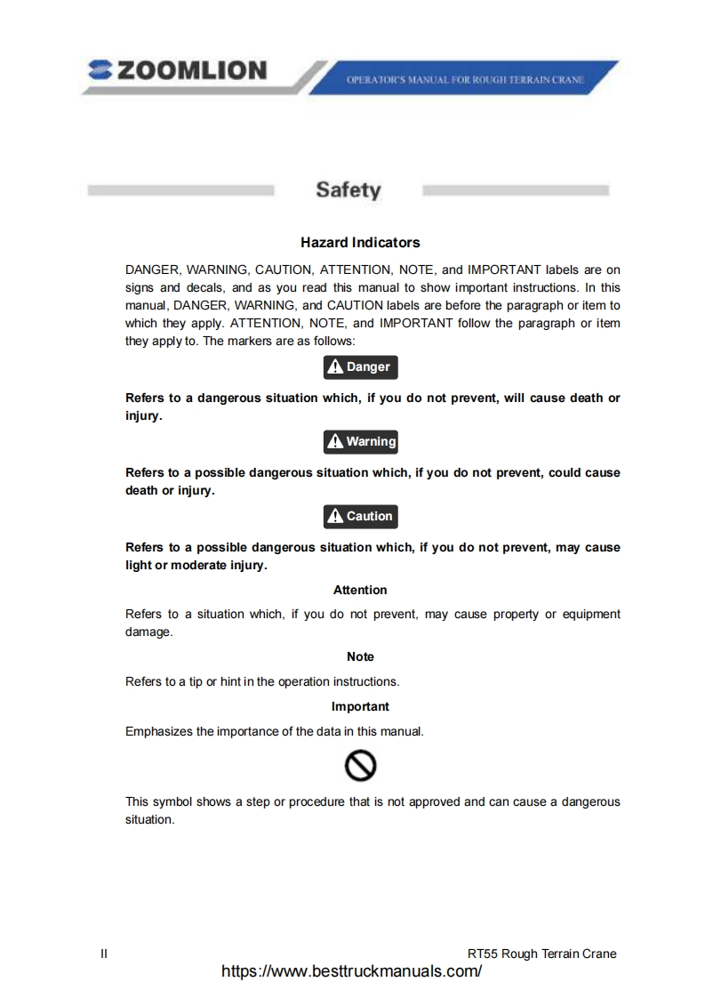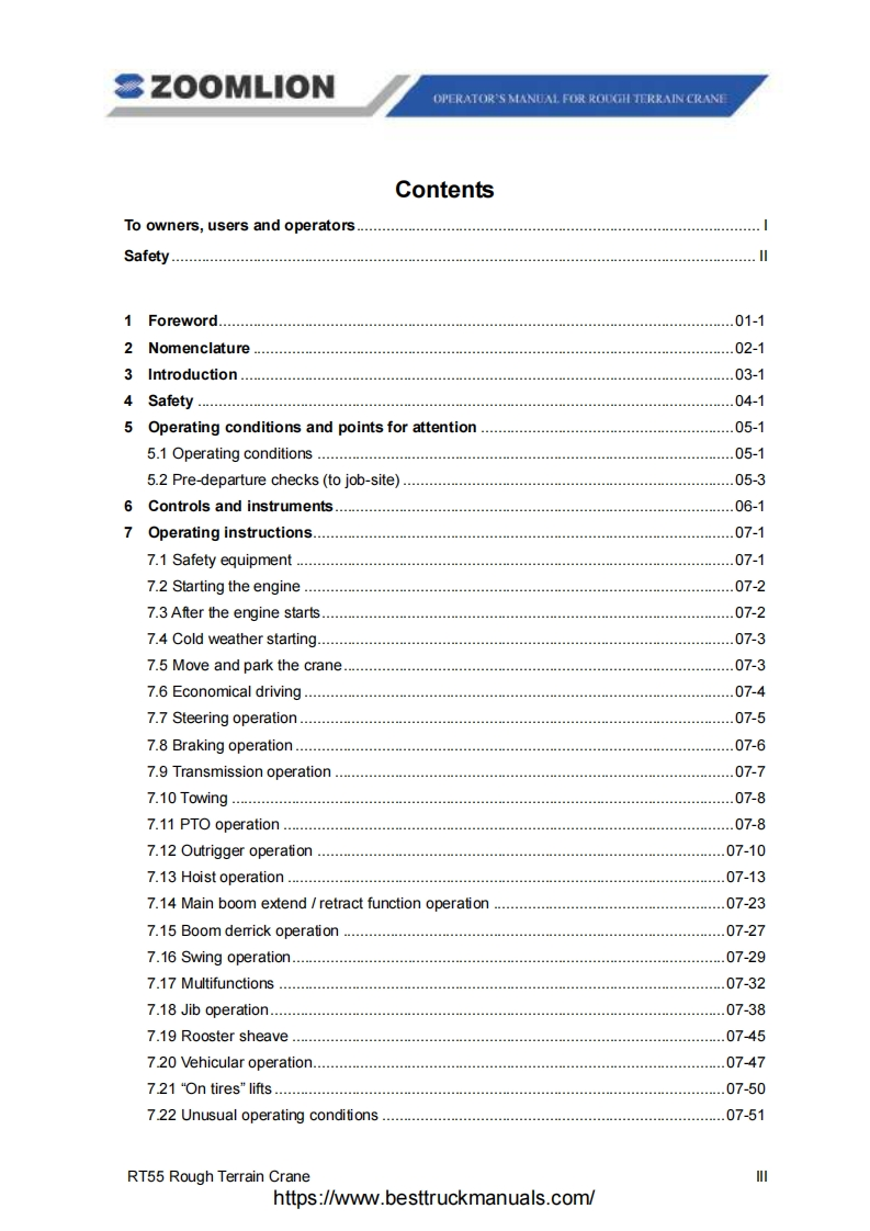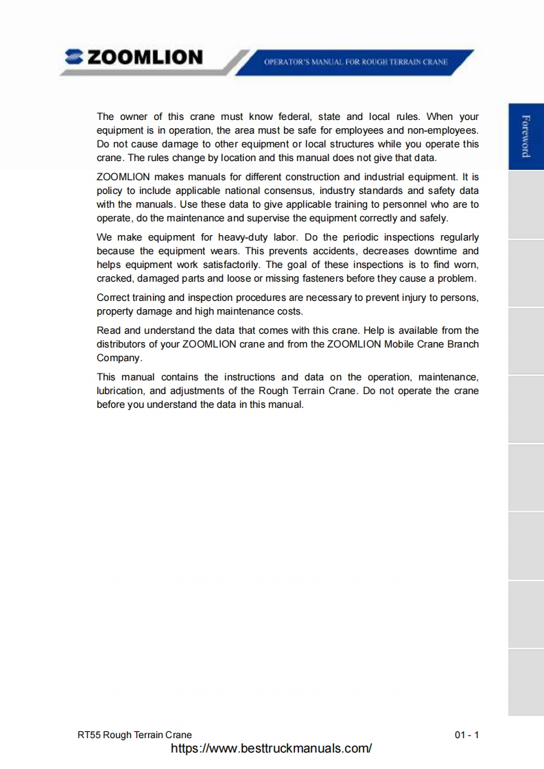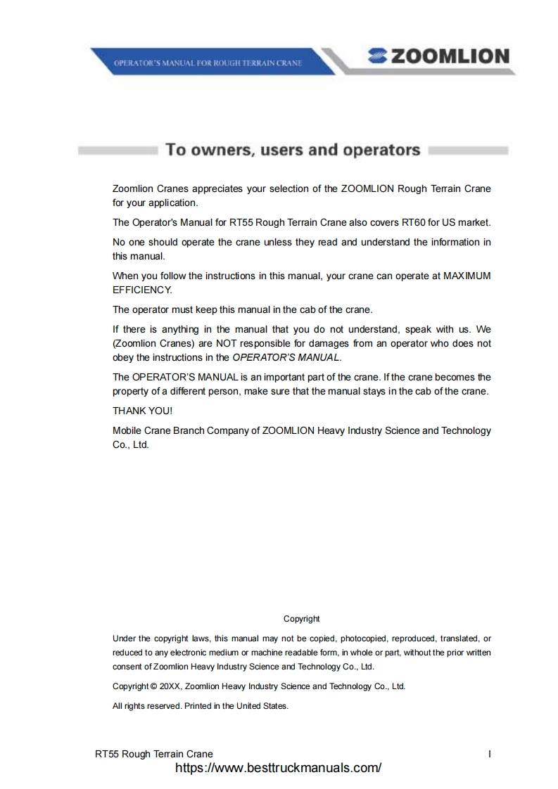 Vision creates futureSZOOMLIONZOOMLIONOPERATOR'S MANUAL FORRT55 ROUGH TERRAIN CRANE200MUON HEAY NDUSTRY SCENCE AND TECHNOLOGY OOULTDChangsha Ecoonic and Toemdogical DevdepmentZone.Hunan Proince CnaPostoode:410131ZOOMLION HEAWY NDUSTRY SCIENCE AND TECHNOLOGY OOLTDhttps://www.besttruckmanuals .com/