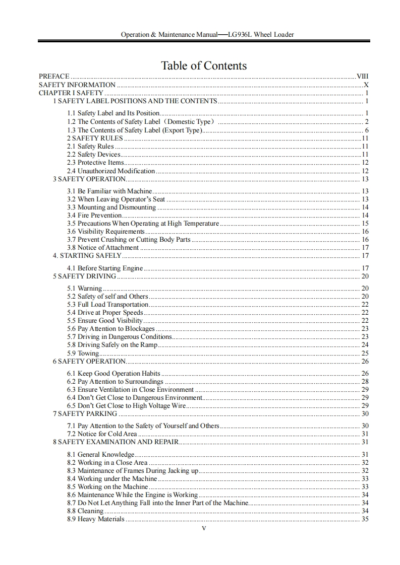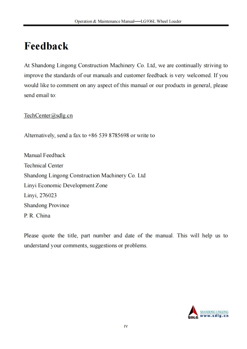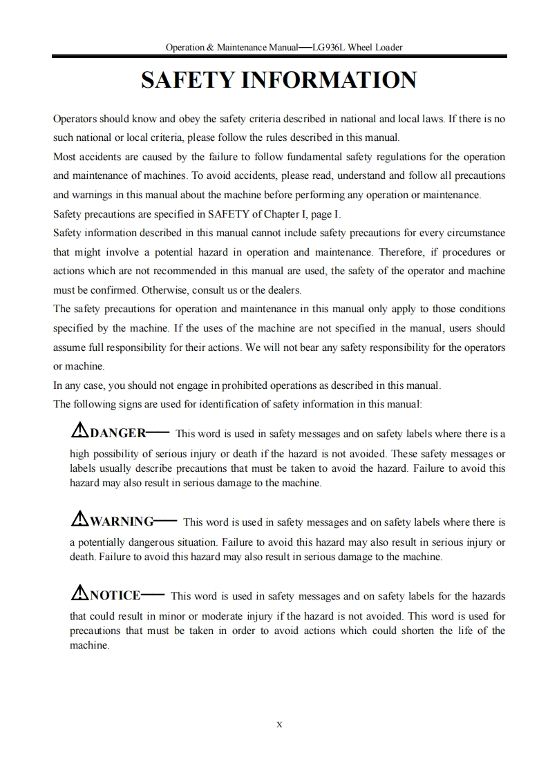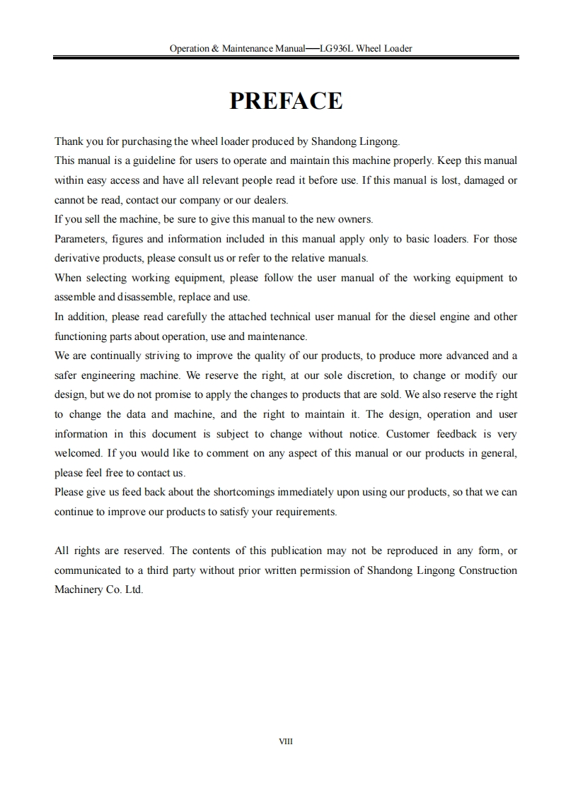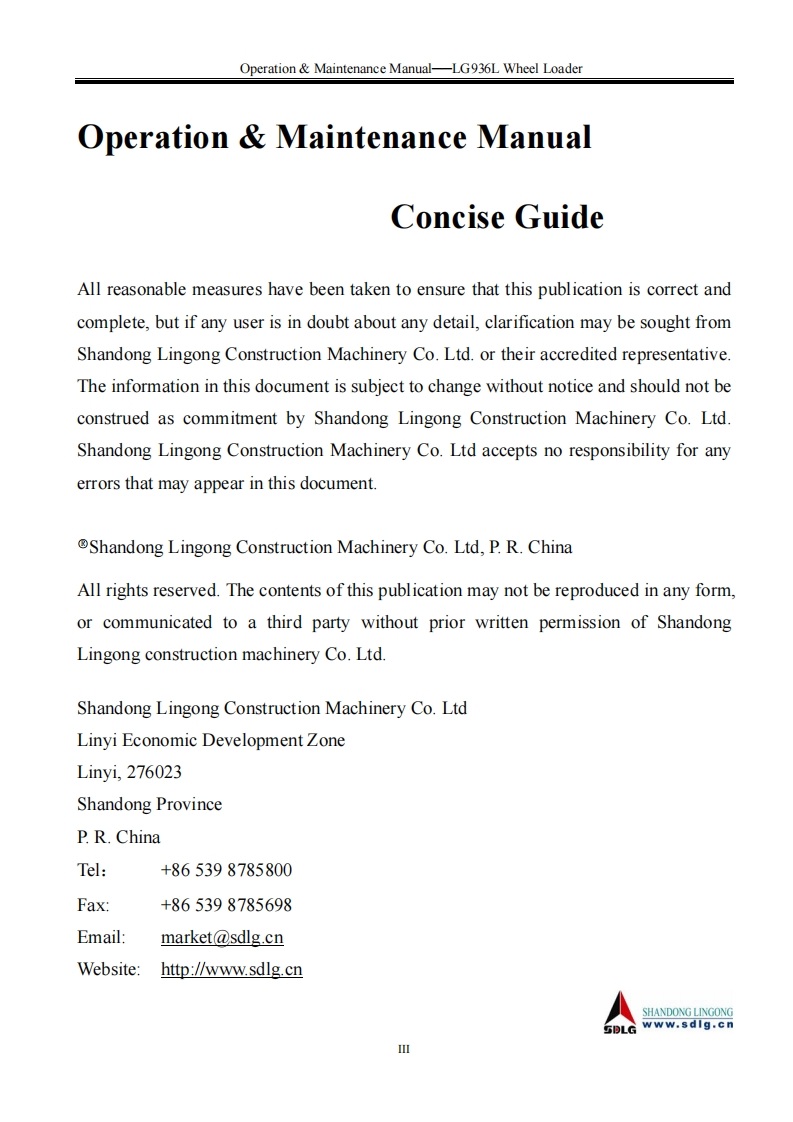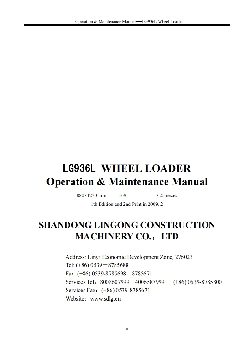 SHANDONG LNGONG★★LG Member of Volvo's GroupN AT o POperation Maintenance ManualLG936LWHEEL LOADERWARNINGOperators and maintenance persons should read this manualcarefully and understand these instructions before use toavoid serious accident.For the convenience of relevantpeople using this manual,it should be easily accessable andkept in readable condition.SHANDONG LINGONG CONSTRUCTION MACHINERY CO.,LTD