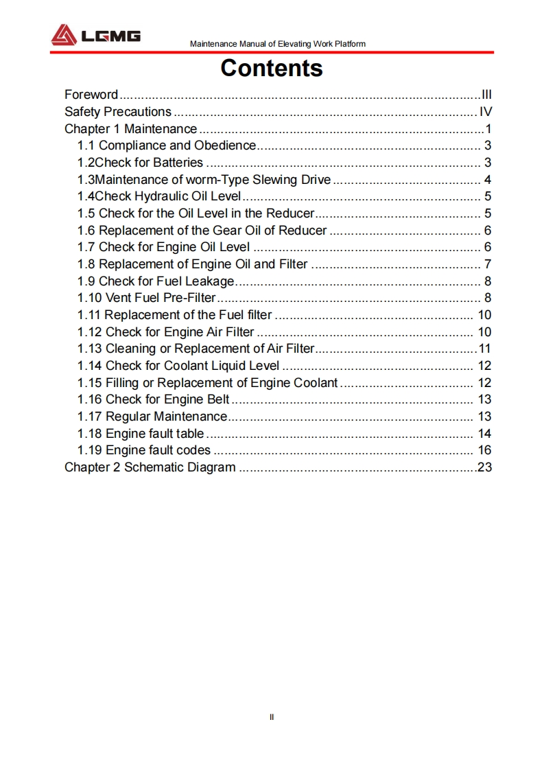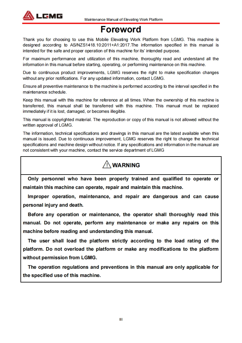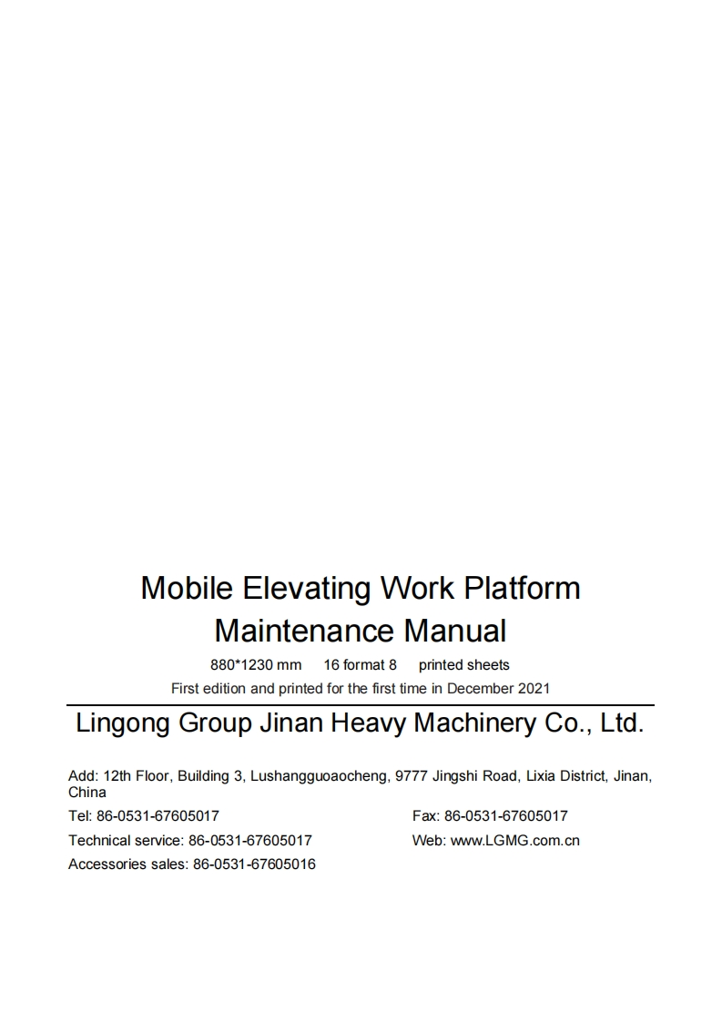 LGMGMaintenance ManualAR16JMobile Elevating Work Platform△WarningBefore operation and maintenance,thedrivers and service personnel shallalways read and thoroughly understandall information in this manual.Failure todo so may result in,fatal accidents orpersonal injury.This manual must be kept with thismachine at all times..LINGONG GROUP JINAN HEAVY MACHINERY CO.,LTD.