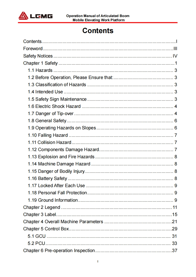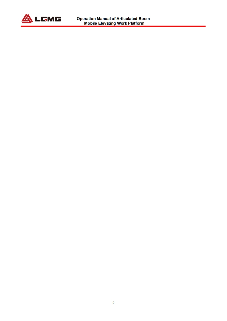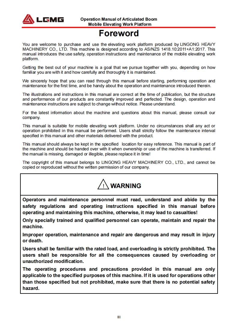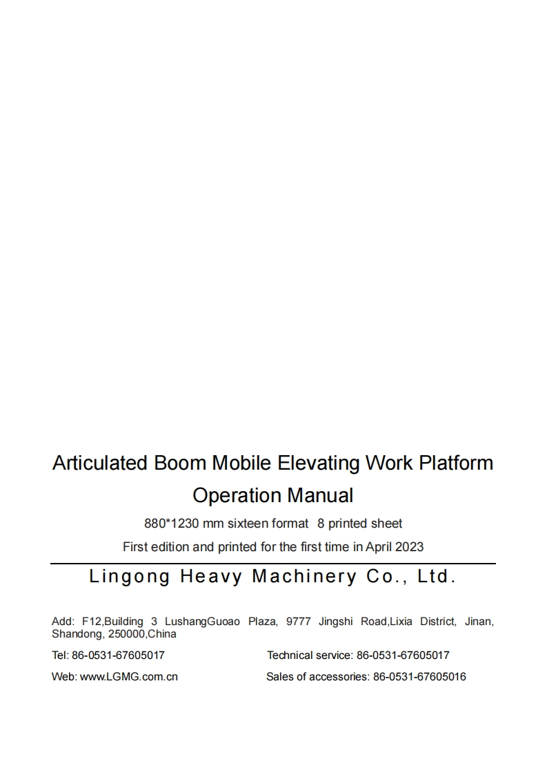 LGMGOperation ManualAR20JArticulated BoomMobile Elevating Work Platform△WARNINGBefore operation and maintenance,thedrivers and service personnel shallalways read and thoroughly understandall information in this manual.Failure todo so may result in,fatal accidents orpersonal injury.This manual must be kept with thismachine at all times.LINGONG HEAVY MACHINERY CO.,LTD.