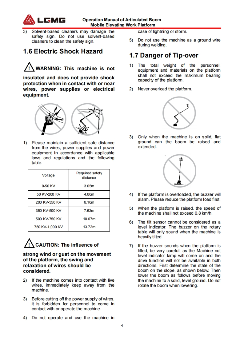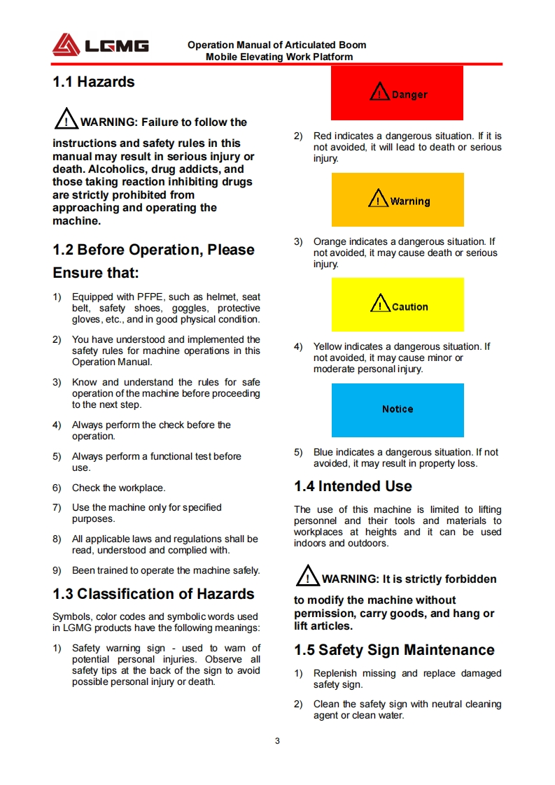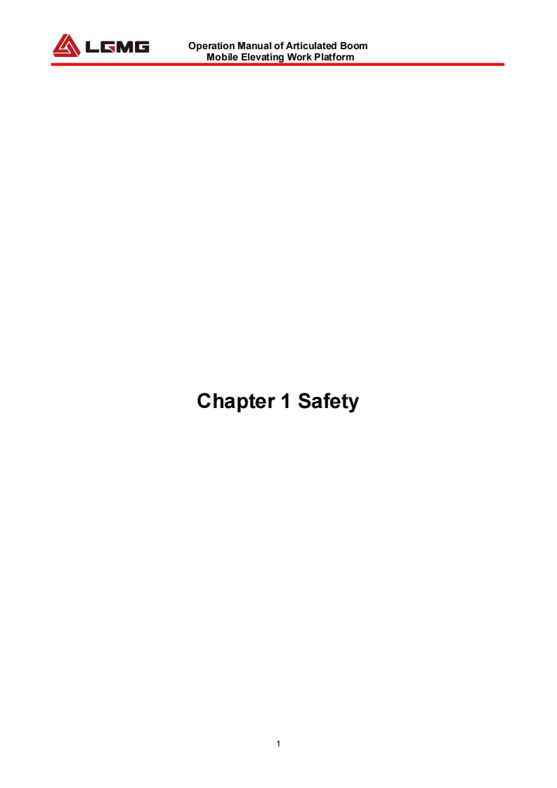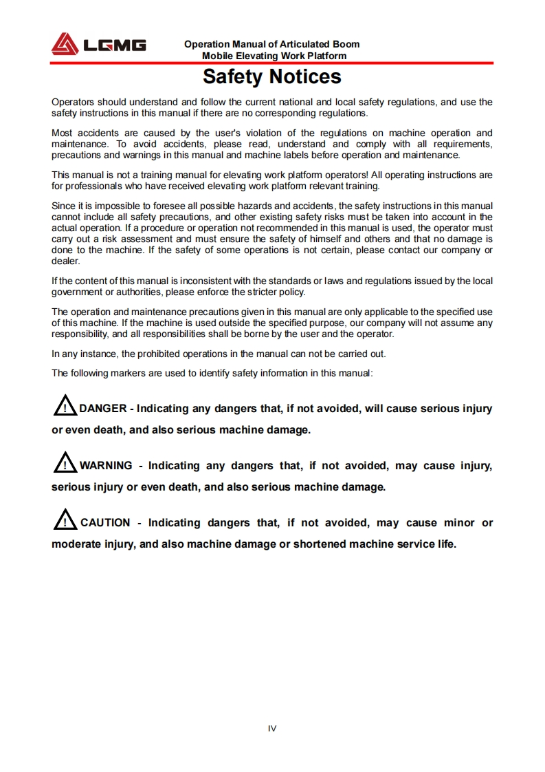 LGMGOperation ManualAR20JArticulated BoomMobile Elevating Work Platform△WARNINGBefore operation and maintenance,thedrivers and service personnel shallalways read and thoroughly understandall information in this manual.Failure todo so may result in,fatal accidents orpersonal injury.This manual must be kept with thismachine at all times.LINGONG HEAVY MACHINERY CO.,LTD.