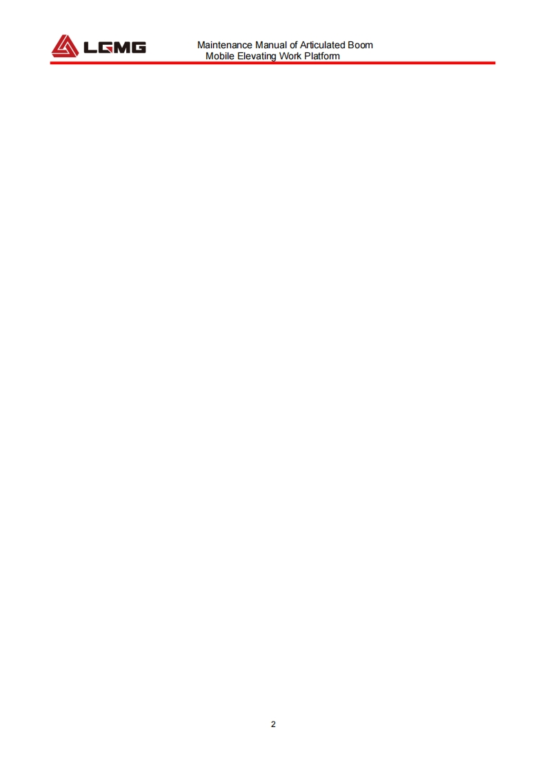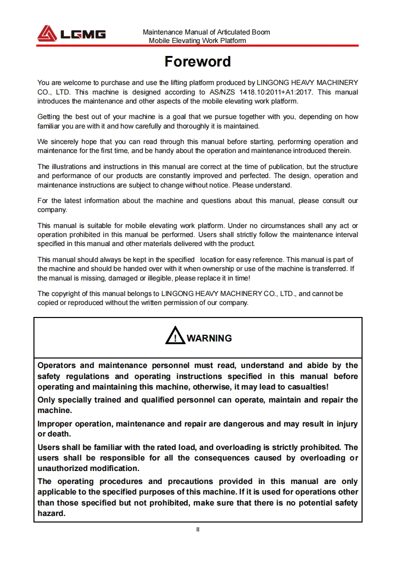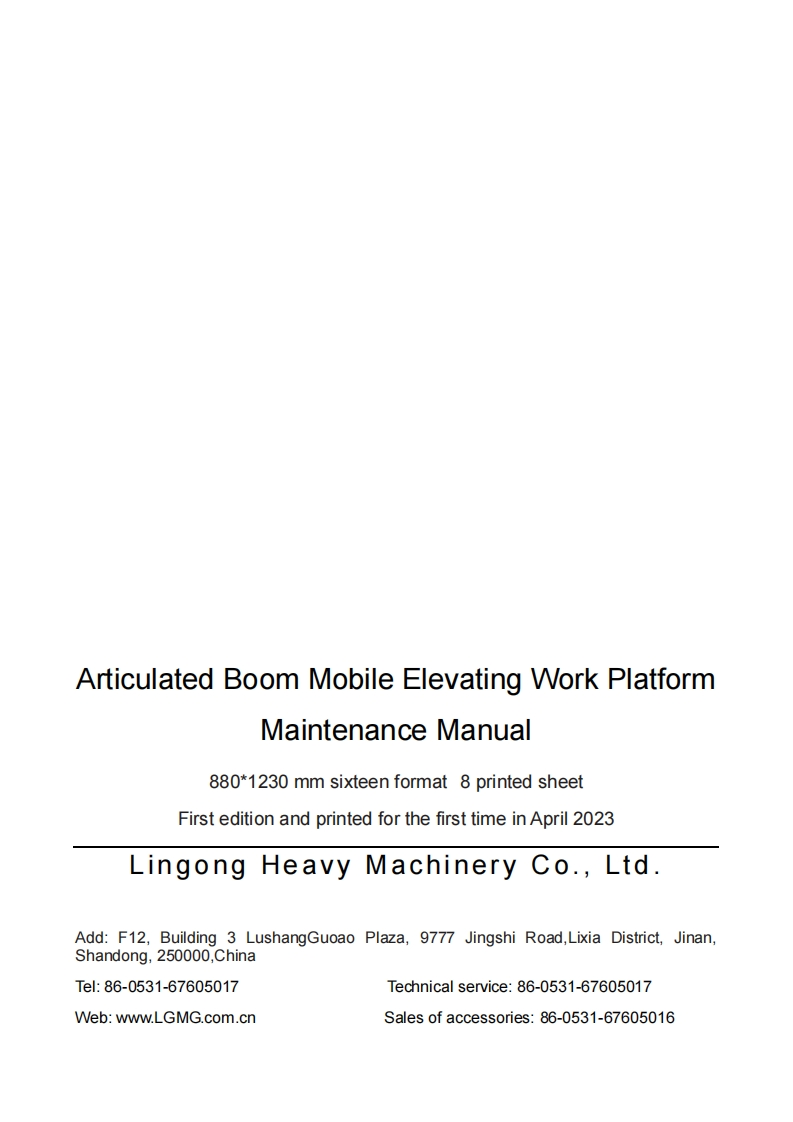 LCMGMaintenance manualAR20JArticulated BoomMobile Elevating Work Platform△WARNINGBefore operation and maintenance,thedrivers and service personnel shallalways read and thoroughly understandall information in this manual.Failure todo so may result in,fatal accidents orpersonal injury.This manual must be kept with thismachine at all times.LINGONG HEAVY MACHINERY CO.,LTD.