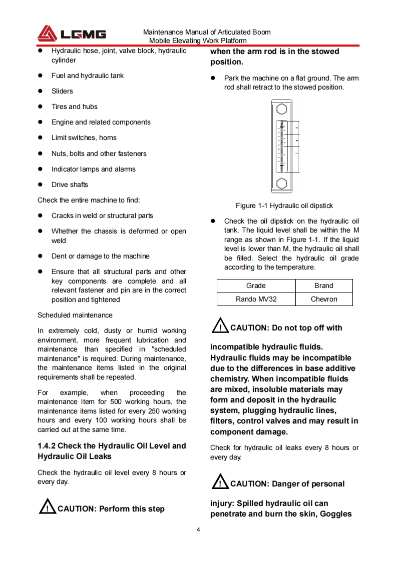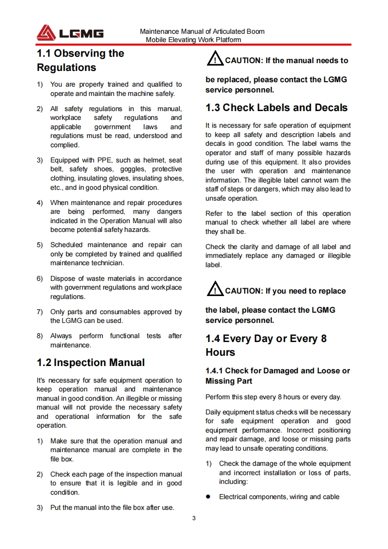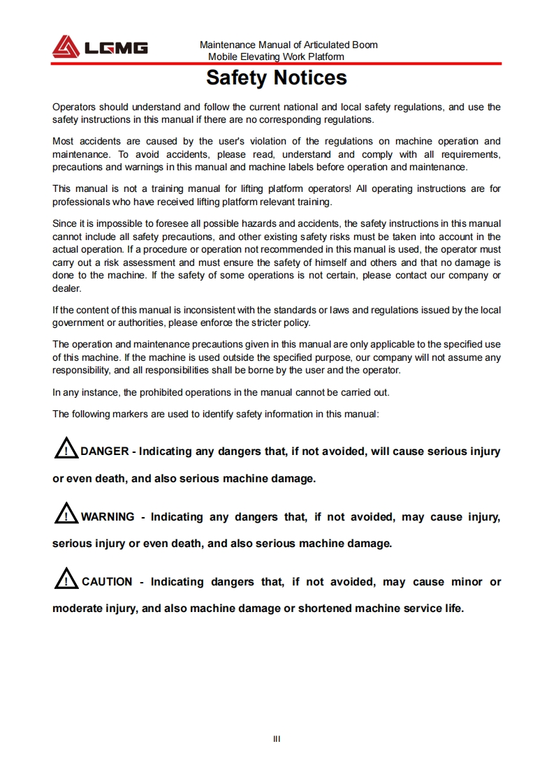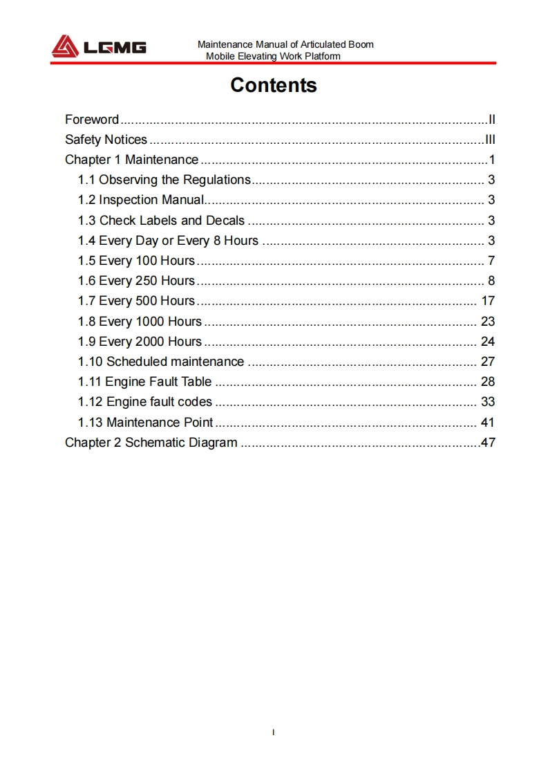 LCMGMaintenance manualAR20JArticulated BoomMobile Elevating Work Platform△WARNINGBefore operation and maintenance,thedrivers and service personnel shallalways read and thoroughly understandall information in this manual.Failure todo so may result in,fatal accidents orpersonal injury.This manual must be kept with thismachine at all times.LINGONG HEAVY MACHINERY CO.,LTD.
