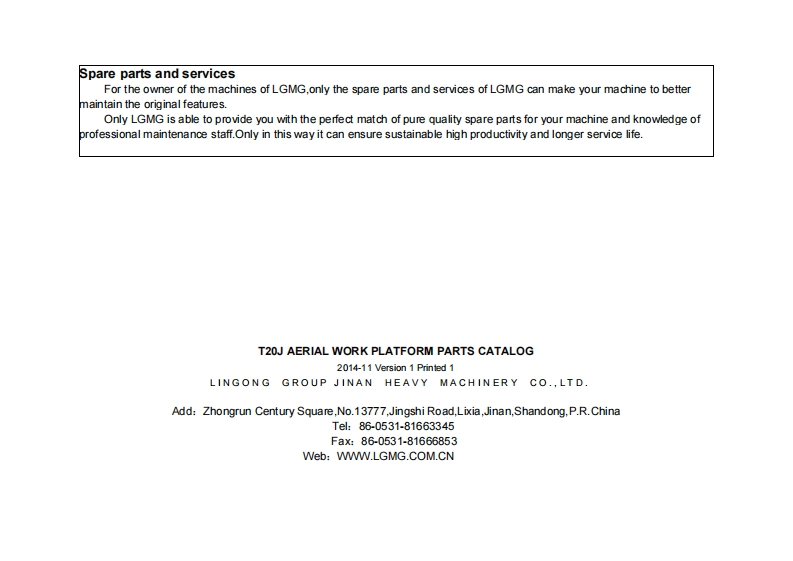 山东临工Parts-Manual-T20J零部件目录手册找手册网3小时前发布关注私信12.40MB268页034山东临工Parts-Manual-T20J零部件目录手册此内容为付费资源,请付费后查看¥29¥31黄金会员免费钻石会员免费立即购买您当前未登录!建议登陆后购买,可保存购买订单付费资源 第1页 / 共268页 第2页 / 共268页 第3页 / 共268页 第4页 / 共268页 第5页 / 共268页 第6页 / 共268页 第7页 / 共268页 第8页 / 共268页 第9页 / 共268页 第10页 / 共268页 试读已结束,还剩258页,您可下载完整版后进行离线阅读 THE END柳工/临工 文本预览 T20J AERIAL WORK PLATFORMPARTS CATALOGLGMGLINGONG GROUP JINAN HEAVY MACHINERY CO.,LTD. 查看更多 收起部分 喜欢就支持一下吧收藏