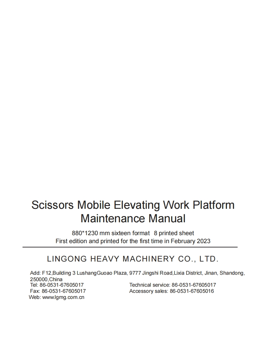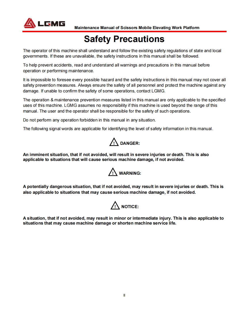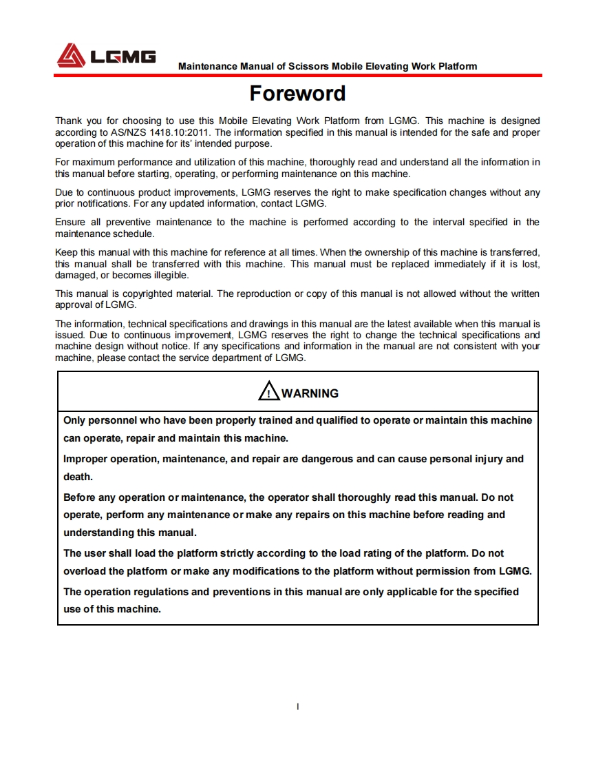 LGMGMaintenance ManualScissors Mobile Elevating Work PlatformS0607EⅡ/S0608EII/S0808EⅡ/S0812EIⅡS1012EIⅡ/S1212EIⅡ/S1413EIWARNINGBefore operation and maintenance,thedrivers and service personnel shallalways read and thoroughly understandall information in this manual.Failure todo so may result in,fatal accidents orpersonal injury.This manual must be kept with thismachine at all times.