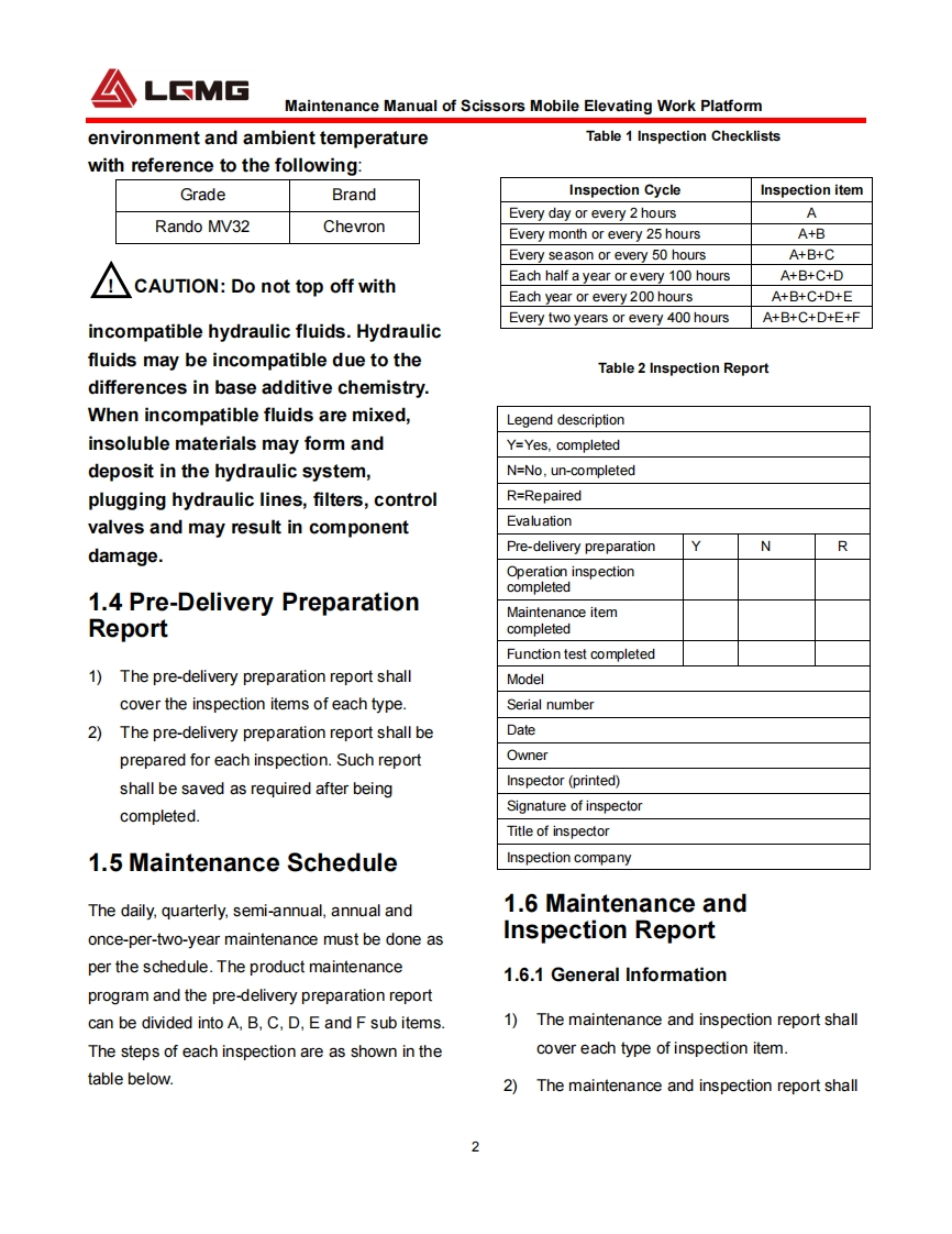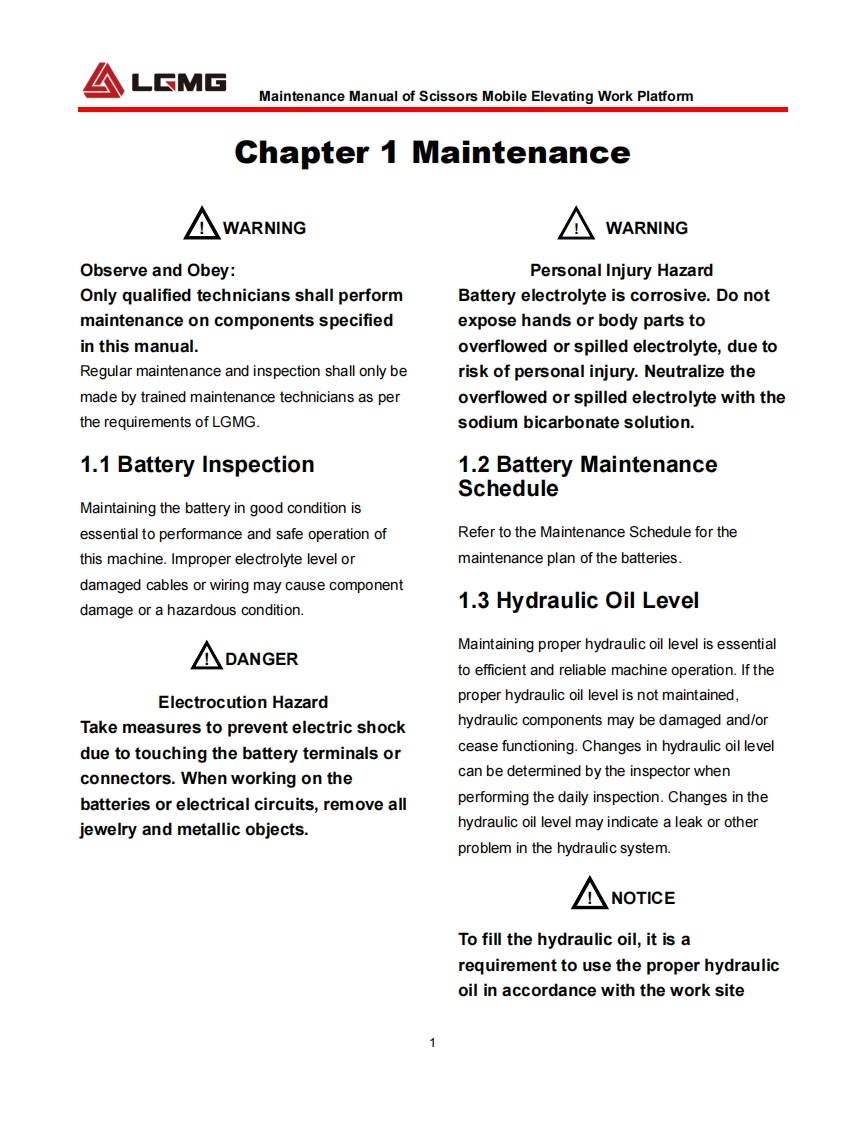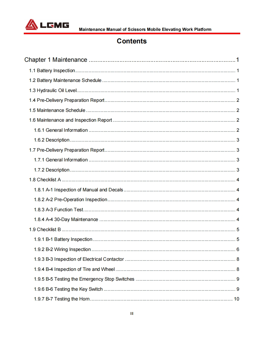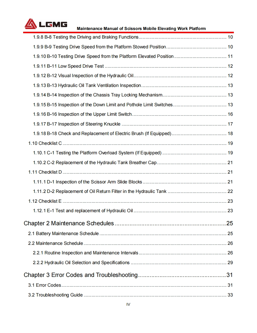 LGMGMaintenance ManualScissors Mobile Elevating Work PlatformS0607EⅡ/S0608EII/S0808EⅡ/S0812EIⅡS1012EIⅡ/S1212EIⅡ/S1413EIWARNINGBefore operation and maintenance,thedrivers and service personnel shallalways read and thoroughly understandall information in this manual.Failure todo so may result in,fatal accidents orpersonal injury.This manual must be kept with thismachine at all times.