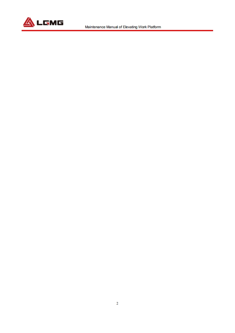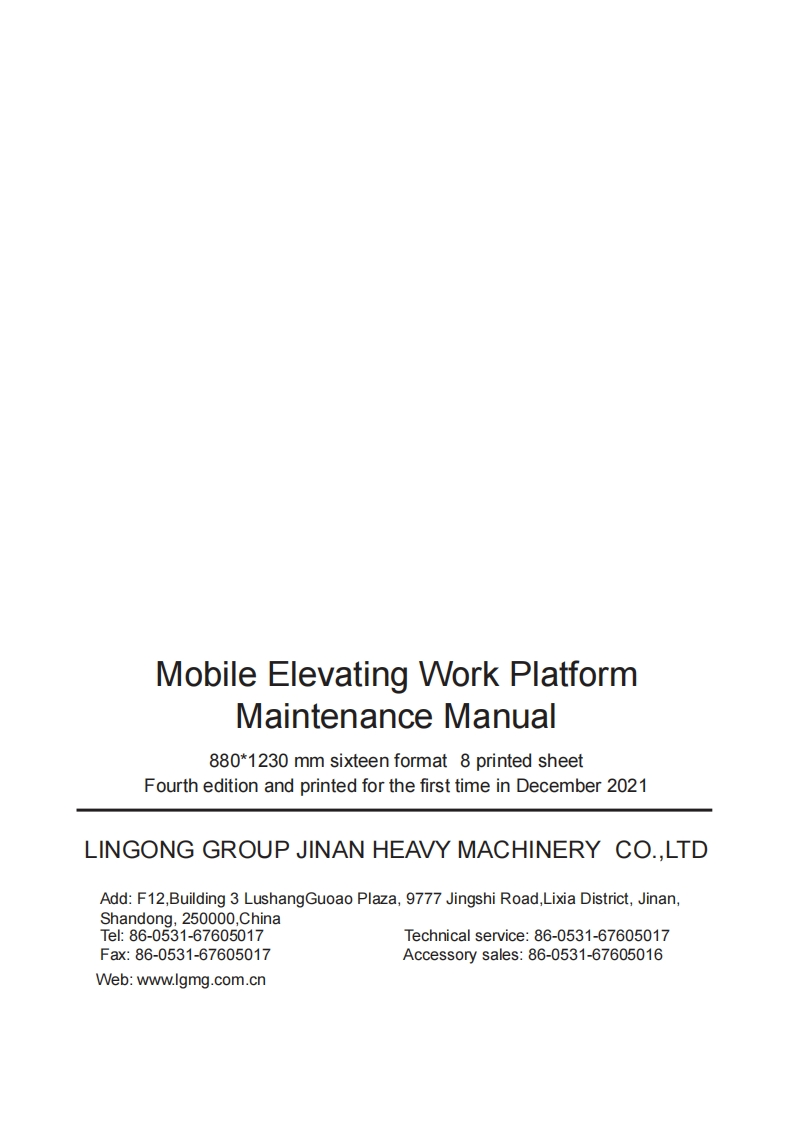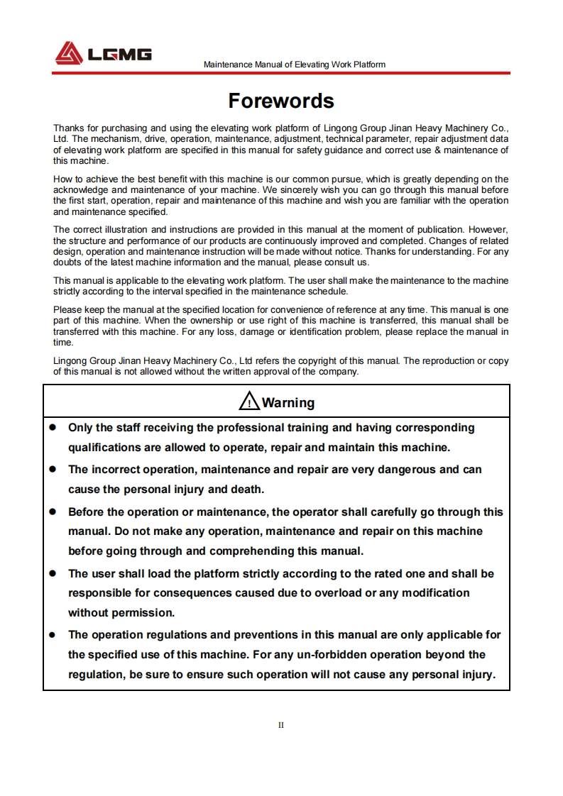 LGMGMaintenance ManualSS0407E/AS0607E/AS0812E/AS1012E/AS1212E/AS1413EMobile Elevating Work Platform△WarningBefore operation and maintenance,thedrivers and service personnel shallalways read and thoroughly understandall information in this manual.Failure todo so may result in,fatal accidents orpersonal injury.This manual must be kept with thismachine at all times.LINGONG GROUP JINAN HEAVY MACHINERY CO.,LTD.