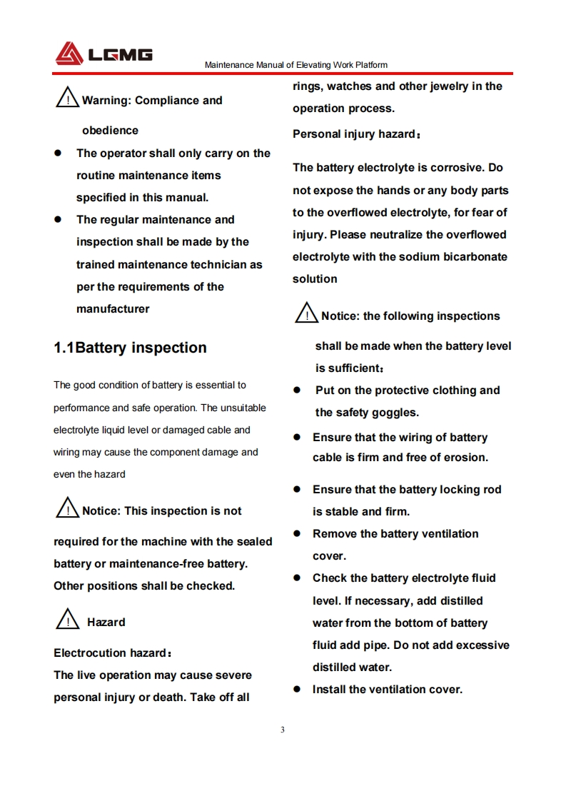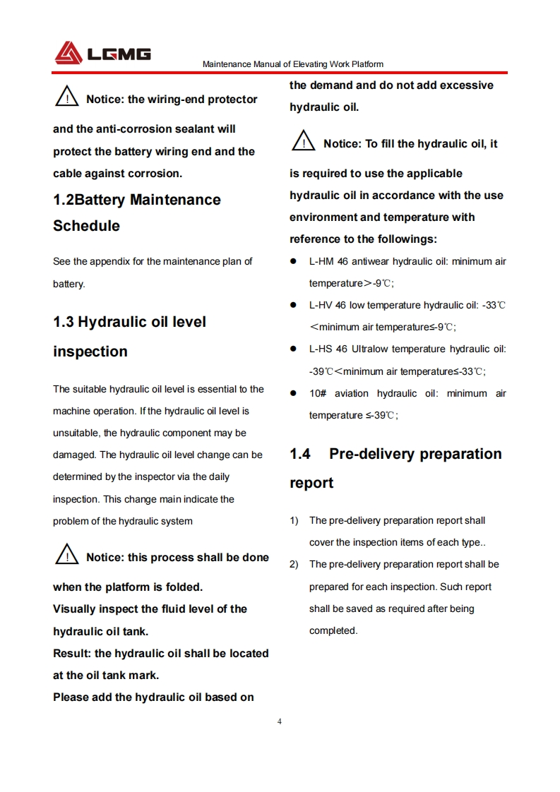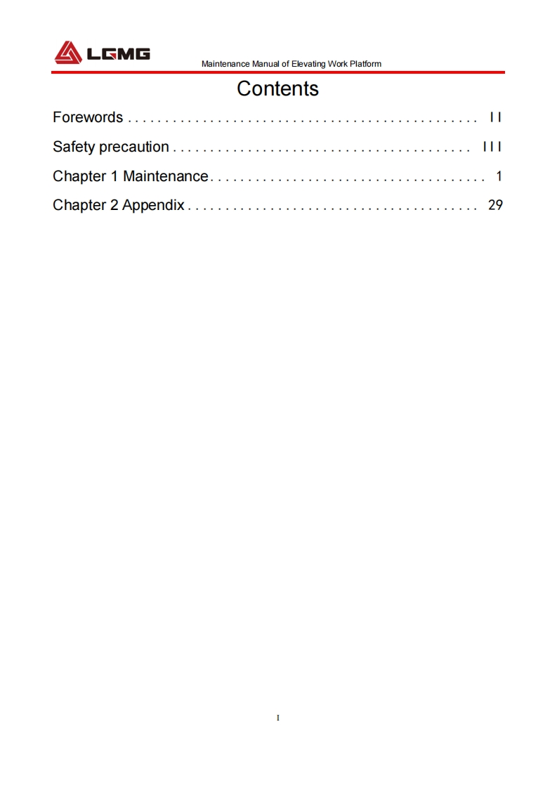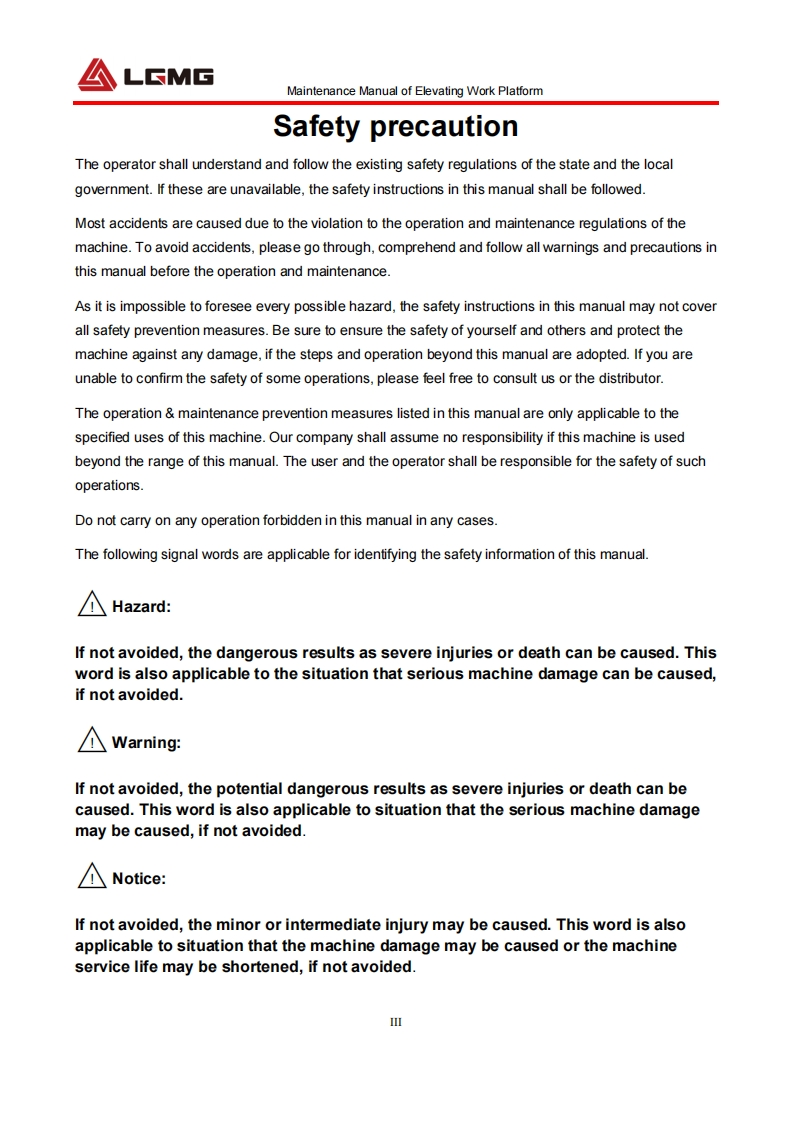 LGMGMaintenance ManualSS0407E/AS0607E/AS0812E/AS1012E/AS1212E/AS1413EMobile Elevating Work Platform△WarningBefore operation and maintenance,thedrivers and service personnel shallalways read and thoroughly understandall information in this manual.Failure todo so may result in,fatal accidents orpersonal injury.This manual must be kept with thismachine at all times.LINGONG GROUP JINAN HEAVY MACHINERY CO.,LTD.