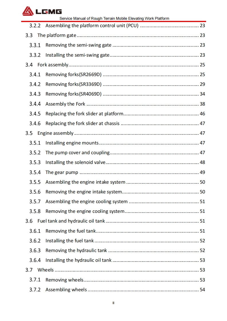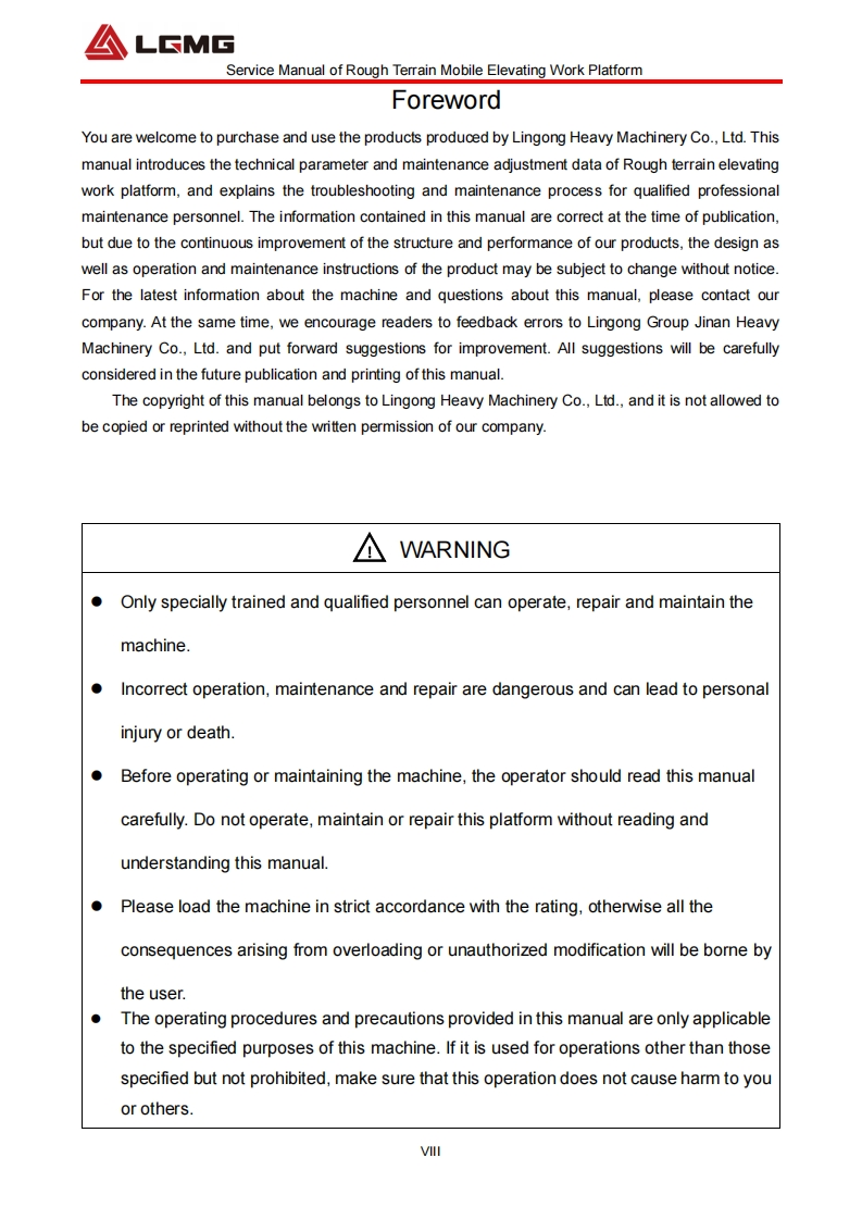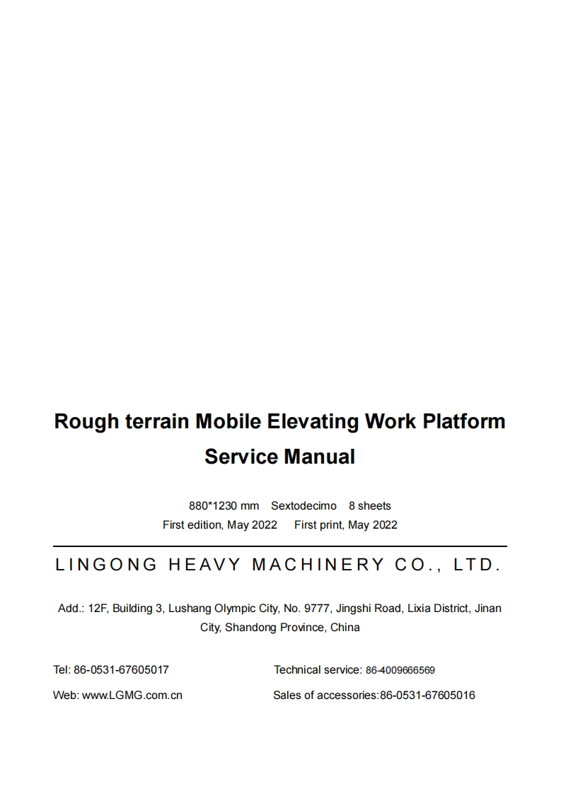 △LSMGService Manua lSR2669D/SR3369D/SR4069DRough terrain Mobi leElevating Work Platform△WARNINGOperators and maintenancepersonnelmustreadandunderstandthismanualbeforeoperatingandmaintaining this machine,otherwise it may lead tocasualties!Thismanualshall be properly kept forreferenceandcheckbyrelevantpersonnel.LINGONG HEAVY MACHINERY CO..LTD.