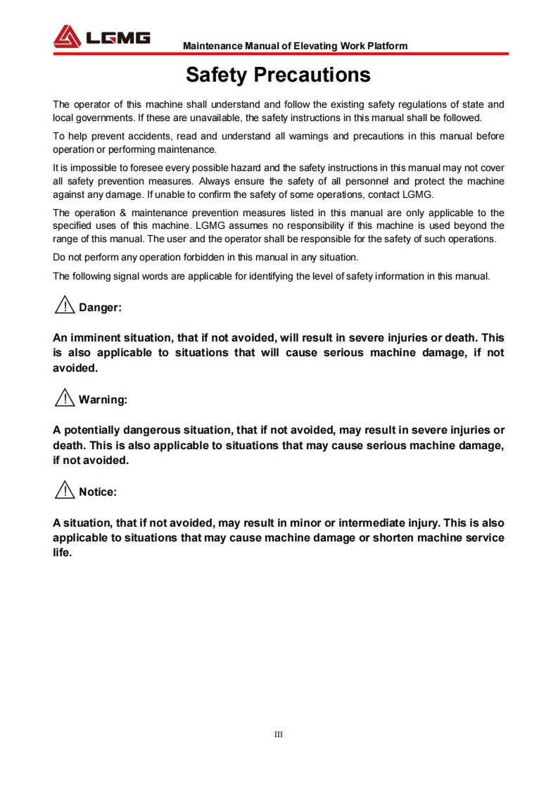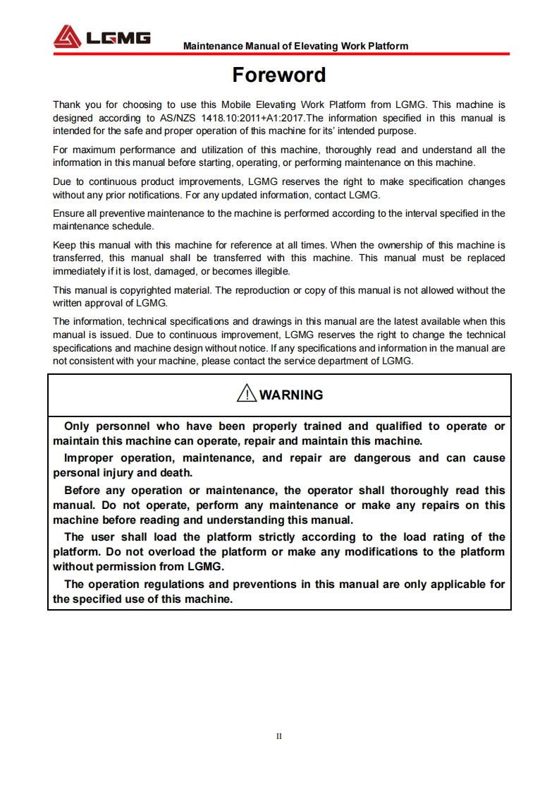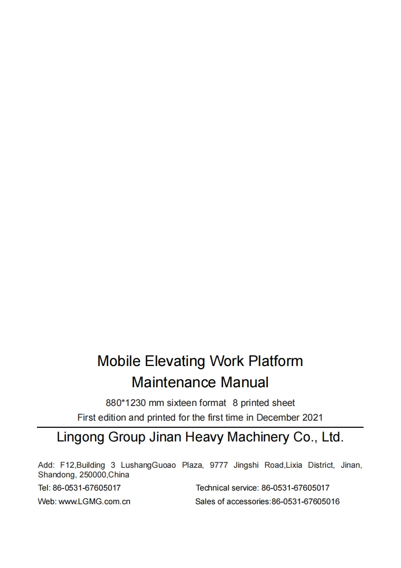LGMGMaintenance ManualT20JMobile Elevating Work Platform△WarningBefore operation and maintenance,thedrivers and service personnel shallalways read and thoroughly understandall information in this manual.Failure todo so may result in,fatal accidents orpersonal injury.This manual must be kept with thismachine at all times.LINGONG GROUP JINAN HEAVY MACHINERY CO.LTD.