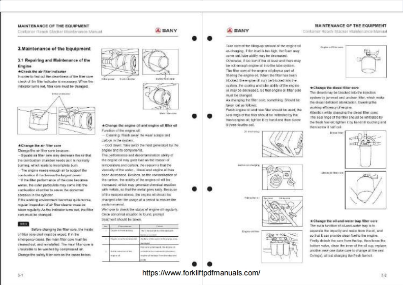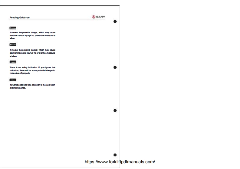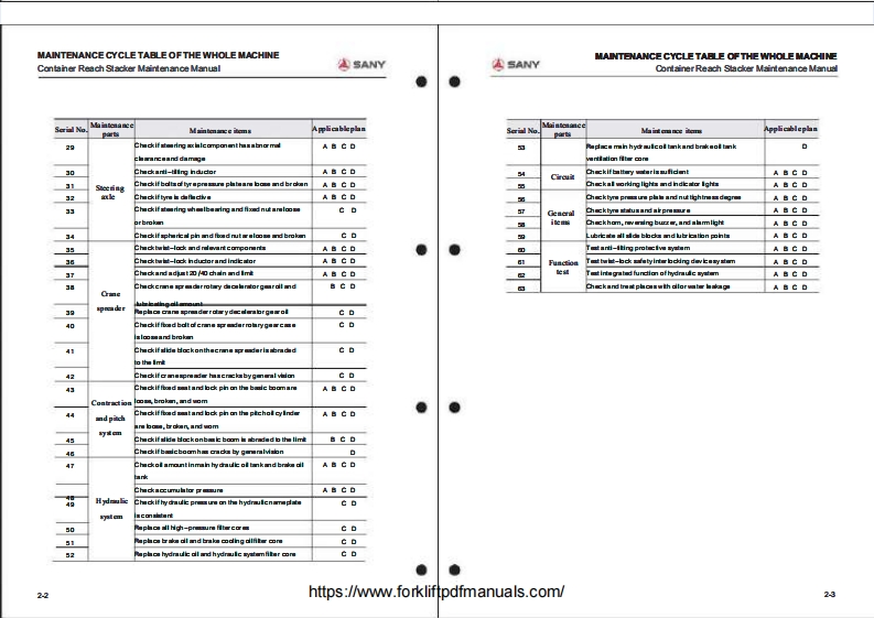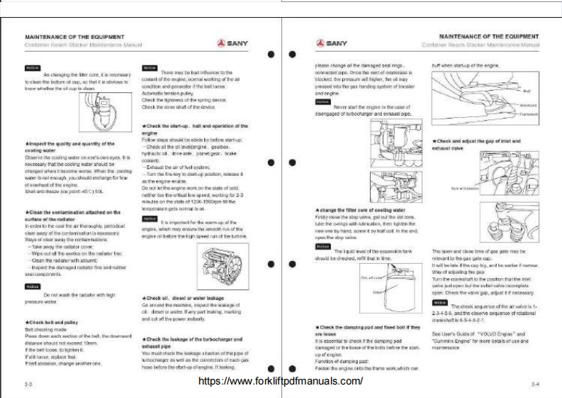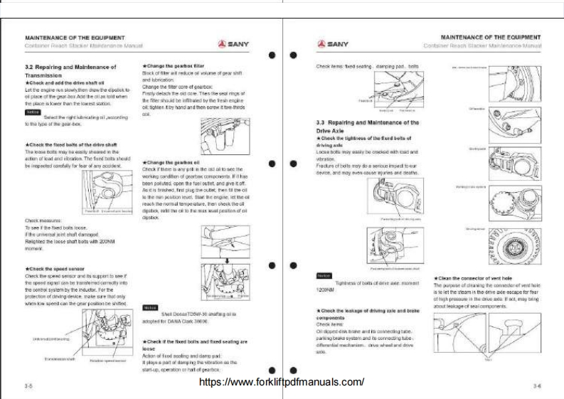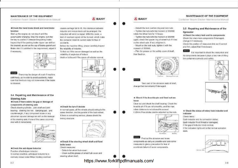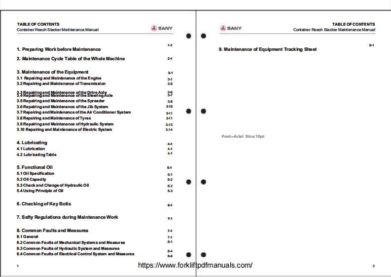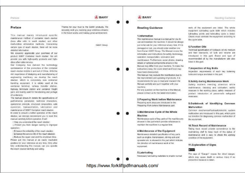 ASANYMAINTENANCE MANUAL集装葡正面吊运机址护于母CONTAINER REACH STACKER⊙CONTENTS1.Preparing Work before Maintenance2.Maintenance Cyde Table of the Whole Machine3.Maintenance ofthe EquipmentSANY4.Lubricating5.FunctionalOiB.Checking of Key Bolts7.Safty Regulations during Maintenance Work8.Common Faults and Measures9.Maintenance of Equipment Tracking Sheethttps://www.forkliftpdfmanuals.com/