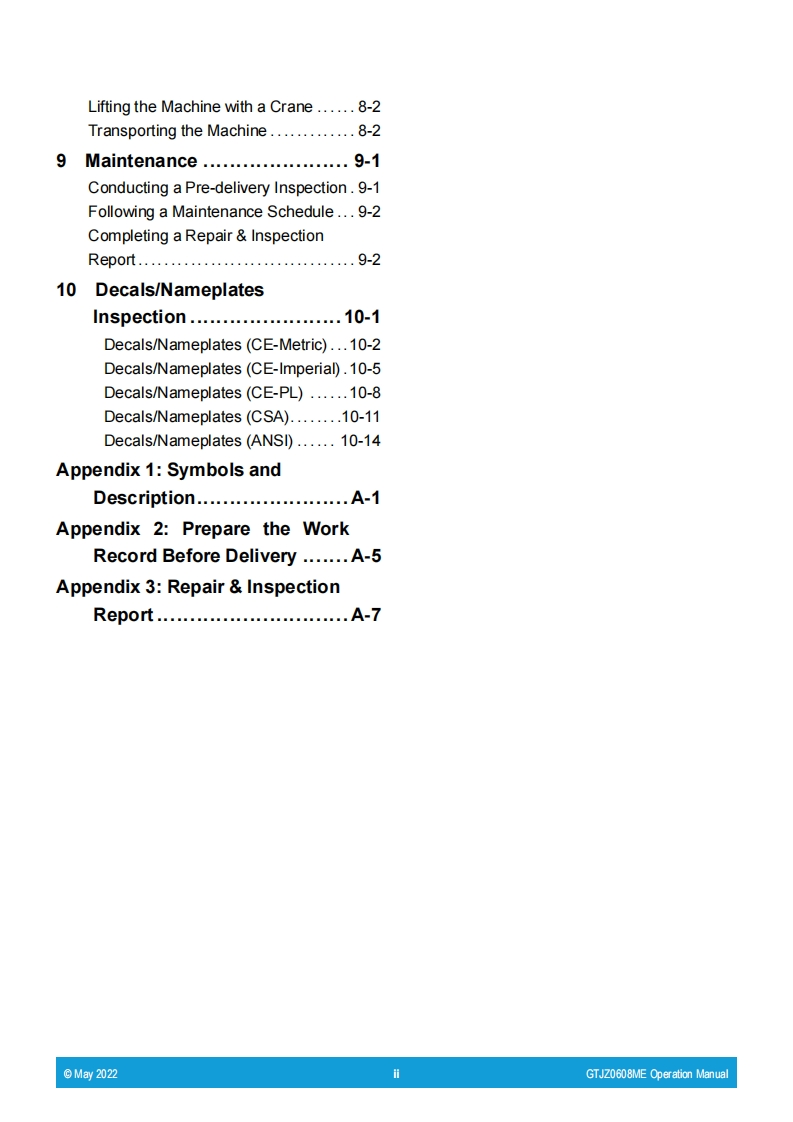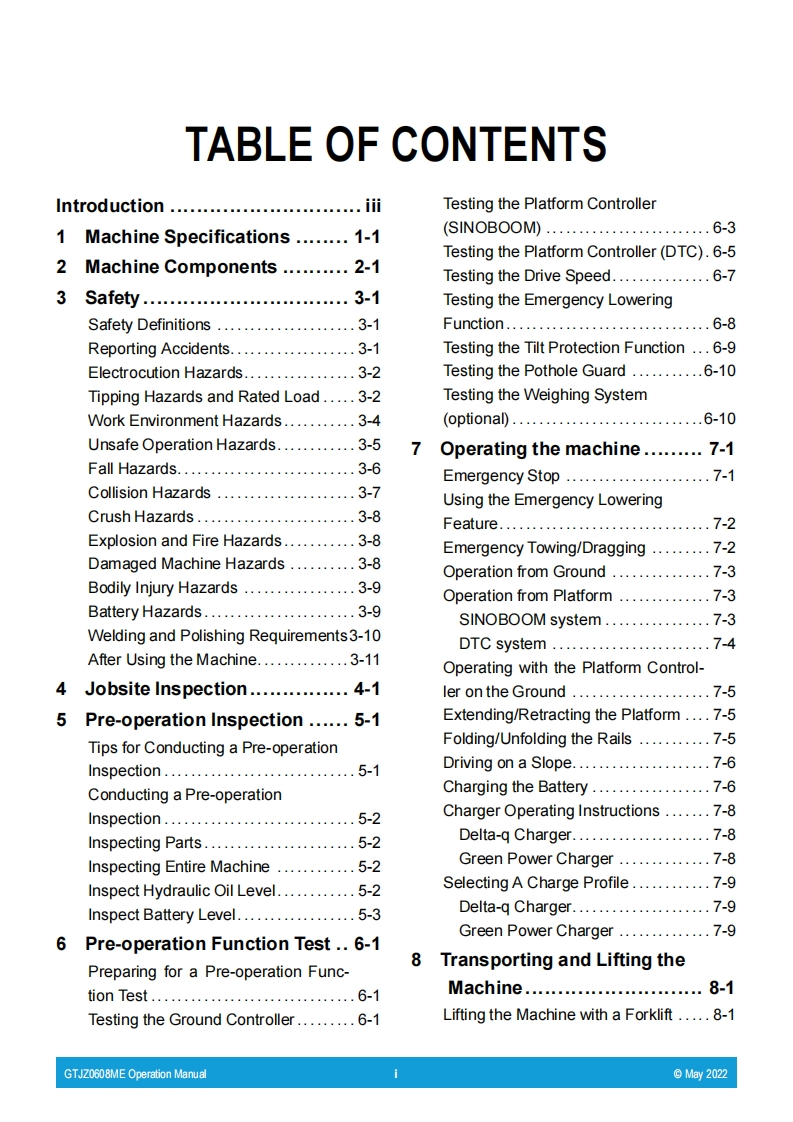 GTJZ0608ME-Operation-Manual操作与维护手册-PL_update找手册网6小时前发布关注私信21.79MB94页020GTJZ0608ME-Operation-Manual操作与维护手册-PL_update此内容为付费资源,请付费后查看¥29¥31黄金会员免费钻石会员免费立即购买您当前未登录!建议登陆后购买,可保存购买订单付费资源 第1页 / 共94页 第2页 / 共94页 第3页 / 共94页 第4页 / 共94页 第5页 / 共94页 第6页 / 共94页 第7页 / 共94页 第8页 / 共94页 第9页 / 共94页 第10页 / 共94页 试读已结束,还剩84页,您可下载完整版后进行离线阅读 THE END宝马格/星邦重工 文本预览 Part No.PL501056100002OperationRev:AMay 2022ManualGTJZ0608ME/0608ME/1932MEfor Sinoboom PolandCE ANSI AS/NZS①.ELGB≤ssinoBoom 查看更多 收起部分 喜欢就支持一下吧收藏
