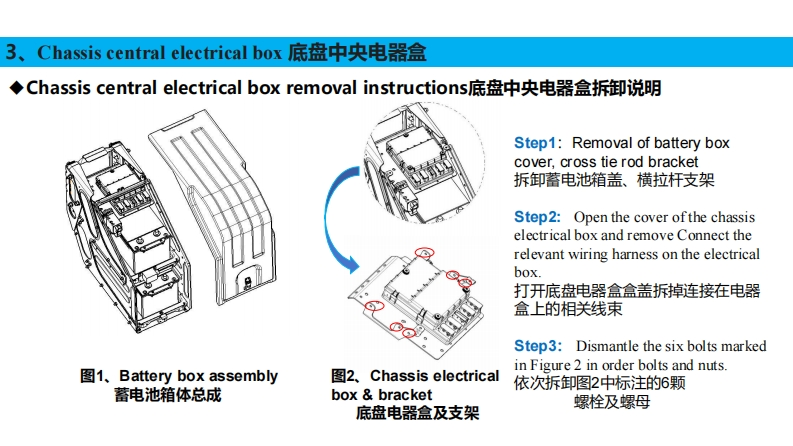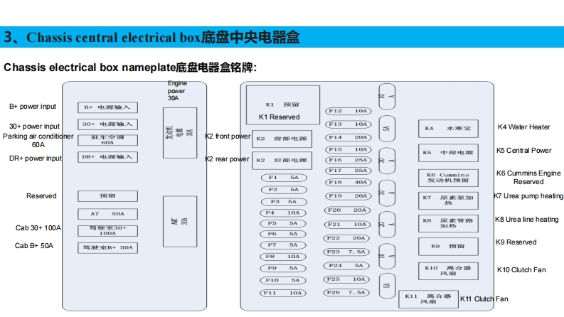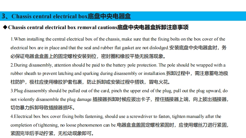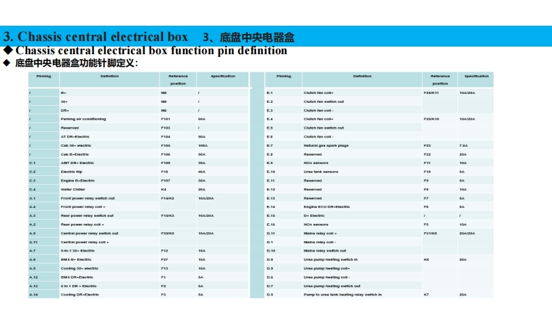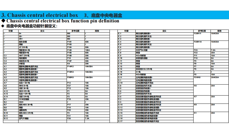 3、Chassis central electrical box底盘中央电器盒◆Chassis central electrical box function introduction底盘中央电器盒功能介绍:The chassis central electrical box contains plate fuse cavity and relay cavity,where the fuse is divided into slow fuse and fast fuse,carrying the role of vehiclepower system distribution and circuit protection.底盘中央电器盒包含板式保险腔和继电器腔体,其中保险分为慢融保险和快融保险,承载着车辆电源系统的分配和电路保护的作用。
