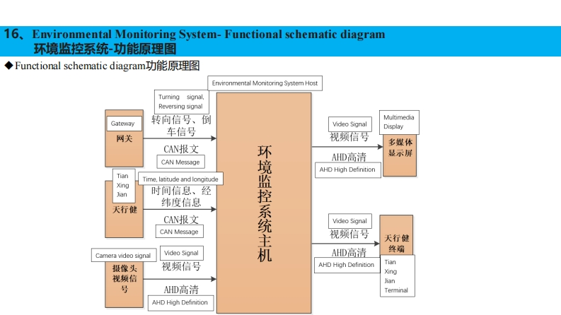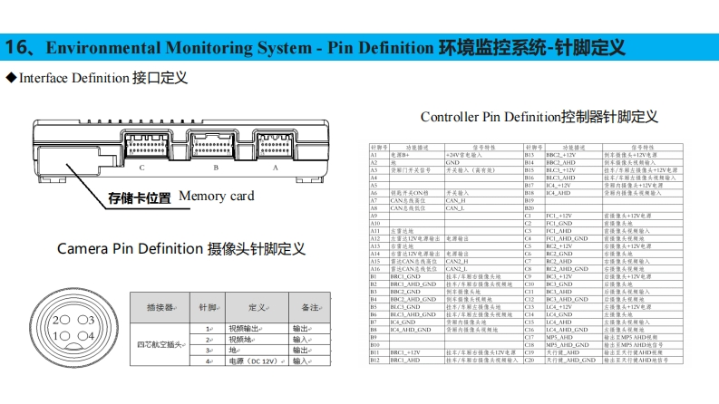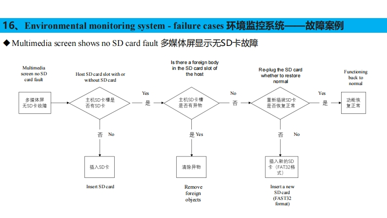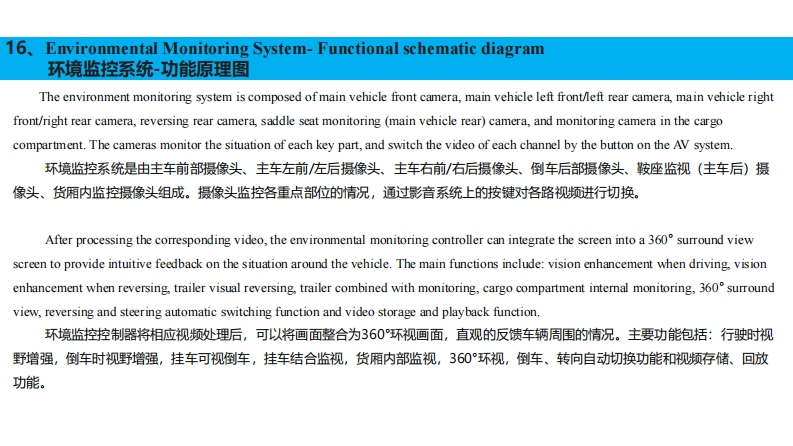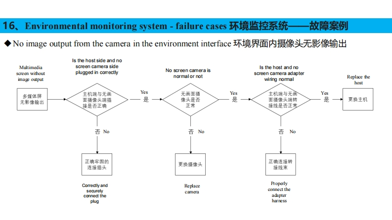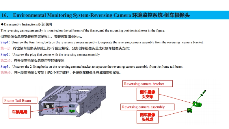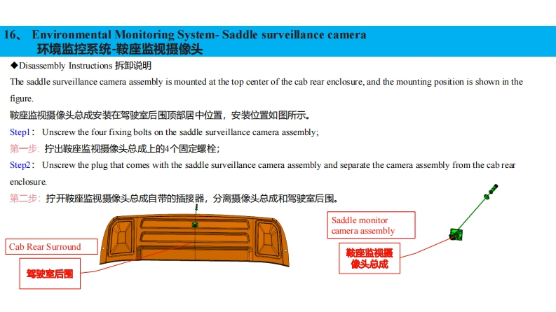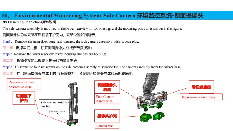 16、Environmental Monitoring System-Front Camera环境监控系统-前摄像头◆Disassembly Instructions拆卸说明The front camera assembly set is mounted on the sunshade bracket in the position shown in the figure.前摄像头总成套装在遮阳罩支架上,安装位置如图所示。Stepl:Remove the sunshade panel.第一步:拆掉遮阳罩面板;Step2:Unscrew the four set screws on the front camera bracket to separate the front camera assembly from the front camera bracket.第二步:拧出前摄像头支架上的4个固定螺丝,分离前摄像头总成与前摄像头支架:Step3:Unscrew the plug that comes with the front camera assembly.第三步:拧开前摄像头总成自带的插接器。前摄像头支架Front camera holder遮阳面前摄像头安装位置前摄像头板Front camera mounting position总成Sunshade panelFront camera assembly