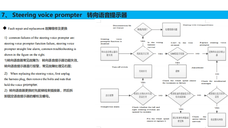 7.Steering voice prompterFunction Principle IntroductionSteering voice is used for vehicle tuming and reversing alarm sound,prompting pedestrians to pay attention to the functionof the following table:序号名称描述DWhen the left (right)turn signal switch is activated,the left (right)steering CAN signal is valid and the voice prompter sounds theLeft and rightalamm "left(right)tum,please pay attention to safety".turn alamm2 by CAN signal ABS EBS left (right)wheel speed value difference for left(right)steering,steering voice prompter reported "left(right)tum,please pay attention to safety"alarm sound2Reverse AlarmWhen the CAN signal in reverse gear is valid,the voice prompter reports "reverse,please pay attention".3Mode SwitchingSmall light (light switch I gear)CAN signal is effective,open the night mode,voice prompt sound pressure level is reduced4Alarm priorityThe voice prompter does not alarm when the hazard emergency switch is tumed on;the voice prompter does not alamm when thevehicle speed is greater than 60km/h;reverse alarm>left and right steering alamSteering Voice Pin Definition:Botisn Dvaaites事由Tw的+24V2KnF和福的435678CAN-H9101112CAN-L