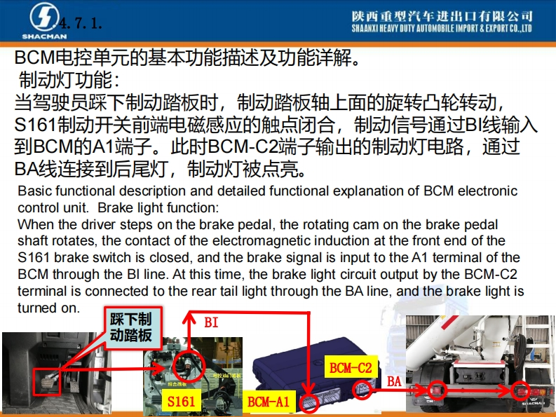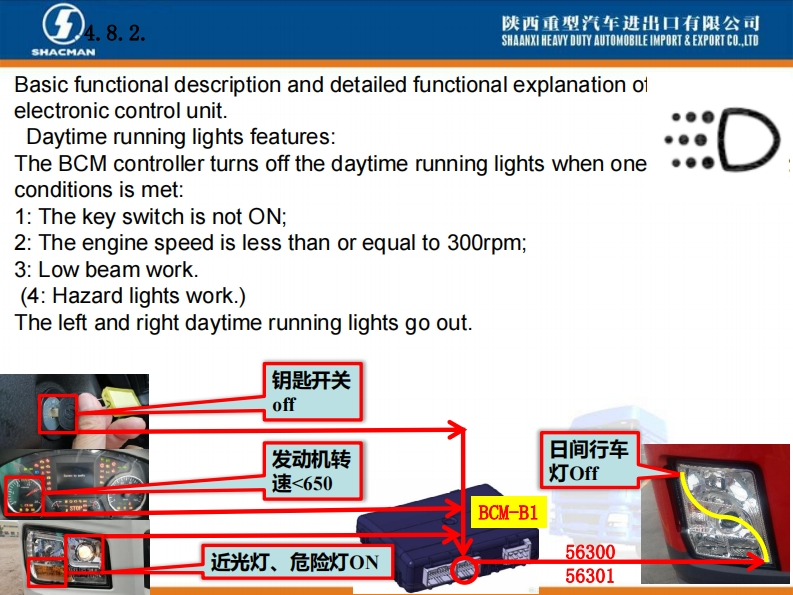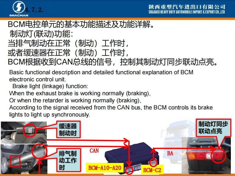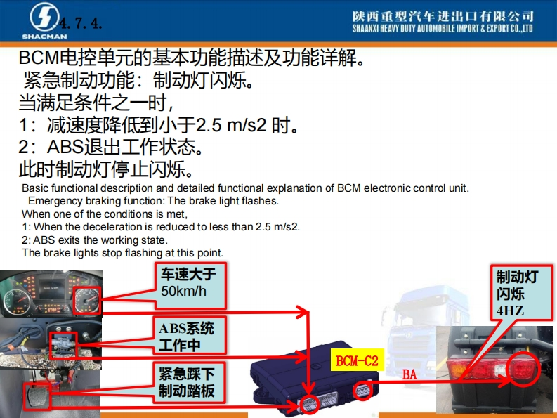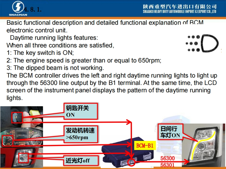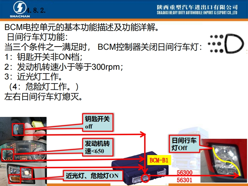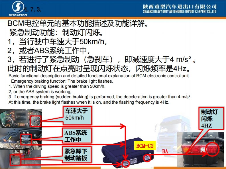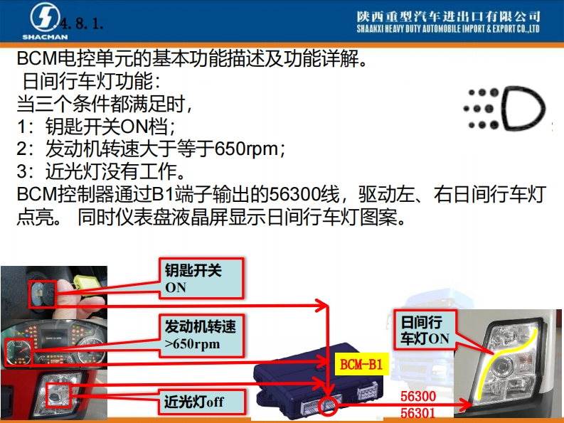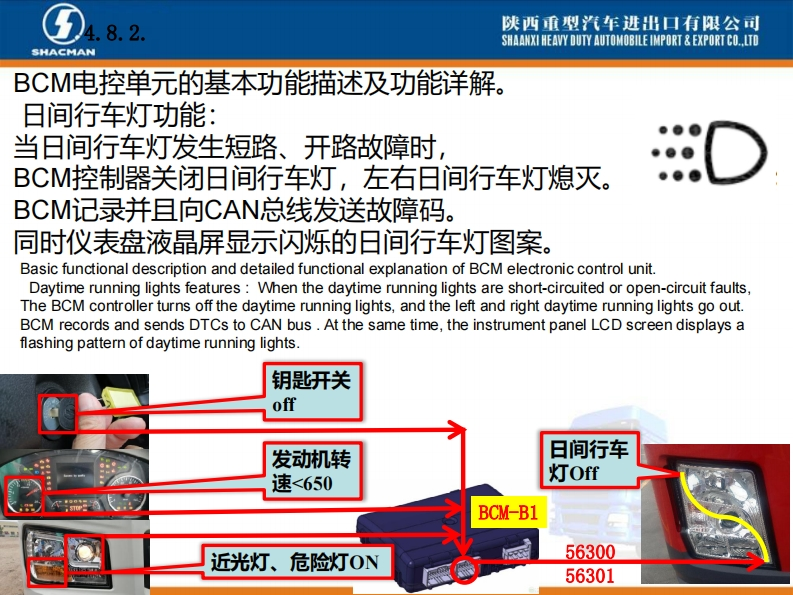 陕西重型汽车进出口有限公司SHAANXI HEAVY DUTY AUTOMOBILE IMPORT EXPORT CO..LTDSHACMANX3000车型BCM电控单元介绍系统功能概述。X3000配置的BCM电控单元是专门开发,主要针对陕汽X3000车型BCM项目,零件号DZ97189585116,主要负责实现灯光控制、排气制动控制、雨刮喷淋控制功能以及发动机启动控制、燃油防盗等车身控制功能。Introduction of BCM Electronic ControlUnit of X3000 ModelAn overview of system functions.The BCM electronic control unit ofX3000 is specially developed,mainlyfor the BCM project of Shaanxi0101011D297189585116210609000413Automobile X3000 model,part numberDZ97189585116,mainly responsibleHh:1.2.2SM:1.7.1用50060022821609AA0413for light control,exhaust brake control,wiper spray control,engine start control,fuel anti-theft,etc.Body controlfunction.