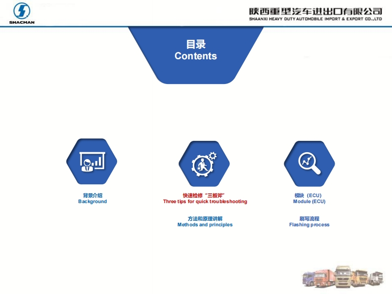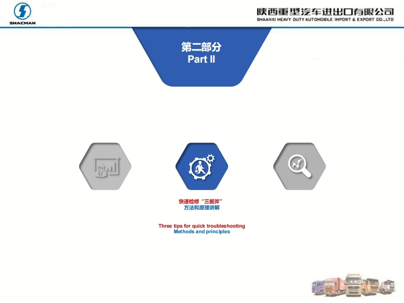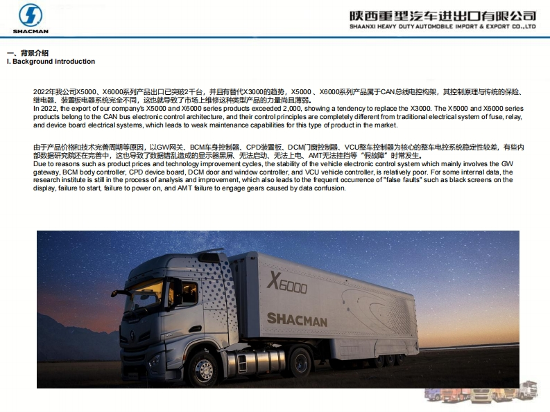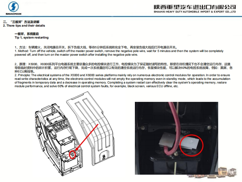 ⑤陕西重型汽车进出▣有眼公司SHACMANSHAANXI HEAVY DUTY AUTOMOBILE IMPORT EXPORT CO..LTDX5000、X6000电控系统故障X5000 and X6000 electronic control system faults快速排查方案Quick troubleshooting methodSHACMANXescoTroubleshooting method of electronic control systemSHACMAN