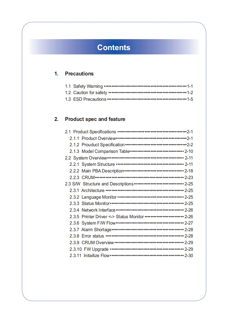 SAMSUNGColor Laser PrinterCLP-315/XAZBasic Model CLP-310N,CLP-315SERVICEManualSamsung Color Laser PrinterThe keynote of ProductThe smallest/The lowest noiseHigh Quality Muti-path CLBPModel:CLP-31x seriesSpeed(Color/Mono):4/16 ppm(A4).4/17ppm(Let)-Printing resolution Max.2,400 x 600 dpiEmulation SPL-CMemory:32 MB (Network model 32MBProcessor:360MHz-Interface:IEEE 802.3,Ethernet(10/100Mbps)Wireless:Not Supported-Toner Cartridge:1.5K Toner(K),1K toner(C,M,Y each)-Printer Life 100,000 pagesMonthly Max.Duty:20,000 pages/monthCLP-310N