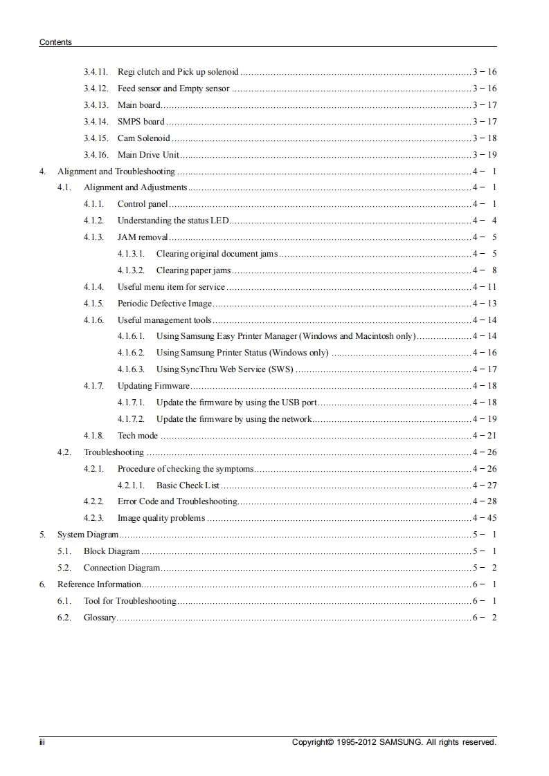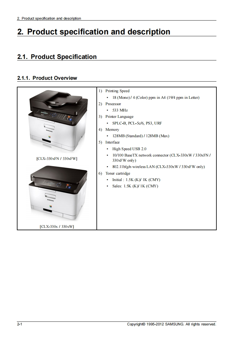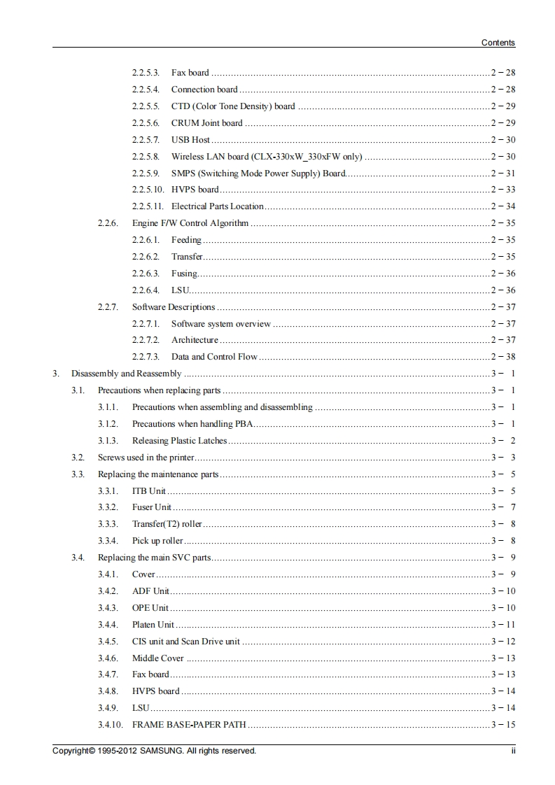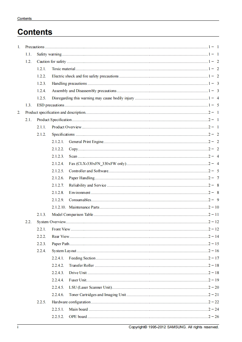 SAMSUNGColor Laser MFPCLX-330x seriesCLX-330x/330xW/330xFN/330xFW(Ver 1.0)SERVICEMANUALColor Laser MFPContents1.Precautions2.Product specification and description3.Disassembly and Reassembly⊙a4.Alignment and Troubleshooting5.System Diagram6.Reference InformationRefer to the service manual in the GSPN(see the rear cover)for more information.