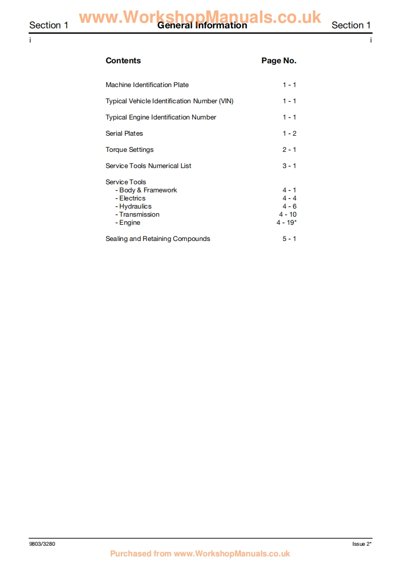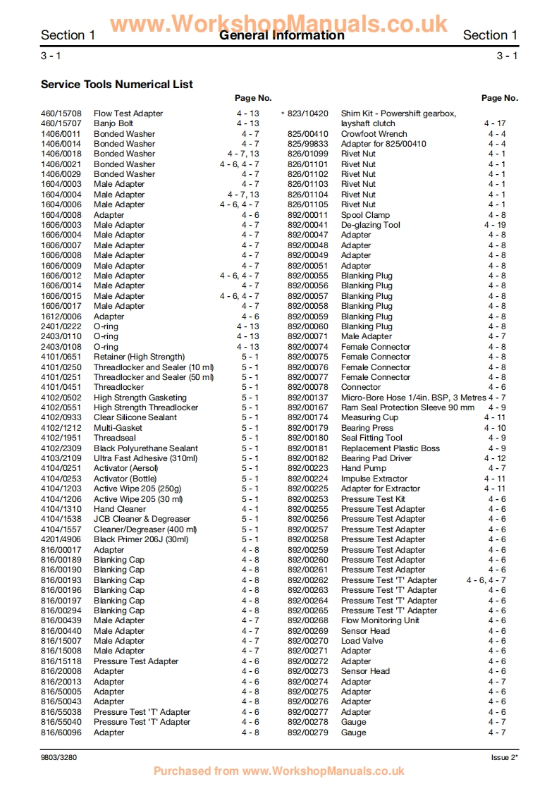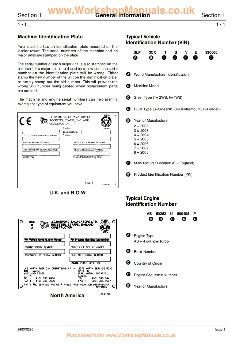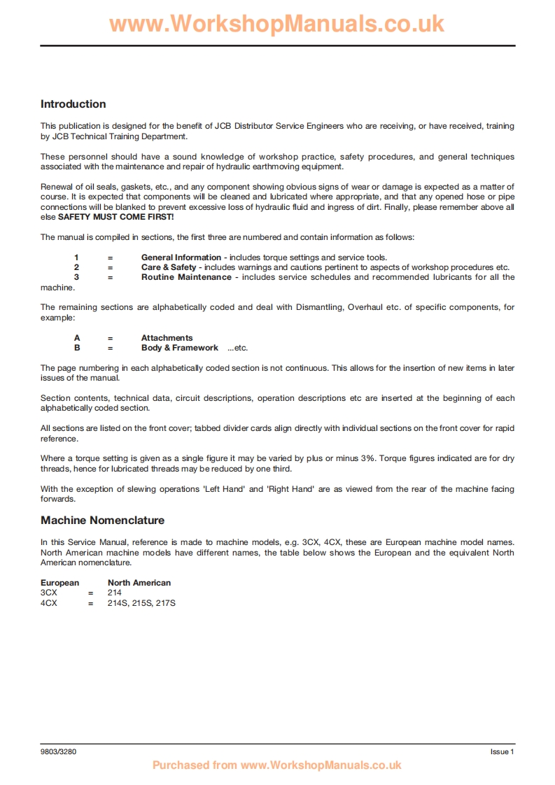 www.WorkshopManuals.co.ukGeneral Information1Care Safety2Routine Maintenance3@AttachmentsAServiceBody FrameworkBElectricsManualCControls3CX,4CX,214e,214,215,D217 VARIANTSHydraulicsEBackhoeTransmissionLoaderFFrom M/c No.930000 OnwardsBrakesFrom M/c No.903000 Onwards(USA)GSteeringPUBLISHED BY THEHTECHNICAL PUBLICATIONS DEPARTMENTOF JCB SERVICE;WORLD PARTS CENTRE,WATERLOO PARK,UTTOXETER,ST14 5PAENGLANDEngineKTel.ROCESTER (01889)590312PRINTED IN ENGLANDPublication No.9803/3280 Issue 4Purchased from www.WorkshopManuals.co.uk