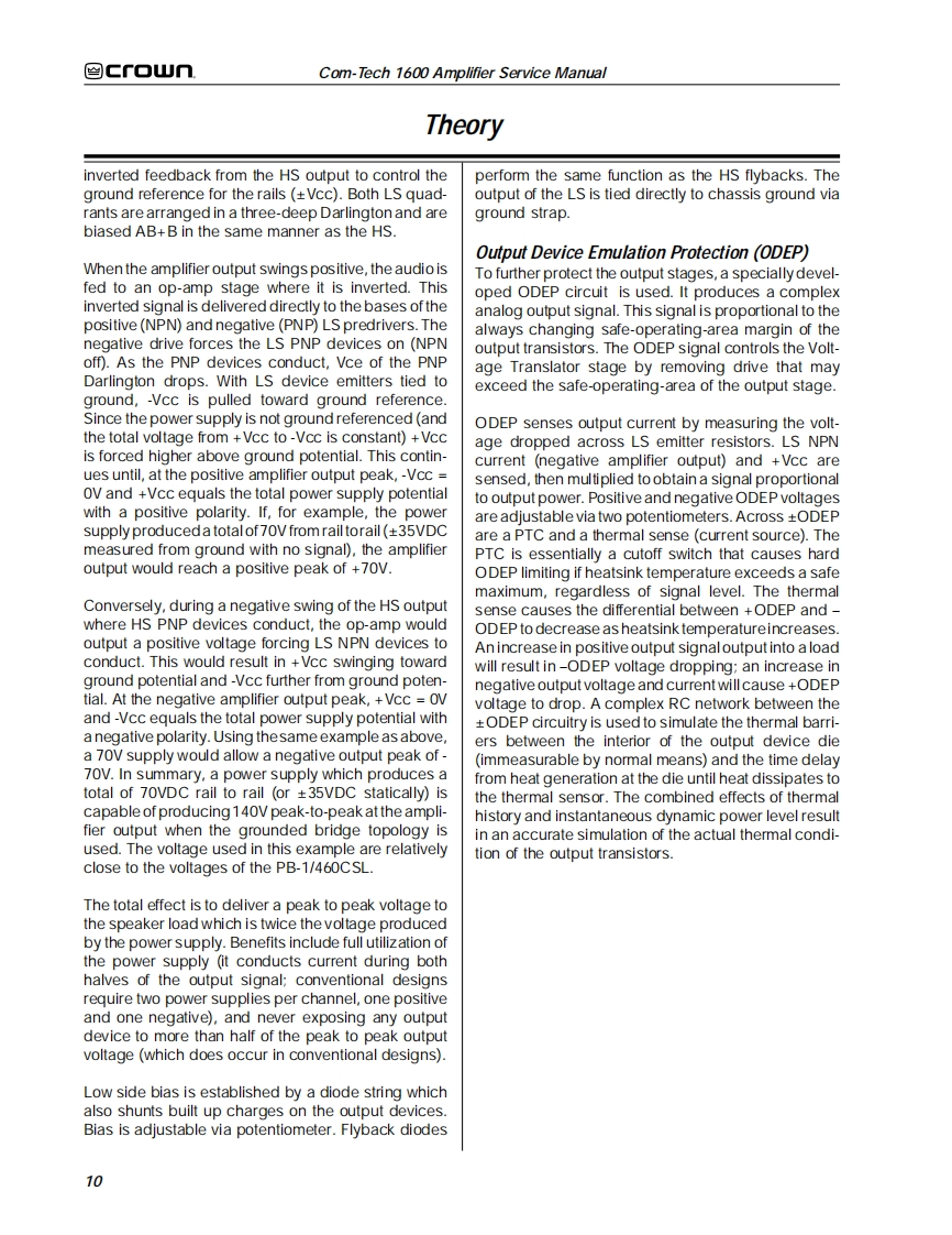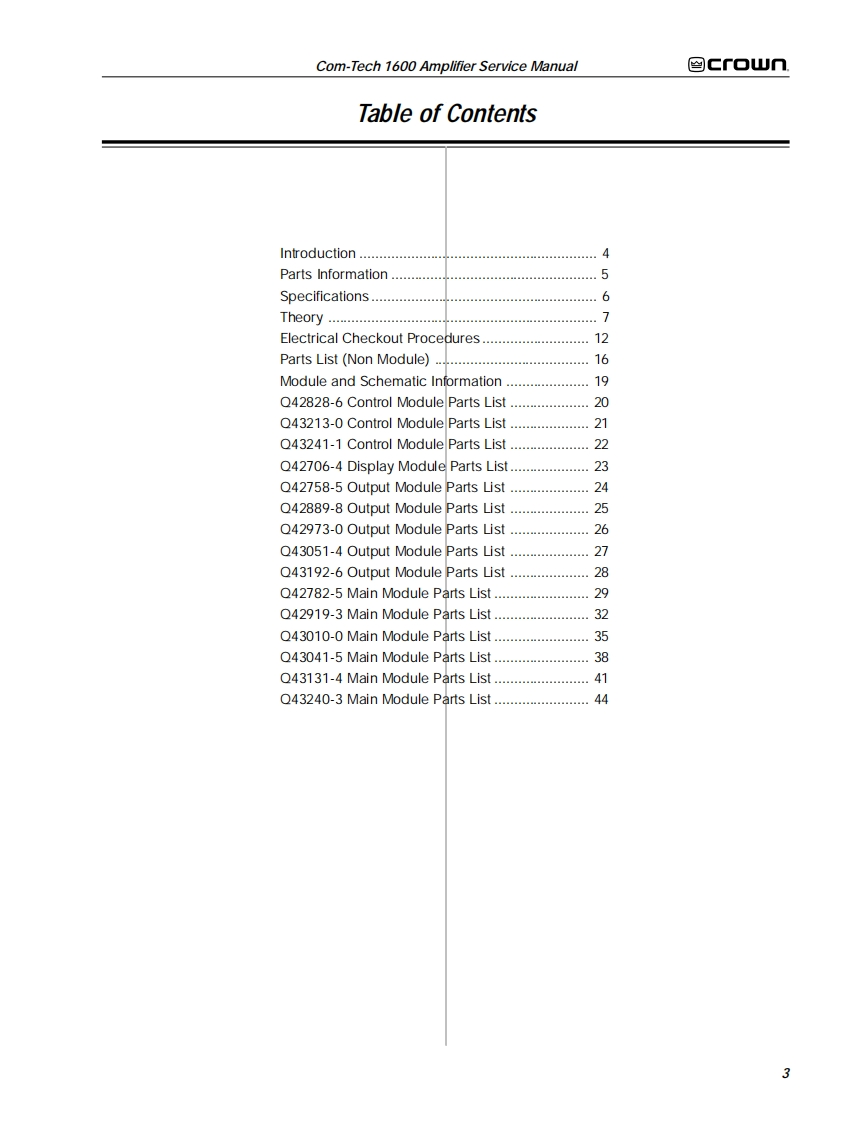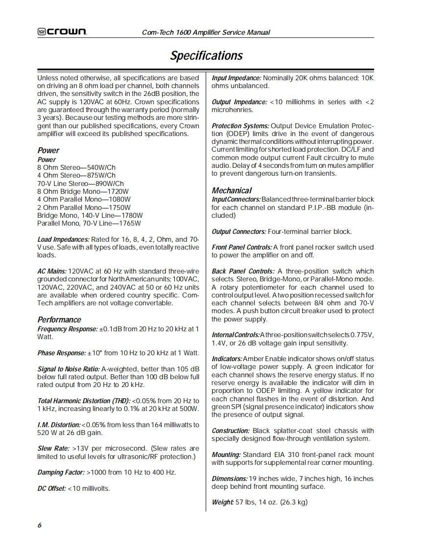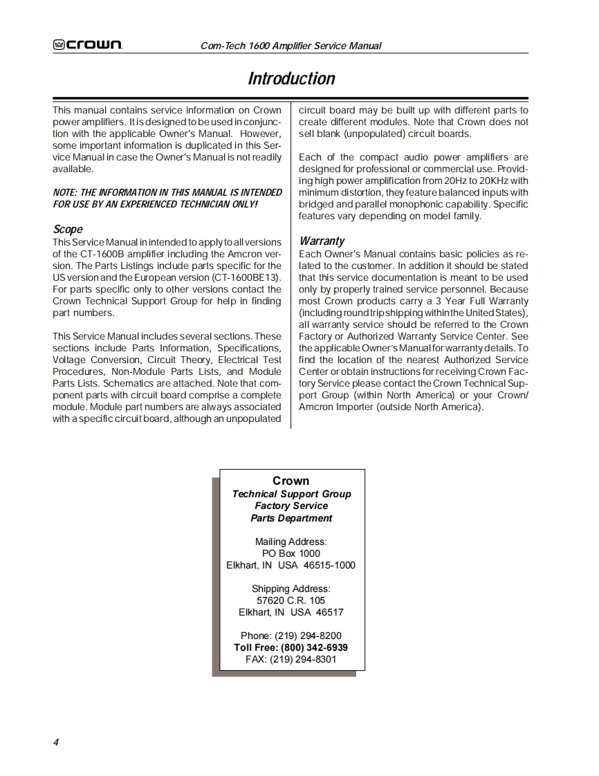 ≌Gf▣UTHE PROFESSIONAL AUDIO DIVISION OF CROWN INTERNATIONAL,INC.POWER AMPLIFIERSERVICE MANUALCOM-TECH°1600Model CT1600B1996 by CROWN INTERNATIONAL,INC.Mailing Address.Shipping Address:P.0.Box100057620C.R.105Elkhart.IN U.S.A.46515-1000Elkhart,INU.S.A.46517Com-Tech,ODEP and Crown are registered trademarks of Crown International,Inc.K-SVCCT16001-96
