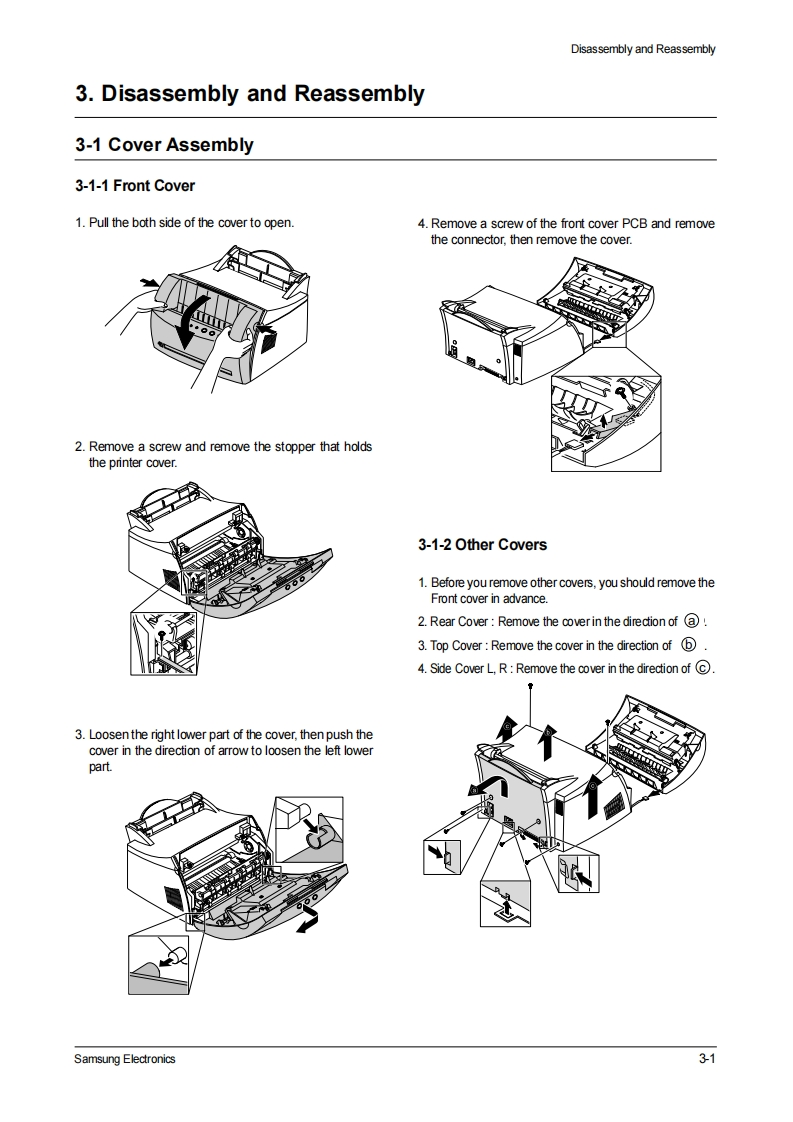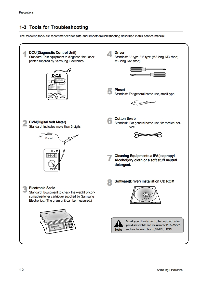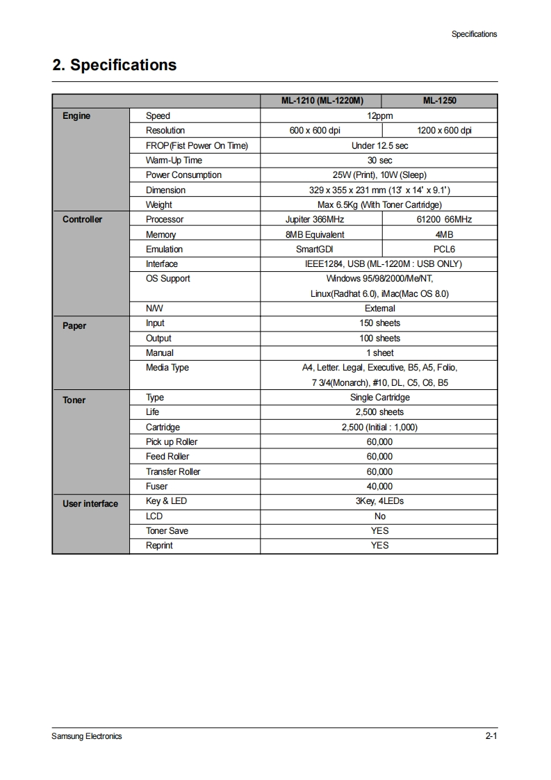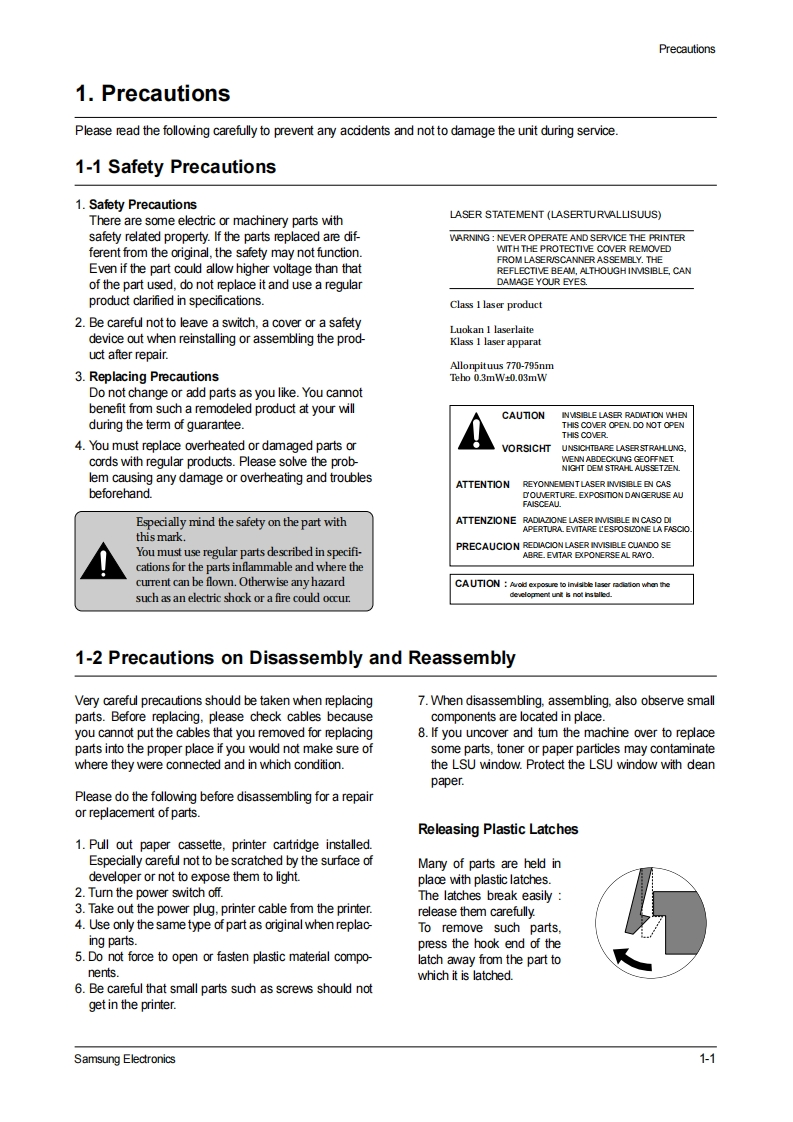 SAMSUNGLASER PRINTERML-1200 SeriesML-1210/ML-1250/ML-1220MSERVICEManualLASER PRINTERCONTENTS1.Precautions2.Specifications3.Disassembly and Reassembly4.Troubleshooting5.Exploded Views and Parts List西00.0006.Block Diagram7.Connection Diagram