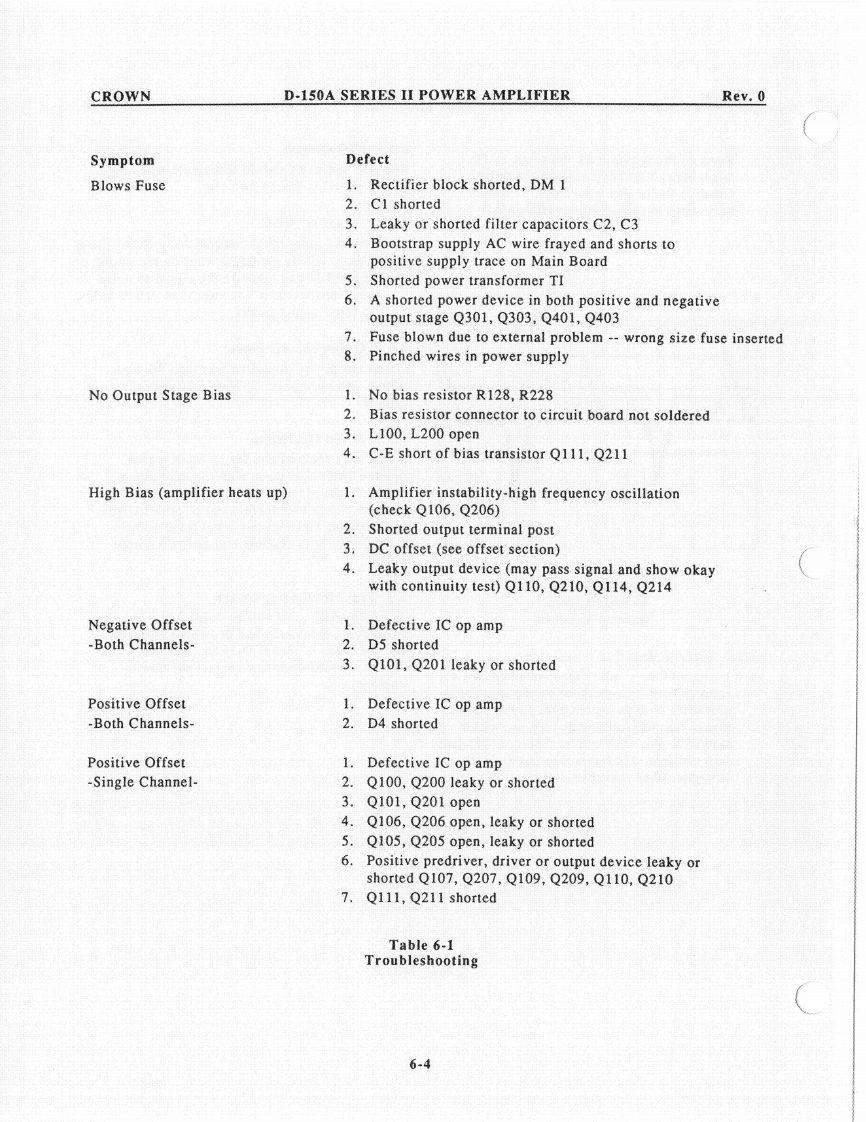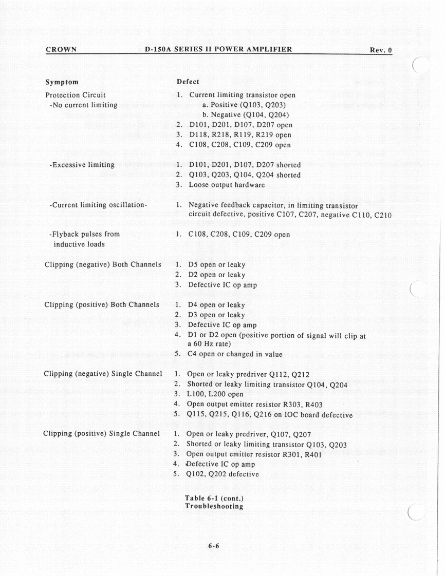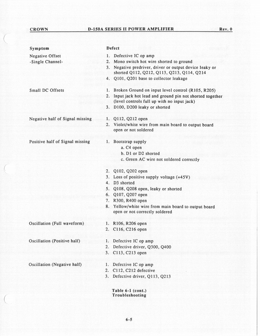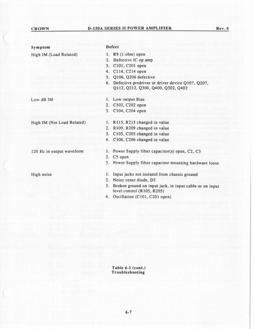 CROWND-150A SERIES II POWER AMPLIFIERRev.0c.Remove the 2 ohm load and place a 1596.1.6 IOC Circuitmicrohenry inductive load on the output.The IOC indicator should illuminate when theObserve the output waveform.It shouldoutput signal is driven into clip.be similar to that in Illustration 6-3.6.1.7 Signal to Noisea.With the input level controls fully CCW,use a20Hz to 20kHz bandpass filter on the output ofthe amplifier to measure the signal to noiseratio.Insure that it's greater than 110dB belowthe rated output power.6.1.8 Quiescent AC PowerQuiescent power should be less than 30 wattswith a line voltage of 120VAC.20 watts istypical.6.1.9 Mono OperationUsing only channel one for an input signal,insert a 1kHz sine wave with the dual/monoswitch in the mono position.Observe thatchannel two is 180 degrees out of polarity fromchannel one.Channel one input level controlshould vary both channel one and two outputsignal.Illustration 6-3Protection Circuit6.2 Troubleshooting ChartMemory WaveformThe following chart will be helpful inidentifying symptoms and possible defects in6.1.5 Intermodulation Distortionthe operation of model D-150A.For morea.Using a 60Hz-7kHz signal summed in a 4:1detailed troubleshooting contact the Crownratio (S.M.P.T.E.method)on the input of theengineering.amplifier with an 8 ohm load on the output,insure that the following specs are withintolerance at a rated power output of 80 watts.OdB through-25dB less than .01%-30dBthrough-40dB less than.03%6-3