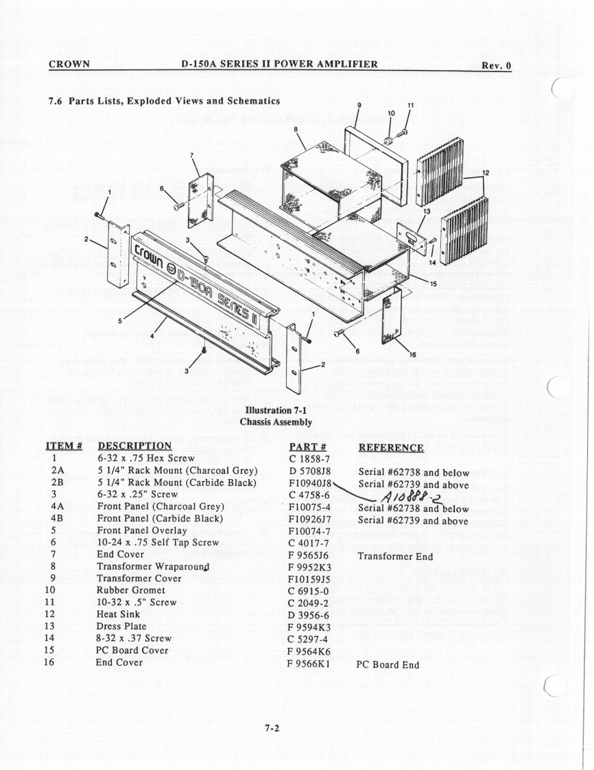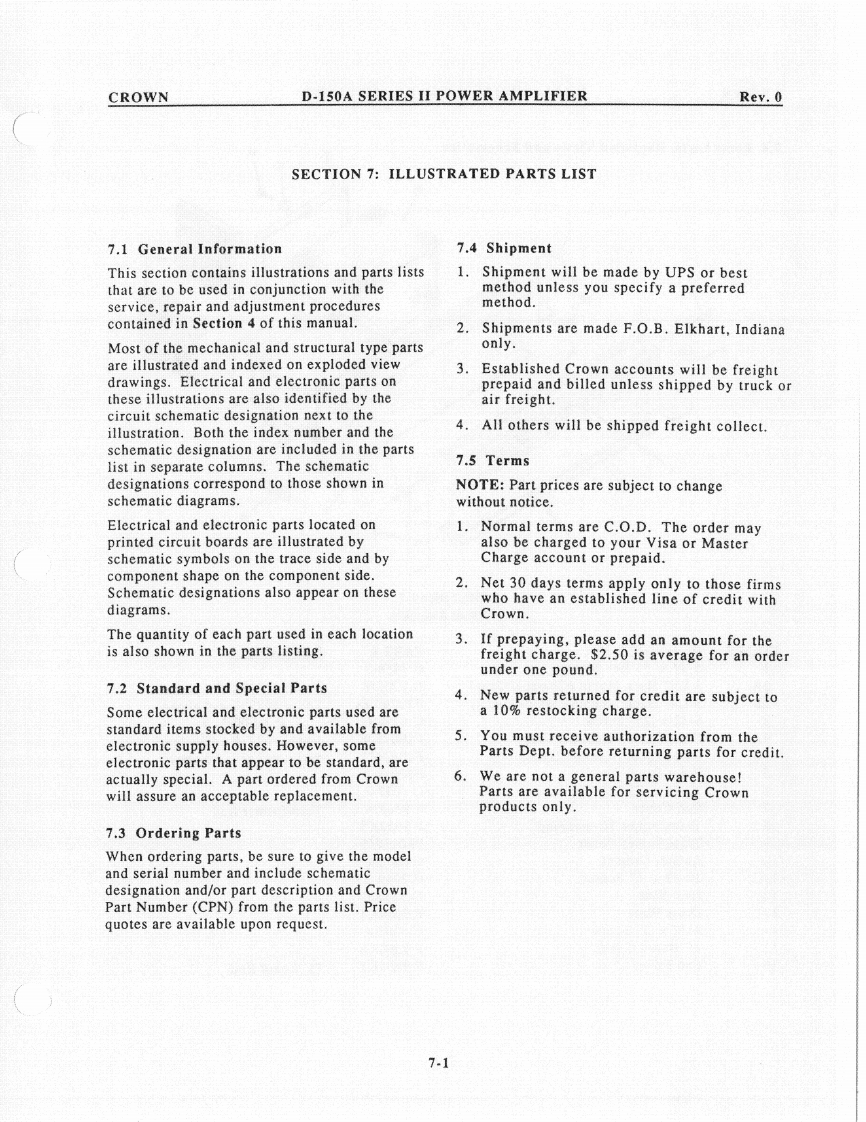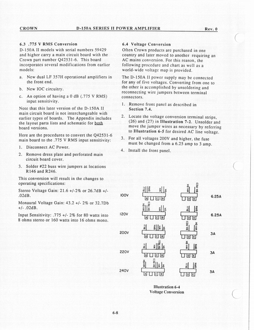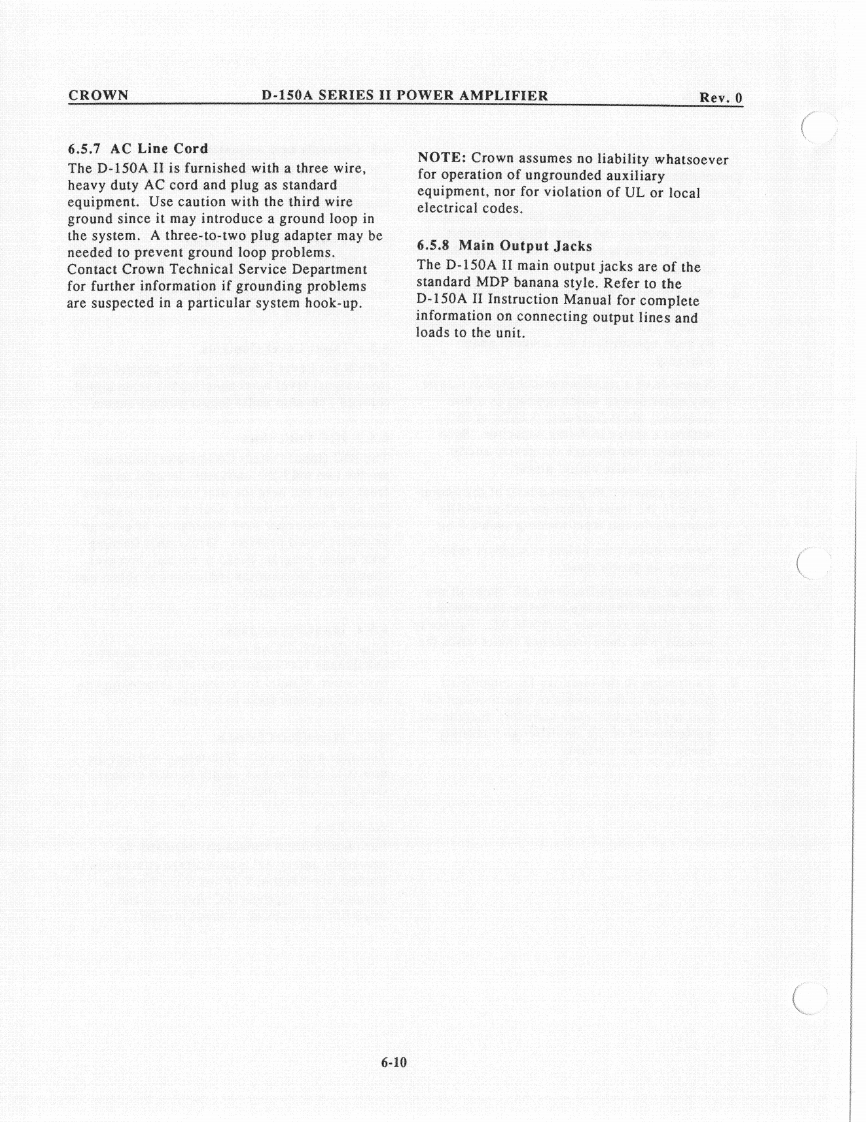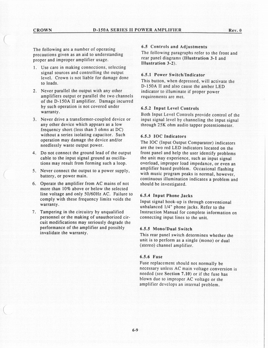 CROWND-150A SERIES II POWER AMPLIFIERRev.0c.Remove the 2 ohm load and place a 1596.1.6 IOC Circuitmicrohenry inductive load on the output.The IOC indicator should illuminate when theObserve the output waveform.It shouldoutput signal is driven into clip.be similar to that in Illustration 6-3.6.1.7 Signal to Noisea.With the input level controls fully CCW,use a20Hz to 20kHz bandpass filter on the output ofthe amplifier to measure the signal to noiseratio.Insure that it's greater than 110dB belowthe rated output power.6.1.8 Quiescent AC PowerQuiescent power should be less than 30 wattswith a line voltage of 120VAC.20 watts istypical.6.1.9 Mono OperationUsing only channel one for an input signal,insert a 1kHz sine wave with the dual/monoswitch in the mono position.Observe thatchannel two is 180 degrees out of polarity fromchannel one.Channel one input level controlshould vary both channel one and two outputsignal.Illustration 6-3Protection Circuit6.2 Troubleshooting ChartMemory WaveformThe following chart will be helpful inidentifying symptoms and possible defects in6.1.5 Intermodulation Distortionthe operation of model D-150A.For morea.Using a 60Hz-7kHz signal summed in a 4:1detailed troubleshooting contact the Crownratio (S.M.P.T.E.method)on the input of theengineering.amplifier with an 8 ohm load on the output,insure that the following specs are withintolerance at a rated power output of 80 watts.OdB through-25dB less than .01%-30dBthrough-40dB less than.03%6-3