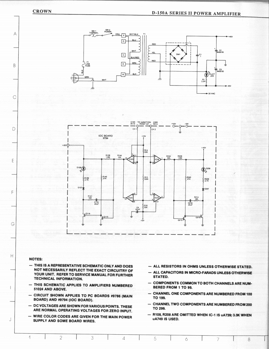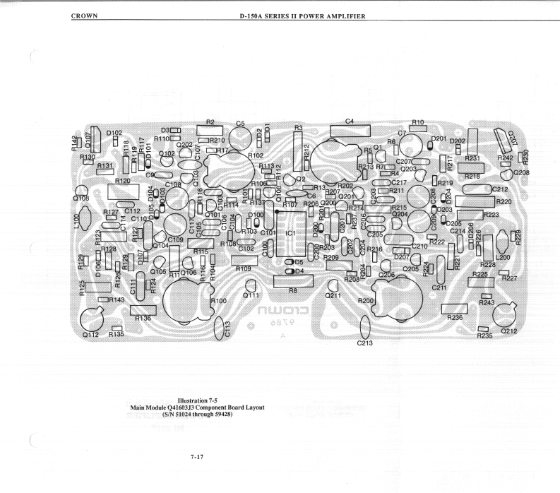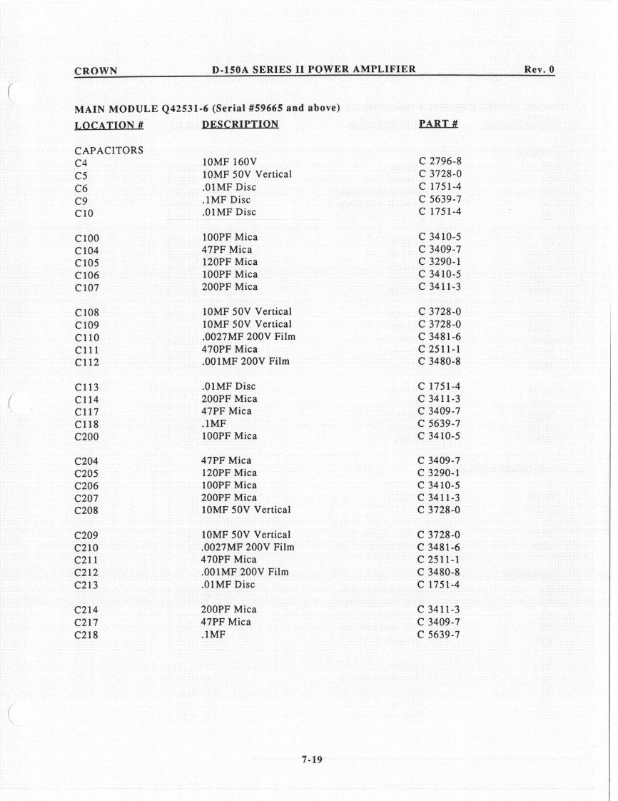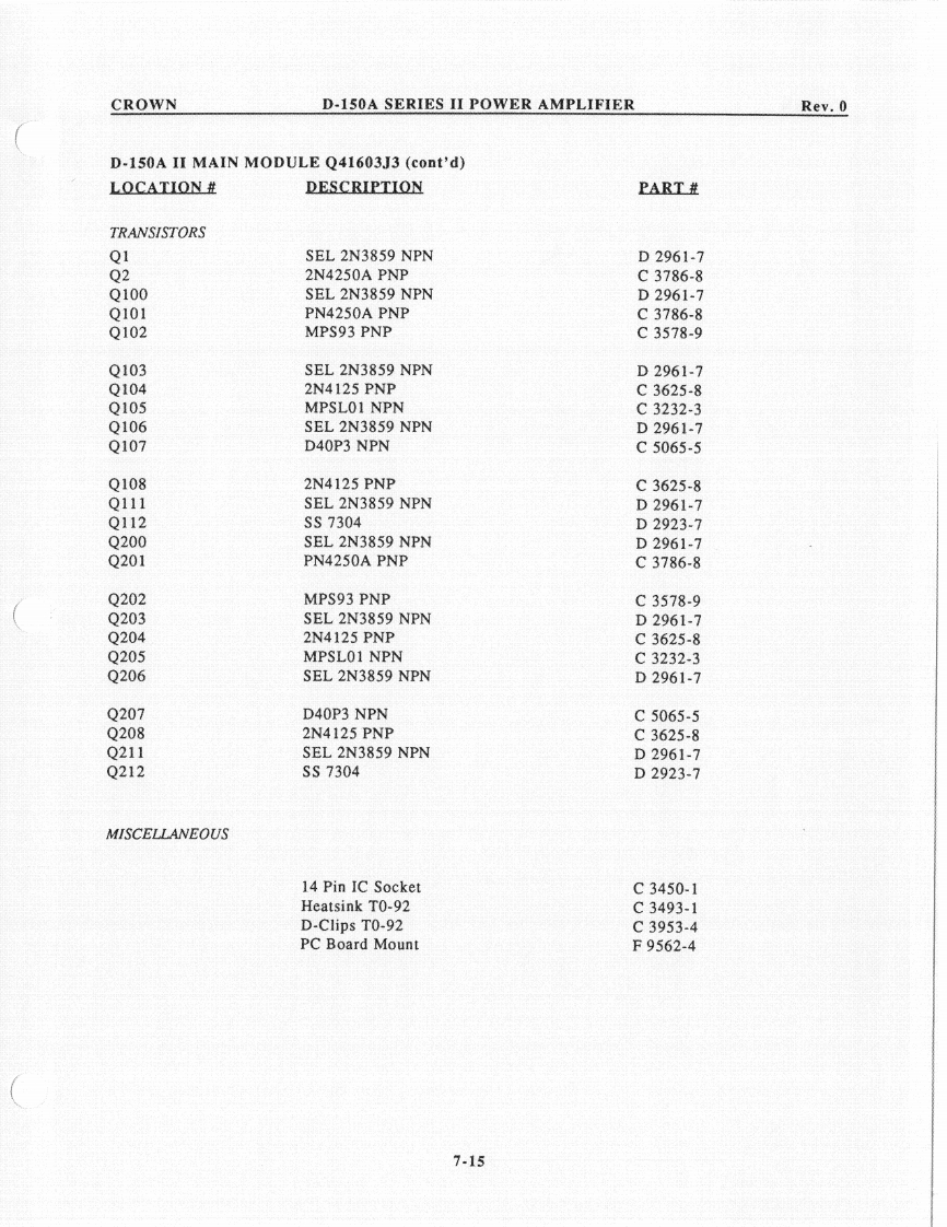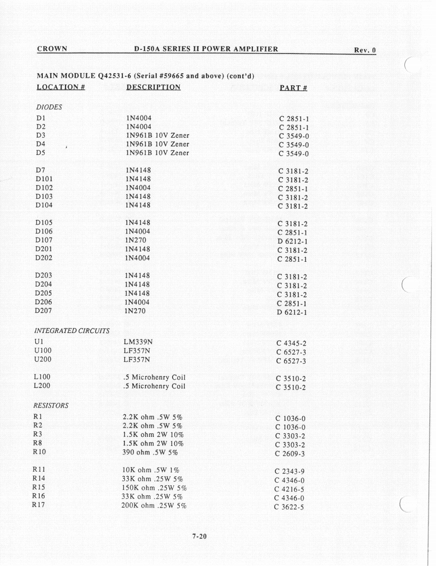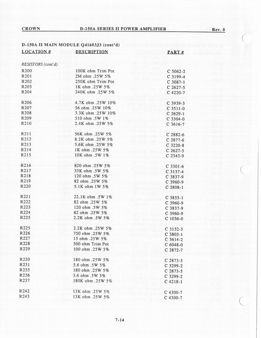 CROWND-150A SERIES II POWER AMPLIFIERRev.0D-150A II MAIN MODULE Q41603J3 (cont'd)LOCATION#DESCRIPTIONPART生R10390ohm.5w5%C2609-3R1110K ohm .5W 1%C2343-9R13100ohm.25W5%C2872-7R100100K ohm Trim PotC5062-2R1012M ohm .25W 5%C3199-4R102250K ohm Trim PotC3087-1R1031K ohm .25W 5%C2627-5R104240Kohm.25W5%C4220-7R1064.7Kohm.25W10%C3939-3R10756ohm.25W10%C3511-0R1083.3Kohm.25w10%C2629-1R109510ohm.5W1%C3304-0R1102.4Kohm.25W5%C3616-7R11156K ohm .25W 5%C2882-6R1128.2Kohm.25W5%C2877-6R1135.6Kohm.25W5%C3220-8R1141K ohm.25W 5%C2627-5R11510K ohm .5W 1%C2343-9R116820ohm.25W5%C3301-6R11733K ohm .5W 5%C3137-4R118120ohm.5W5%C3837-9R11982ohm,25W5%C3960-9R1205.1K ohm 1W 5%C2808-1R12122.1Kohm.5W1%C3855-1R12282ohm.25W5%C3960-9R123120ohm.5W5%C3837-9R12482ohm.25W5%C3960-9R1252.2K ohm .5W 5%C1036-0R1252.2Kohm.25W5%C3152-3R126750ohm.25W5%C3803-1R12715ohm.25W5%C3614-2R128500 ohm Trim PotC6048-0R129100ohm.25W5%C2872-7R130180ohm.25W5%C2873-5R1315.6ohm,5W5%C3299-2R135180ohm.25W5%C2873-5R1365.6ohm.5W5%C3299-2R137180Kohm.25W5%C4218-1R14213K ohm .25W 5%C4300-7R14313K ohm .25W 5%C4300-77.13