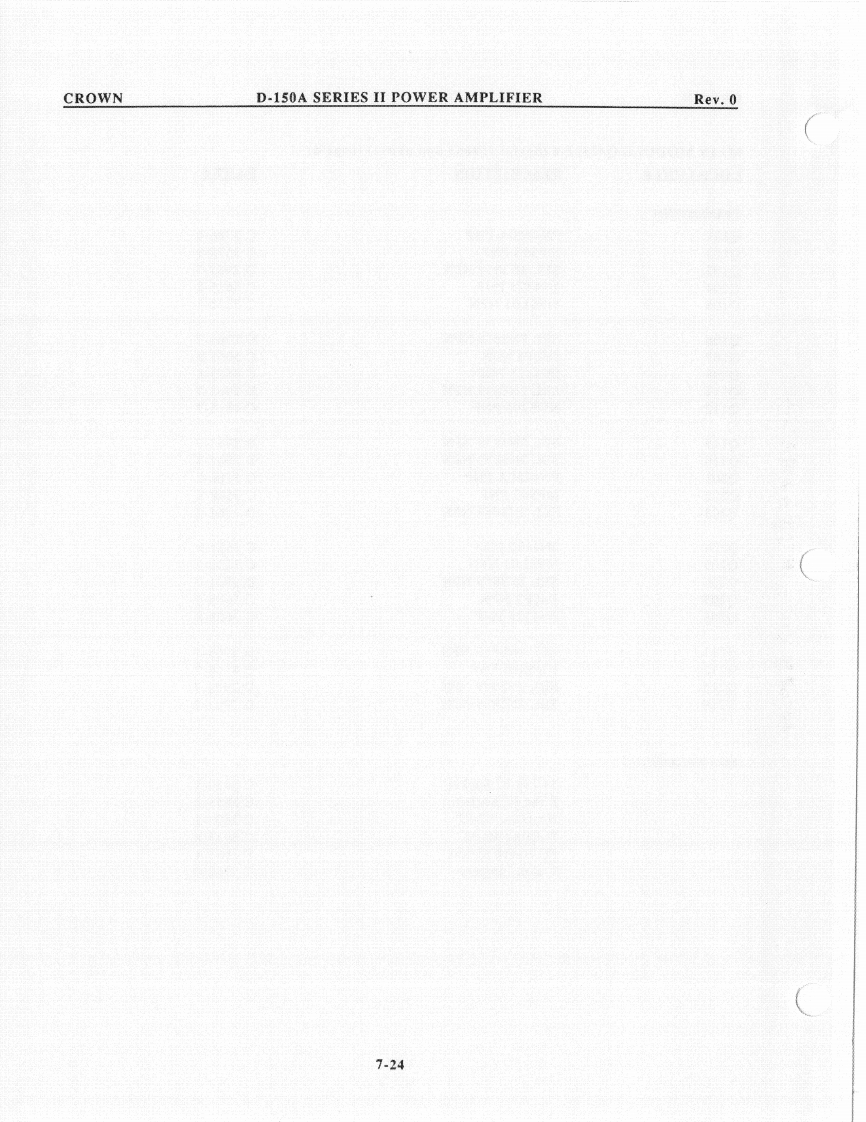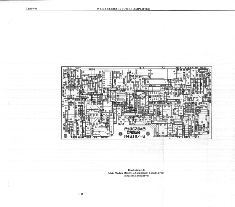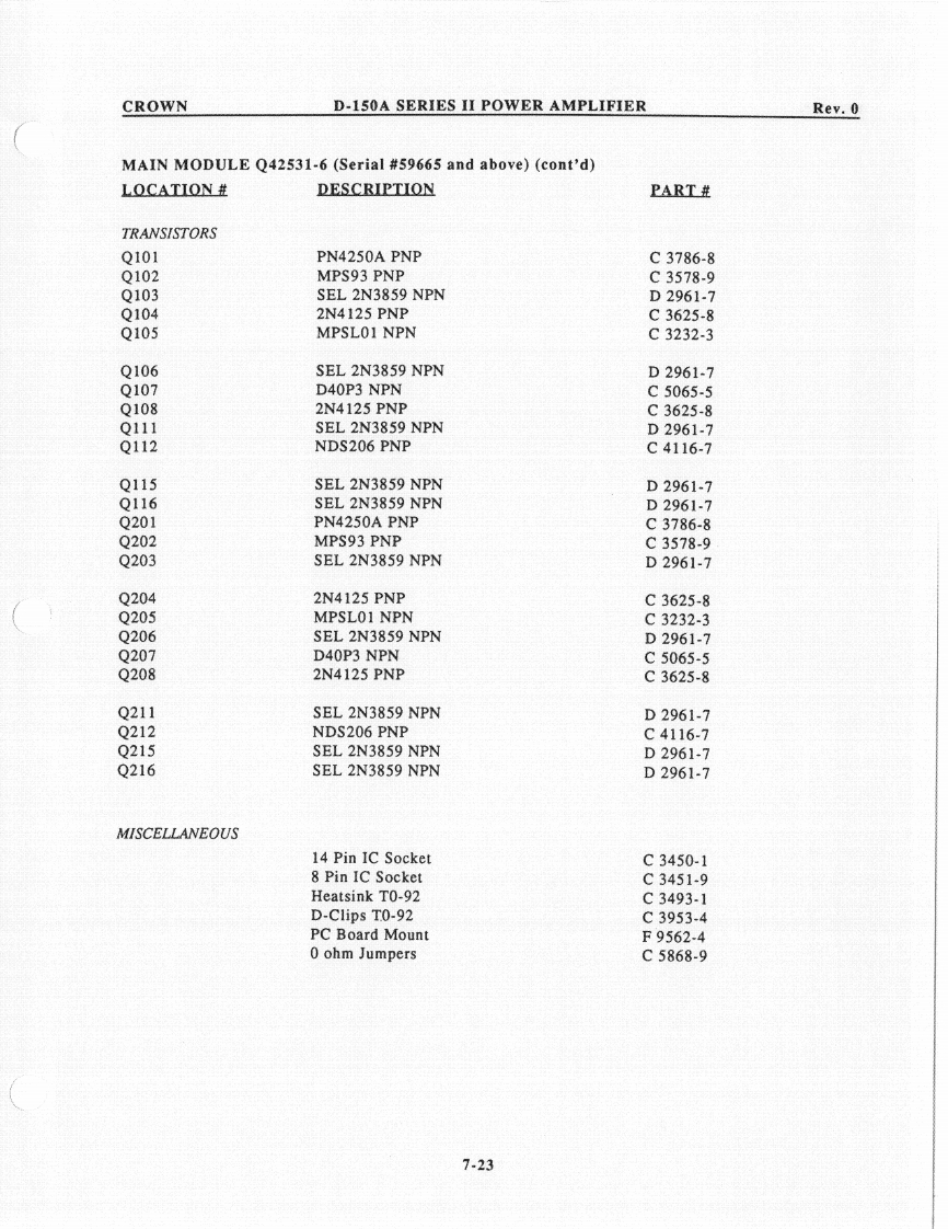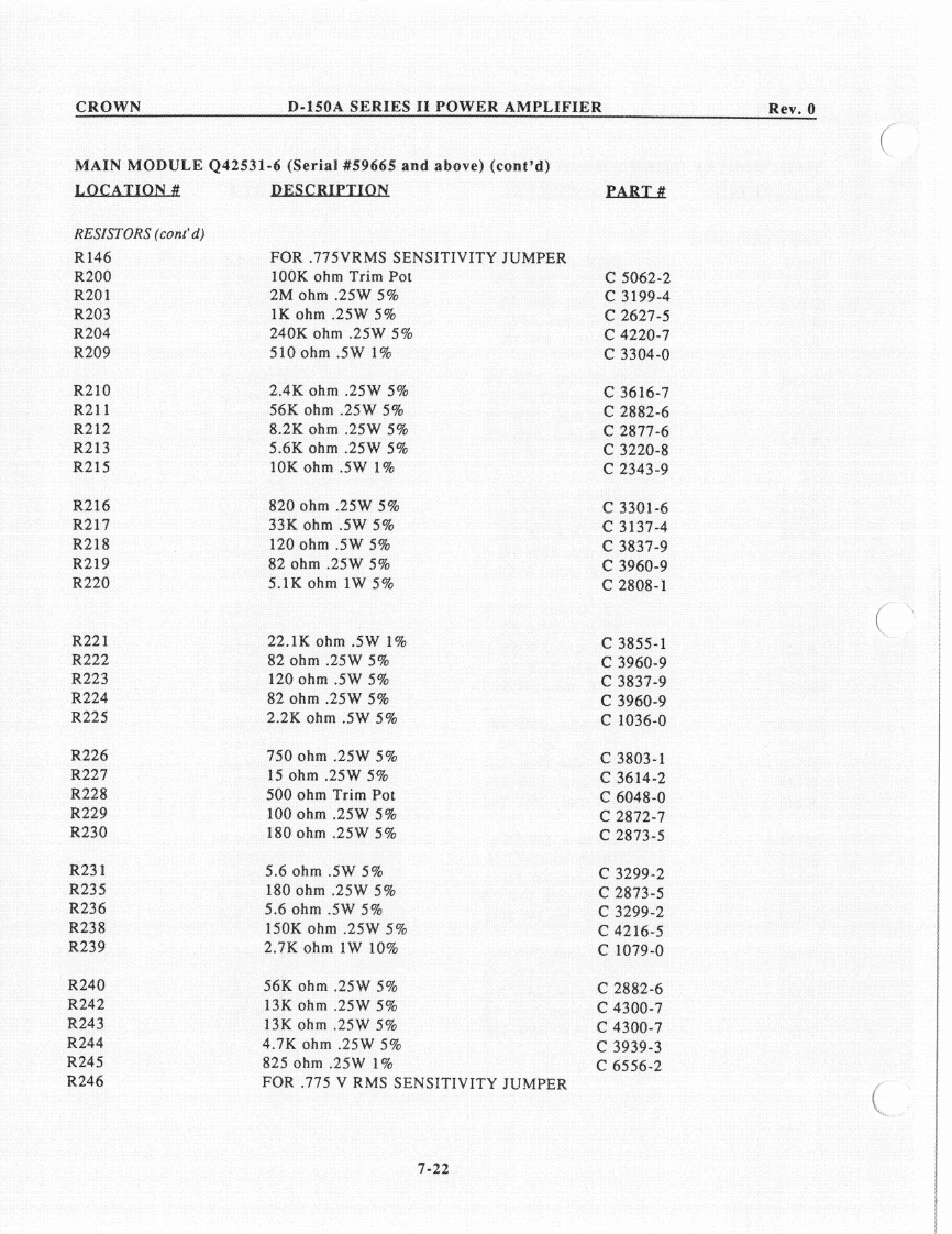 CROWND-150A SERIES II POWER AMPLIFIERRev.0MAIN MODULE Q42531-6(Serial #59665 and above)(cont'd)LOCATION#DESCRIPTIONPART#RESISTORS (cont'd)R100100K ohm Trim PotC5062-2R1012M ohm .25W 5%C3199-4R1031K ohm .25W 5%C2627-5R104240Kohm.25W5%C4220-7R109510ohm.5W1%C3304-0R1102.4Kohm.25W5%C3616-7R11156K ohm .25W 5%C2882-6R1128.2Kohm.25W5%C2877-6R1135.6Kohm.25W5%C3220-8R11510K ohm .5W 1%C2343-9R116820ohm.25W5%C3301-6R11733K ohm .5W 5%C3137.4R118120ohm.5W5%C3837-9R11982ohm.25W5%C3960-9R1205.1K ohm 1W 5%C2808-1R12122.1Kohm.5W1%C3855-1R12282ohm.25W5%C3960-9R123120ohm.5W5%C3837-9R12482ohm,25W5%C3960-9R1252.2K ohm.5W 5%C1036-0R126750ohm.25w5%C3803-1R12715ohm.25W5%C3614-2R128500 ohm Trim PotC6048-0R129100ohm,25W5%C2872-7R130180ohm.25W5%C2873-5R1315.6ohm.5W5%C3299-2R135180ohm.25W5%C2873-5R1365.6ohm,5W5%C3299-2R138150Kohm.25W5%C4216-5R1392.7K ohm 1W 10%C1079-0R14056K ohm .25W 5%C2882-6R14213K ohm .25W 5%C4300-7R14313K ohm.25W 5%C4300-7R1444.7Kohm,25W5%C3939.3R145825ohm.25W1%C6556-27-21