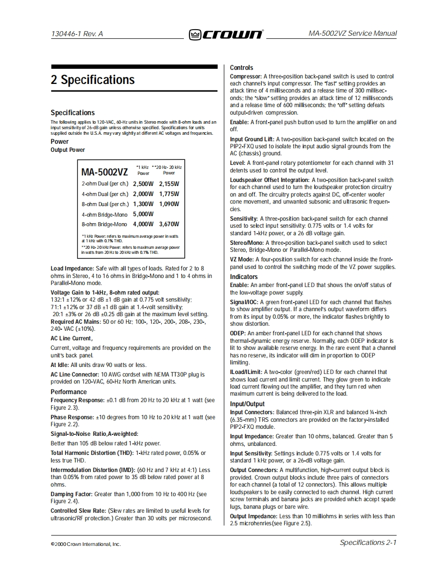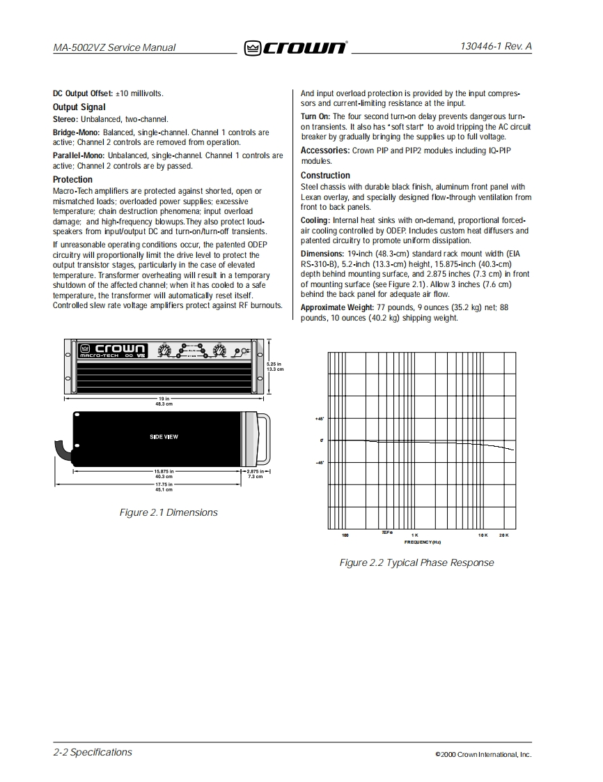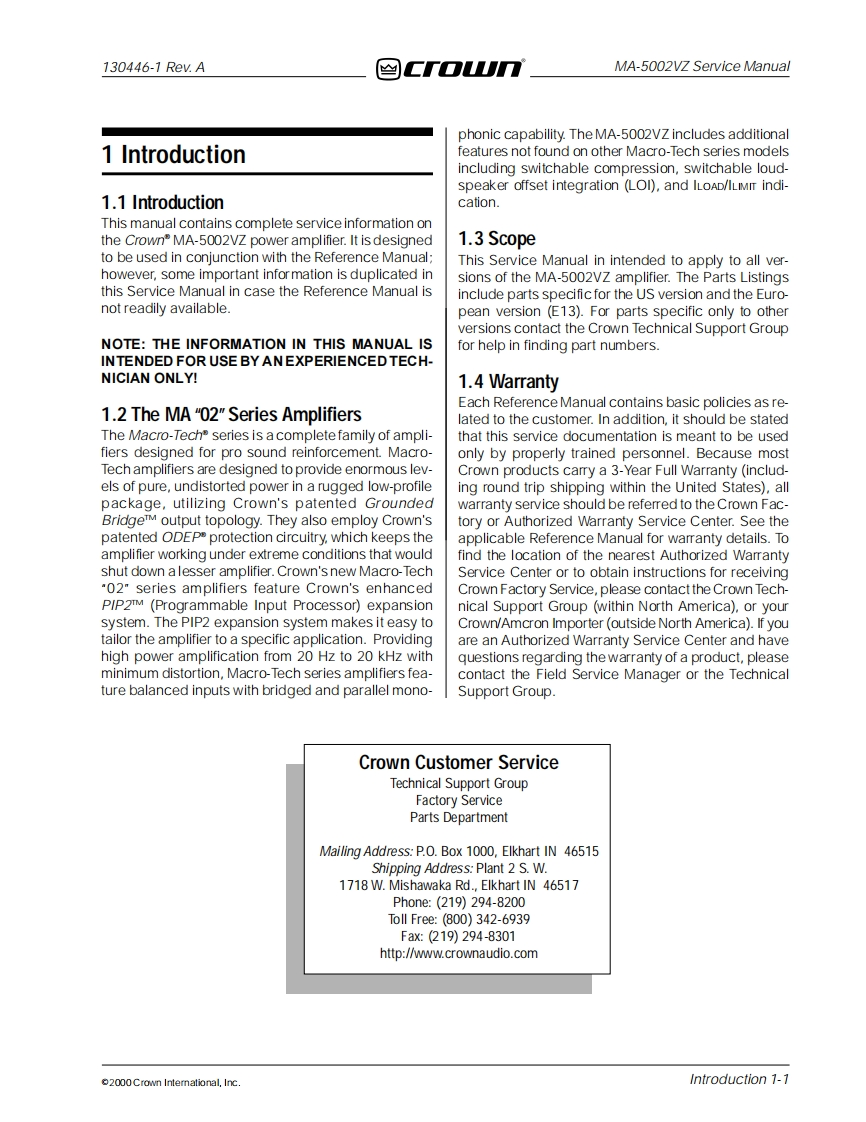 兰CTOTUMa cro-Tech®POWER AMPLIFIERSERVICE MANUAL≌Gr▣UnmACr▣-TECH5OO2zModels:MA-5002VZSome models may be exported under the name Amcron"2000 by Crown International,Inc.,P.O.Box 1000,Elkhart,Indiana 46515-1000 U.S.A.Telephone:219-294-8000.Trademark Notice:Grounded Bridge",PIP2 and SmartAmp"aretrademarks and Amcrom,Crown,IOC,IQ System,Macro-Tech ODEP and VZ areregistered trademarks of Crown International,Inc.Other trademarks are the property of theirrespective owners.130446-102-00Rev.A