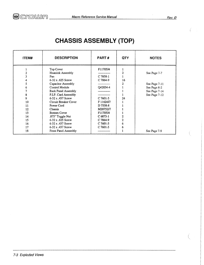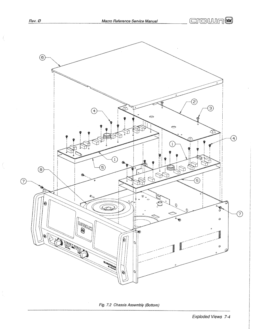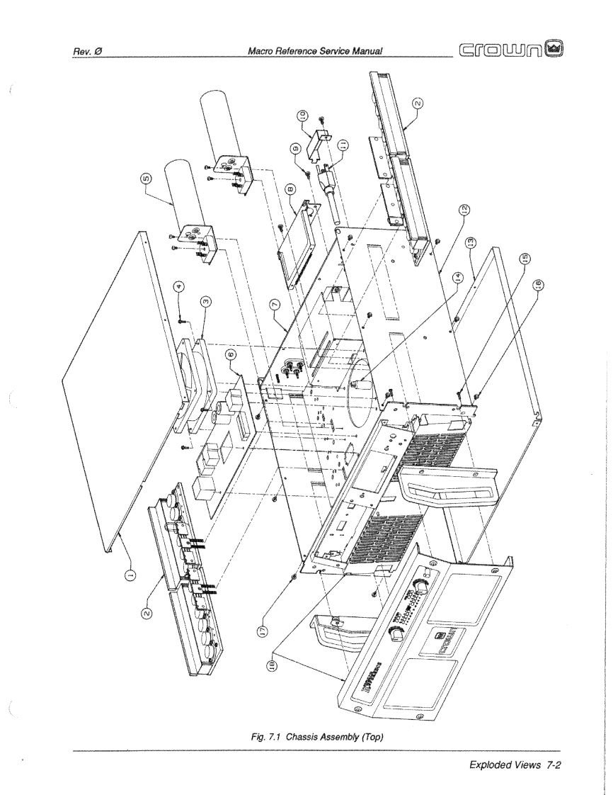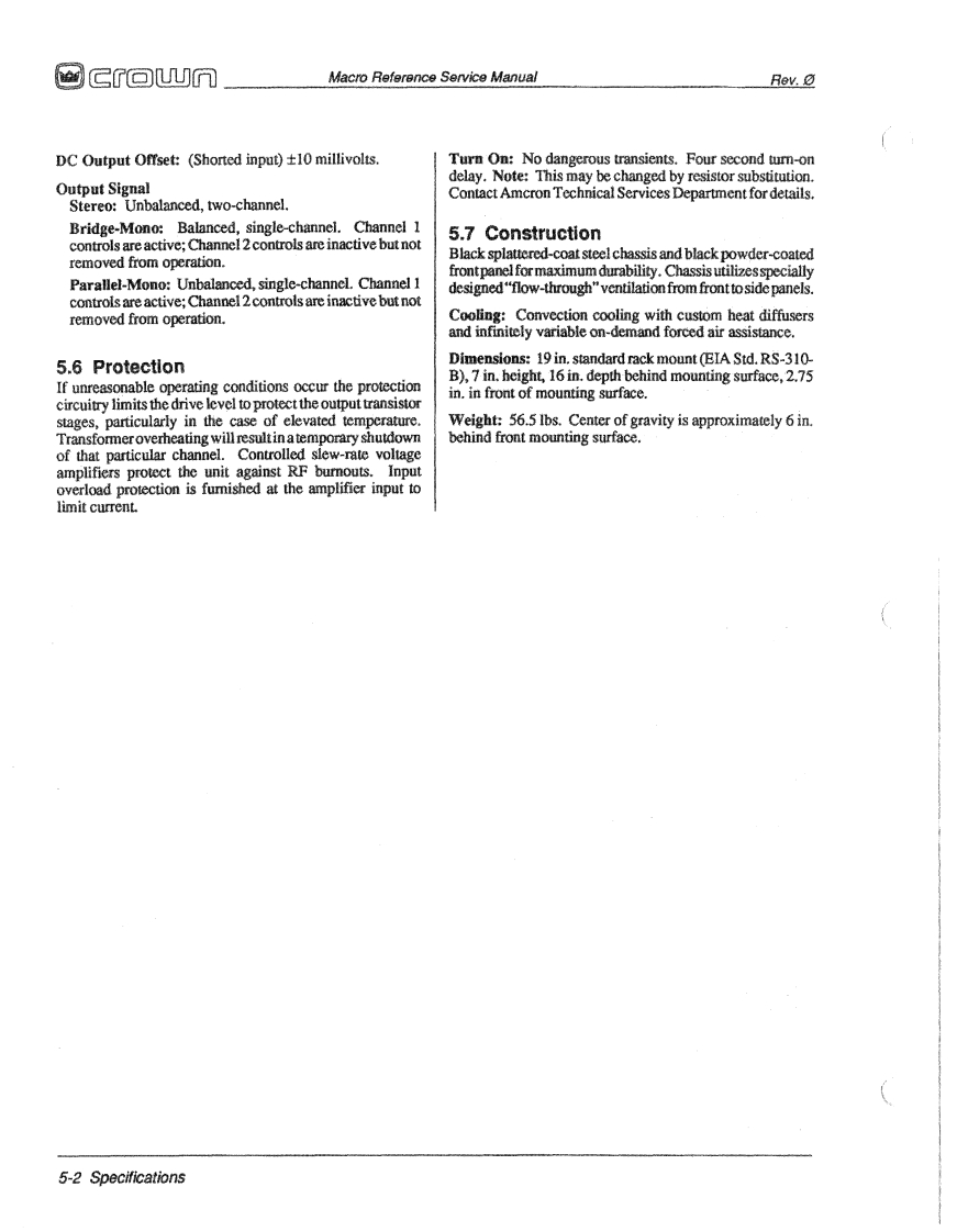 Rev.Macro Reference Service ManualGr▣uUn@Stereo-Mono:A three-position switch located on the back5 Specificationspanel which selects between STEREO,BRIDGE-MONO,and PARALLEL-MONO modes of operation.Input:A two-position switch located inside the amplifier5.1 Performanceselects between two input sensitivities.(A voltage gain of 26Note:8 ohm loads were used unless specified otherwise.dB or a sensitivity of.775 V for full rated output.)Frequency Response:3 Hz to 100 kHz bandwidth.Level Dynamic Range Meter:A two-position switch0.1 dB 20 Hz to 20 kHz at 1 watt.located behind the front panel sets the display meter on thefront panel as either a dB level meter or a Dynamic RangeSignal to Noise Ratio:120 dB (A-weighted)below ratedpower meter.output at 26 dB gain.IM Distortion:Less than 0.005%from 760 watts through5.4 Indicators-10 dB,increasing smoothly to a maximum of 0.025%atEnable:This amber indicator is on while the amplifier is on-40 dB,measured at 26 dB gain.to show that the low-voltage power supply is operating.Damping Factor:Greater than 20,000 from 10 Hz to 200ODEP:Two amber multifunction indicators which showHz.1.800 at 1 kHzthe reserve energy status of each channel.Normally they arebrightly illuminated to show that reserve energy is available.5.2 PowerIn the rare event there is no energy reserve,they will dim inPower Bandwidth:proportion to ODEP limiting.They remain off if a tripped10 Hz to 25 kHz-1.0 dB.breaker,blown fuse or thermal shutdown occurs.(In thecase of a thermal shutdown,the amplifier will retumn to7 Hz to 27 kHz -1.5 dB.normal operation after cooling down to a safe operating5 Hz to 28 kHz.-2.0 dB.temperature.)4 Hz to 30 kHz -3.0 dB.IOC:Two yellow indicators which are normally off.In theOutput Power:unlikely event the output waveform differs from that of theNote:The following power specifications are for STEREOinput by 0.05%or more,they will flash.In this way,they act(two-channel)operation with a THD of 0.02%or lessas sensitive distortion indicators to provide proof ofperformance.Note:It is normal for the Channel 2 IOCwhile both channels are driven.indicator to remain in PARALLEL-MONO mode.760 watts per channel into 8 ohms.Signal:Two green Signal presence indicators flash in sync1,160 watts per channel into 4 ohms.with the input signal to show its presence.1,500 watts per channel into 2 ohms.Dynamic Range Level Meter:Two green five-segmentLoad Impedance:Rated for 16,8,4,and2ohm usage only.meters (one per channel)display either the output dynamicSafe with all types of loads,even reactive ones.range in dB or the output level in dB.(Your unit comesfactory-set to display dynamic range.)As dynamic rangeRequired AC Mains:50/60 Hz,at 100,120,200,220/230,meters they show the ratio of the peak to average power of240 VAC.)Draws 90 watts or less at idle.With a continuouseach channel.As outputlevel meters they show how high the1 kHzsinewave output of 760 watts into 8 ohms in STEREOmode,as many as 26 amps are drawn from a 120 VACoutput levels are r