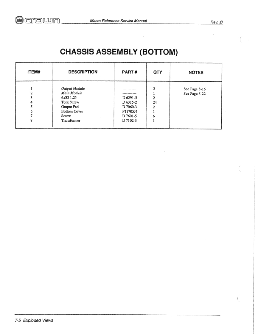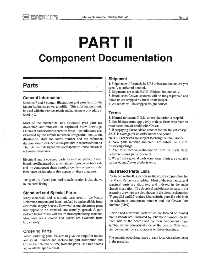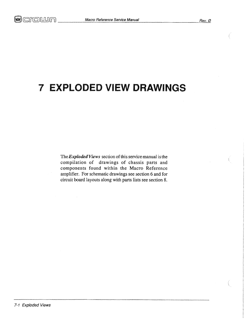 Rev.Macro Reference Service ManualGr▣uUn@Stereo-Mono:A three-position switch located on the back5 Specificationspanel which selects between STEREO,BRIDGE-MONO,and PARALLEL-MONO modes of operation.Input:A two-position switch located inside the amplifier5.1 Performanceselects between two input sensitivities.(A voltage gain of 26Note:8 ohm loads were used unless specified otherwise.dB or a sensitivity of.775 V for full rated output.)Frequency Response:3 Hz to 100 kHz bandwidth.Level Dynamic Range Meter:A two-position switch0.1 dB 20 Hz to 20 kHz at 1 watt.located behind the front panel sets the display meter on thefront panel as either a dB level meter or a Dynamic RangeSignal to Noise Ratio:120 dB (A-weighted)below ratedpower meter.output at 26 dB gain.IM Distortion:Less than 0.005%from 760 watts through5.4 Indicators-10 dB,increasing smoothly to a maximum of 0.025%atEnable:This amber indicator is on while the amplifier is on-40 dB,measured at 26 dB gain.to show that the low-voltage power supply is operating.Damping Factor:Greater than 20,000 from 10 Hz to 200ODEP:Two amber multifunction indicators which showHz.1.800 at 1 kHzthe reserve energy status of each channel.Normally they arebrightly illuminated to show that reserve energy is available.5.2 PowerIn the rare event there is no energy reserve,they will dim inPower Bandwidth:proportion to ODEP limiting.They remain off if a tripped10 Hz to 25 kHz-1.0 dB.breaker,blown fuse or thermal shutdown occurs.(In thecase of a thermal shutdown,the amplifier will retumn to7 Hz to 27 kHz -1.5 dB.normal operation after cooling down to a safe operating5 Hz to 28 kHz.-2.0 dB.temperature.)4 Hz to 30 kHz -3.0 dB.IOC:Two yellow indicators which are normally off.In theOutput Power:unlikely event the output waveform differs from that of theNote:The following power specifications are for STEREOinput by 0.05%or more,they will flash.In this way,they act(two-channel)operation with a THD of 0.02%or lessas sensitive distortion indicators to provide proof ofperformance.Note:It is normal for the Channel 2 IOCwhile both channels are driven.indicator to remain in PARALLEL-MONO mode.760 watts per channel into 8 ohms.Signal:Two green Signal presence indicators flash in sync1,160 watts per channel into 4 ohms.with the input signal to show its presence.1,500 watts per channel into 2 ohms.Dynamic Range Level Meter:Two green five-segmentLoad Impedance:Rated for 16,8,4,and2ohm usage only.meters (one per channel)display either the output dynamicSafe with all types of loads,even reactive ones.range in dB or the output level in dB.(Your unit comesfactory-set to display dynamic range.)As dynamic rangeRequired AC Mains:50/60 Hz,at 100,120,200,220/230,meters they show the ratio of the peak to average power of240 VAC.)Draws 90 watts or less at idle.With a continuouseach channel.As outputlevel meters they show how high the1 kHzsinewave output of 760 watts into 8 ohms in STEREOmode,as many as 26 amps are drawn from a 120 VACoutput levels are r