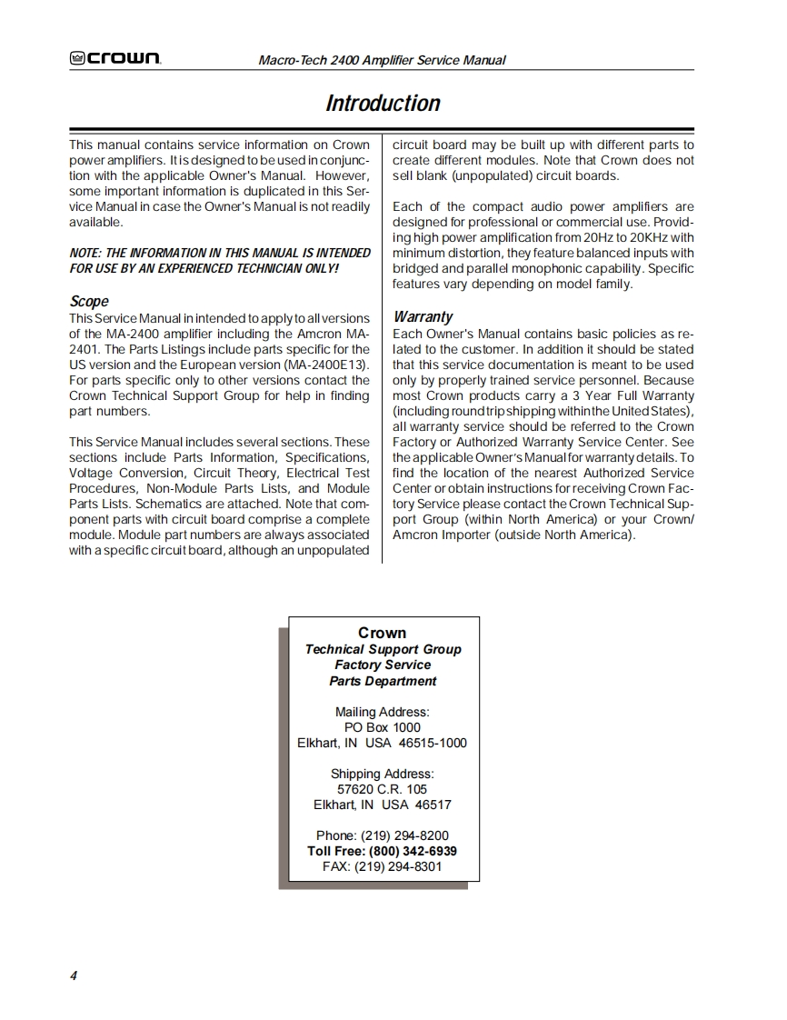 兰GT▣UTHE PROFESSIONAL AUDIO DIVISION OF CROWN INTERNATIONAL.INC.POWER AMPLIFIERSERVICE MANUALMACRO-TECH-24001996 by CROWN INTERNATIONAL,INC.Mailing Address.Shipping Address:P.0.Box100057620C.R.105Elkhart.IN U.S.A.46515-1000Elkhart,INU.S.A.46517Macro-Teche,ODEP and Crown are registered trademarks of Crown International,Inc.K-SVCMA243-96